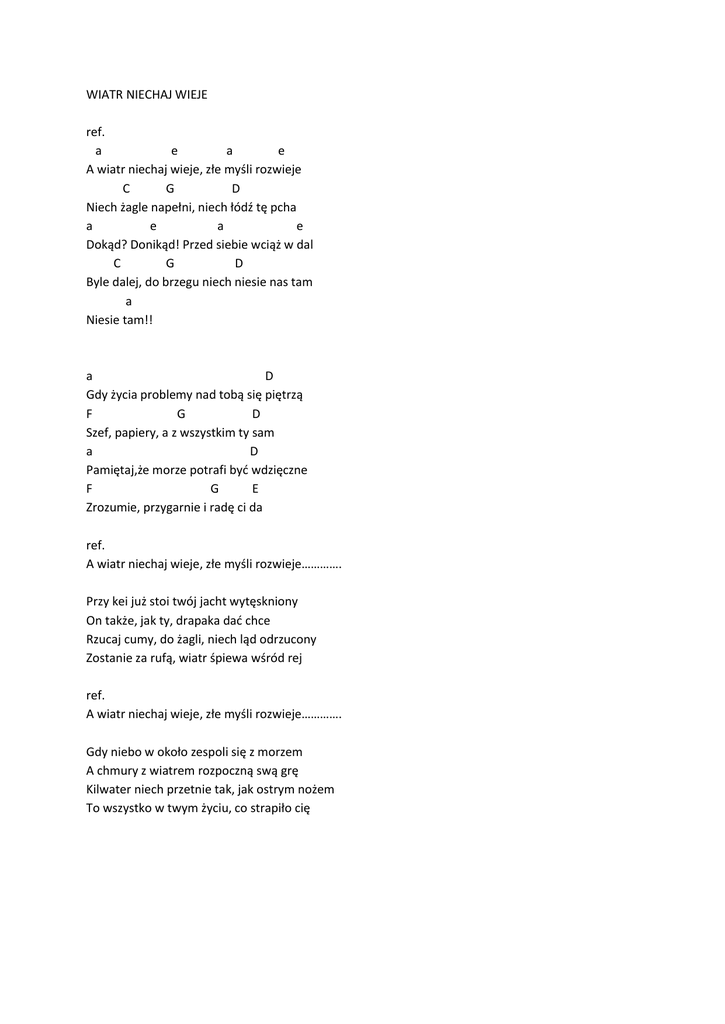 WIATR NIECHAJ WIEJE ref. a e a e A wiatr niechaj wieje, złe myśli rozwieje C G D Niech żagle napełni, niech łódź tę pcha a e a e Dokąd? Donikąd! Przed siebie wciąż w dal C G D Byle dalej, do brzegu niech niesie nas tam a Niesie tam!! a D Gdy życia problemy nad tobą się piętrzą F G D Szef, papiery, a z wszystkim ty sam a D Pamiętaj,że morze potrafi być wdzięczne F G E Zrozumie, przygarnie i radę ci da ref. A wiatr niechaj wieje, złe myśli rozwieje…………. Przy kei już stoi twój jacht wytęskniony On także, jak ty, drapaka dać chce Rzucaj cumy, do żagli, niech ląd odrzucony Zostanie za rufą, wiatr śpiewa wśród rej ref. A wiatr niechaj wieje, złe myśli rozwieje…………. Gdy niebo w około zespoli się z morzem A chmury z wiatrem rozpoczną swą grę Kilwater niech przetnie tak, jak ostrym nożem To wszystko w twym życiu, co strapiło cię