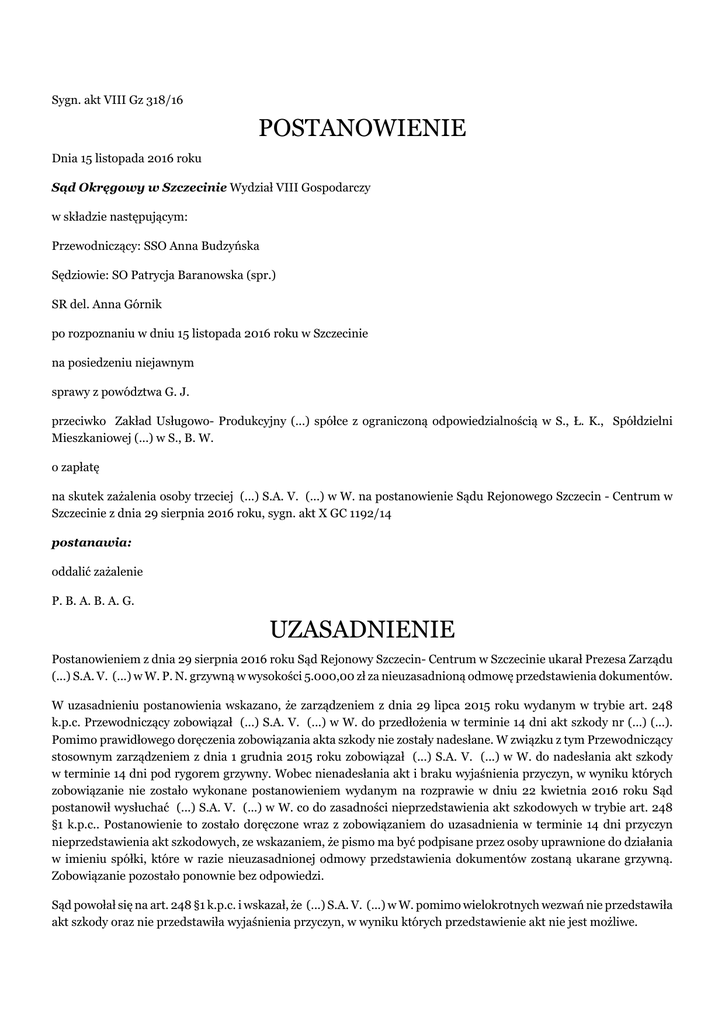 Sygn. akt VIII Gz 318/16 POSTANOWIENIE Dnia 15 listopada 2016 roku Sąd Okręgowy w Szczecinie Wydział VIII Gospodarczy w składzie następującym: Przewodniczący: SSO Anna Budzyńska Sędziowie: SO Patrycja Baranowska (spr.) SR del. Anna Górnik po rozpoznaniu w dniu 15 listopada 2016 roku w Szczecinie na posiedzeniu niejawnym sprawy z powództwa G. J. przeciwko Zakład Usługowo- Produkcyjny (...) spółce z ograniczoną odpowiedzialnością w S., Ł. K., Spółdzielni Mieszkaniowej (...) w S., B. W. o zapłatę na skutek zażalenia osoby trzeciej (...) S.A. V. (...) w W. na postanowienie Sądu Rejonowego Szczecin - Centrum w Szczecinie z dnia 29 sierpnia 2016 roku, sygn. akt X GC 1192/14 postanawia: oddalić zażalenie P. B. A. B. A. G. UZASADNIENIE Postanowieniem z dnia 29 sierpnia 2016 roku Sąd Rejonowy Szczecin- Centrum w Szczecinie ukarał Prezesa Zarządu (...) S.A. V. (...) w W. P. N. grzywną w wysokości 5.000,00 zł za nieuzasadnioną odmowę przedstawienia dokumentów. W uzasadnieniu postanowienia wskazano, że zarządzeniem z dnia 29 lipca 2015 roku wydanym w trybie art. 248 k.p.c. Przewodniczący zobowiązał (...) S.A. V. (...) w W. do przedłożenia w terminie 14 dni akt szkody nr (...) (...). Pomimo prawidłowego doręczenia zobowiązania akta szkody nie zostały nadesłane. W związku z tym Przewodniczący stosownym zarządzeniem z dnia 1 grudnia 2015 roku zobowiązał (...) S.A. V. (...) w W. do nadesłania akt szkody w terminie 14 dni pod rygorem grzywny. Wobec nienadesłania akt i braku wyjaśnienia przyczyn, w wyniku których zobowiązanie nie zostało wykonane postanowieniem wydanym na rozprawie w dniu 22 kwietnia 2016 roku Sąd postanowił wysłuchać (...) S.A. V. (...) w W. co do zasadności nieprzedstawienia akt szkodowych w trybie art. 248 §1 k.p.c.. Postanowienie to zostało doręczone wraz z zobowiązaniem do uzasadnienia w terminie 14 dni przyczyn nieprzedstawienia akt szkodowych, ze wskazaniem, że pismo ma być podpisane przez osoby uprawnione do działania w imieniu spółki, które w razie nieuzasadnionej odmowy przedstawienia dokumentów zostaną ukarane grzywną. Zobowiązanie pozostało ponownie bez odpowiedzi. Sąd powołał się na art. 248 §1 k.p.c. i wskazał, że (...) S.A. V. (...) w W. pomimo wielokrotnych wezwań nie przedstawiła akt szkody oraz nie przedstawiła wyjaśnienia przyczyn, w wyniku których przedstawienie akt nie jest możliwe. W związku z tym na podstawie art. 251 k.p.c. Sąd nałożył na prezesa zarządu (...) S.A. V. (...) w W. grzywnę w wysokości wynikającej z art. 163 §1 k.p.c.. Na powyższe postanowienie zażalenie wniosła (...) S.A. V. (...) w W.. Zaskarżyła postanowienie w całości, zarzucając wydanemu orzeczeniu naruszenie art. 251 w zw. z art. 248 §1 i 2, art. 261 §2 k.p.c. oraz art. 35 ust.1 ustawy o działalności ubezpieczeniowej i reasekuracyjnej poprzez skazanie na grzywnę za uchylanie się od przedstawienia dokumentu pomimo, że podmiot, od którego przedstawienia dokumentu żądano jest uprawniony do uchylenia się od obowiązku przedstawienia dokumentu wskazanego w art. 248 §1 k.p.c., a nadto nie jest w posiadaniu żądanego dokumentu. Skarżąca zarzuciła również naruszenie art. 35 ust.1 oraz ust.2 pkt 1 DzUbezpU poprzez brak udzielenia informacji co do niezbędności żądanego dokumentu dla toczącego się postępowania cywilnego. Skarżąca wniosła o uchylenie zaskarżonego postanowienia w całości. Wskazała, że dokumenty, których zażądał Sąd są objęte tajemnicą ubezpieczeniową określoną w art. 35 ust.1 DzUbezpU, stanowiącą istotną tajemnicę zawodową, o której mowa w art. 261 §2 k.p.c.. Powołała się na art. 248 §2 k.p.c. i podała, że jest uprawniona do uchylenia się od obowiązku przedstawienia dokumentu wskazanego w art. 248 §1 k.p.c. z uwagi na fakt, że jako świadek mogłaby odmówić odpowiedzi na zadane pytanie co do okoliczności objętej treścią żądanych dokumentów, z uwagi na możliwość pogwałcenia tajemnicy ubezpieczeniowej. Skarżąca dalej wskazała, powołując się na art. 35 ust.2 pkt 1 DzUbezpU, że informacje objęte tajemnicą ubezpieczeniową mogą zostać ujawnione sądowi lub prokuraturze jedynie jeśli są niezbędne w toczącym się postępowaniu. Skarżąca zarzuciła Sądowi, że ten, w żadnym z wydanych zarządzeń i postanowień nie wskazał, że uznaje przedmiotowy dokument za „niezbędny w toczącym się postępowaniu”. Wobec tego, że Sąd nie uzasadnił wystąpienia niezbędnej przesłanki wyłączenia tajemnicy ubezpieczeniowej, Towarzystwo było zobowiązane do jej zachowania, a wypełnienie nałożonego przez Sąd obowiązku przedstawienia żądanych akt szkodowych stałoby w sprzeczności z normą art. 35 ust.1 DzUbezpU, ze względu na niewskazanie przez Sąd na obligatoryjną przesłankę „niezbędności dla toczącego się postępowania”. Skarżąca wskazała, że niewskazanie przez Sąd na wystąpienie przesłanki z art. 35 ust.2 pkt 1 DzUbezpU, Towarzystwo było związane z art. 35 ust.1 DzUbezpU i miało podstawę (obowiązek) nieprzedstawienia żądanych przez Sąd dokumentów. Tak więc uznanie, że Towarzystwo w sposób nieuzasadniony odmówiło przedstawienia dokumentu jest błędne. Ponadto skarżąca podała, ze uchylenie się od obowiązku przedstawienia żądanych akt szkody uzasadnione jest faktem niemożności ich odnalezienia. Mimo podjęcia działań zmierzających do ustalenia miejsca położenia akt od razu po otrzymaniu pierwszego zarządzenia Sądu w przedmiotowej sprawie, do chwili obecnej nie udało się ich odnaleźć. Towarzystwo podało, że w latach 2012-2013 przechodziło proces centralizacji polegający na likwidacji oddziałów terenowych, co łączyło się z przemieszczeniem dużej ilości akt szkodowych w jednym czasie, w wyniku czego część akt szkodowych nie została prawidłowo zarchiwizowana. Towarzystwu nie udało się odnaleźć akt i w konsekwencji nie ma ono mo