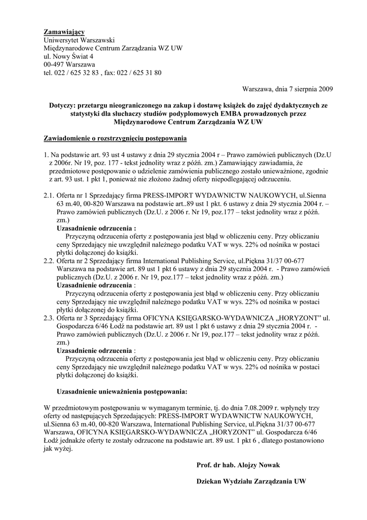 Zamawiający Uniwersytet Warszawski Międzynarodowe Centrum Zarządzania WZ UW ul. Nowy Świat 4 00-497 Warszawa tel. 022 / 625 32 83 , fax: 022 / 625 31 80 Warszawa, dnia 7 sierpnia 2009 Dotyczy: przetargu nieograniczonego na zakup i dostawę książek do zajęć dydaktycznych ze statystyki dla słuchaczy studiów podyplomowych EMBA prowadzonych przez Międzynarodowe Centrum Zarządzania WZ UW Zawiadomienie o rozstrzygnięciu postępowania 1. Na podstawie art. 93 ust 4 ustawy z dnia 29 stycznia 2004 r – Prawo zamówień publicznych (Dz.U z 2006r. Nr 19, poz. 177 - tekst jednolity wraz z późń. zm.) Zamawiający zawiadamia, że przedmiotowe postępowanie o udzielenie zamówienia publicznego zostało unieważnione, zgodnie z art. 93 ust. 1 pkt 1, ponieważ nie złożono żadnej oferty niepodlegającej odrzuceniu. 2.1. Oferta nr 1 Sprzedający firma PRESS-IMPORT WYDAWNICTW NAUKOWYCH, ul.Sienna 63 m.40, 00-820 Warszawa na podstawie art..89 ust 1 pkt. 6 ustawy z dnia 29 stycznia 2004 r. – Prawo zamówień publicznych (Dz.U. z 2006 r. Nr 19, poz.177 – tekst jednolity wraz z późń. zm.) Uzasadnienie odrzucenia : Przyczyną odrzucenia oferty z postępowania jest błąd w obliczeniu ceny. Przy obliczaniu ceny Sprzedający nie uwzględnił należnego podatku VAT w wys. 22% od nośnika w postaci płytki dołączonej do książki. 2.2. Oferta nr 2 Sprzedający firma International Publishing Service, ul.Piękna 31/37 00-677 Warszawa na podstawie art. 89 ust 1 pkt 6 ustawy z dnia 29 stycznia 2004 r. - Prawo zamówień publicznych (Dz.U. z 2006 r. Nr 19, poz.177 – tekst jednolity wraz z późń. zm.) Uzasadnienie odrzucenia : Przyczyną odrzucenia oferty z postępowania jest błąd w obliczeniu ceny. Przy obliczaniu ceny Sprzedający nie uwzględnił należnego podatku VAT w wys. 22% od nośnika w postaci płytki dołączonej do książki. 2.3. Oferta nr 3 Sprzedający firma OFICYNA KSIĘGARSKO-WYDAWNICZA „HORYZONT” ul. Gospodarcza 6/46 Łodź na podstawie art. 89 ust 1 pkt 6 ustawy z dnia 29 stycznia 2004 r. Prawo zamówień publicznych (Dz.U. z 2006 r. Nr 19, poz.177 – tekst jednolity wraz z późń. zm.) Uzasadnienie odrzucenia : Przyczyną odrzucenia oferty z postępowania jest błąd w obliczeniu ceny. Przy obliczaniu ceny Sprzedający nie uwzględnił należnego podatku VAT w wys. 22% od nośnika w postaci płytki dołączonej do książki. Uzasadnienie unieważnienia postępowania: W przedmiotowym postępowaniu w wymaganym terminie, tj. do dnia 7.08.2009 r. wpłynęły trzy oferty od następujących Sprzedających: PRESS-IMPORT WYDAWNICTW NAUKOWYCH, ul.Sienna 63 m.40, 00-820 Warszawa, International Publishing Service, ul.Piękna 31/37 00-677 Warszawa, OFICYNA KSIĘGARSKO-WYDAWNICZA „HORYZONT” ul. Gospodarcza 6/46 Łodź jednakże oferty te zostały odrzucone na podstawie art. 89 ust. 1 pkt 6 , dlatego postanowiono jak wyżej. Prof. dr hab. Alojzy Nowak Dziekan Wydziału Zarządzania UW