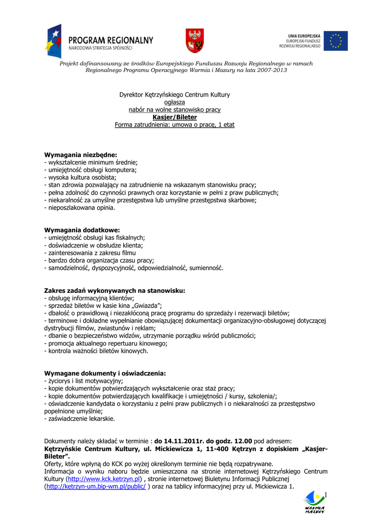 Projekt dofinansowany ze środków Europejskiego Funduszu Rozwoju Regionalnego w ramach Regionalnego Programu Operacyjnego Warmia i Mazury na lata 2007-2013 Dyrektor Kętrzyńskiego Centrum Kultury ogłasza nabór na wolne stanowisko pracy Kasjer/Bileter Forma zatrudnienia: umowa o pracę, 1 etat Wymagania niezbędne: - wykształcenie minimum średnie; - umiejętność obsługi komputera; - wysoka kultura osobista; - stan zdrowia pozwalający na zatrudnienie na wskazanym stanowisku pracy; - pełna zdolność do czynności prawnych oraz korzystanie w pełni z praw publicznych; - niekaralność za umyślne przestępstwa lub umyślne przestępstwa skarbowe; - nieposzlakowana opinia. Wymagania dodatkowe: - umiejętność obsługi kas fiskalnych; - doświadczenie w obsłudze klienta; - zainteresowania z zakresu filmu - bardzo dobra organizacja czasu pracy; - samodzielność, dyspozycyjność, odpowiedzialność, sumienność. Zakres zadań wykonywanych na stanowisku: - obsługę informacyjną klientów; - sprzedaż biletów w kasie kina „Gwiazda”; - dbałość o prawidłową i niezakłóconą pracę programu do sprzedaży i rezerwacji biletów; - terminowe i dokładne wypełnianie obowiązującej dokumentacji organizacyjno-obsługowej dotyczącej dystrybucji filmów, zwiastunów i reklam; - dbanie o bezpieczeństwo widzów, utrzymanie porządku wśród publiczności; - promocja aktualnego repertuaru kinowego; - kontrola ważności biletów kinowych. Wymagane dokumenty i oświadczenia: - życiorys i list motywacyjny; - kopie dokumentów potwierdzających wykształcenie oraz staż pracy; - kopie dokumentów potwierdzających kwalifikacje i umiejętności / kursy, szkolenia/; - oświadczenie kandydata o korzystaniu z pełni praw publicznych i o niekaralności za przestępstwo popełnione umyślnie; - zaświadczenie lekarskie. Dokumenty należy składać w terminie : do 14.11.2011r. do godz. 12.00 pod adresem: Kętrzyńskie Centrum Kultury, ul. Mickiewicza 1, 11-400 Kętrzyn z dopiskiem „KasjerBileter”. Oferty, które wpłyną do KCK po wyżej określonym terminie nie będą rozpatrywane. Informacja o wyniku naboru będzie umieszczona na stronie internetowej Kętrzyńskiego Centrum Kultury (http://www.kck.ketrzyn.pl) , stronie internetowej Biuletynu Informacji Publicznej (http://ketrzyn-um.bip-wm.pl/public/ ) oraz na tablicy informacyjnej przy ul. Mickiewicza 1. 1 Projekt dofinansowany ze środków Europejskiego Funduszu Rozwoju Regionalnego w ramach Regionalnego Programu Operacyjnego Warmia i Mazury na lata 2007-2013 Wymagane dokumenty : list motywacyjny oraz życiorys, powinny być opatrzone klauzulą: Wyrażam zgodę na przetwarzanie moich danych osobowych zawartych w ofercie pracy dla potrzeb niezbędnych do realizacji procesu rekrutacji zgodnie z ustawą z dnia 29 sierpnia 1997r. o ochronie danych osobowych ( Dz.U. z 2002r. Nr 101, poz. 926 z późń. zm. ) Miejsce pracy utworzone w ramach rezultatu projektu: „Modernizacja kina „Gwiazda” w Kętrzynie na potrzeby Kętrzyńskiego Centrum Kultury” Kętrzyn, dnia 28.10.2011r 2