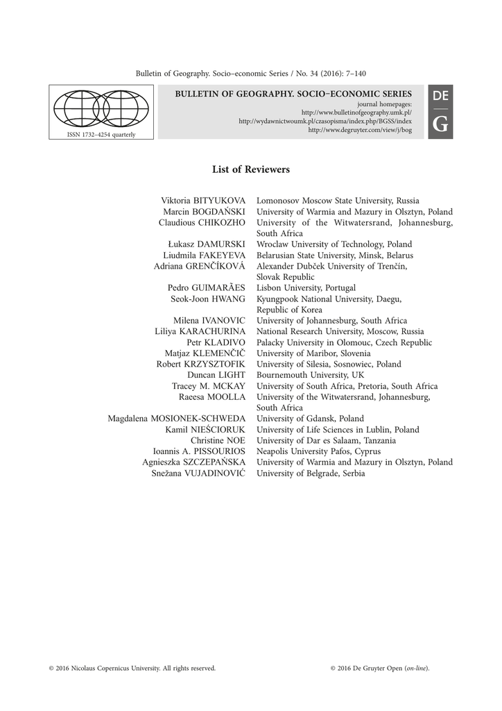 Bulletin of Geography. Socio–economic Series / No. 34 (2016): 7–140 BULLETIN OF GEOGRAPHY. SOCIO–ECONOMIC SERIES journal homepages: http://www.bulletinofgeography.umk.pl/ http://wydawnictwoumk.pl/czasopisma/index.php/BGSS/index http://www.degruyter.com/view/j/bog ISSN 1732–4254 quarterly DE G List of Reviewers Viktoria BITYUKOVA Marcin BOGDAŃSKI Claudious CHIKOZHO Łukasz DAMURSKI Liudmila FAKEYEVA Adriana GRENČÍKOVÁ Pedro GUIMARÃES Seok-Joon HWANG Milena IVANOVIC Liliya KARACHURINA Petr KLADIVO Matjaz KLEMENČIČ Robert KRZYSZTOFIK Duncan LIGHT Tracey M. MCKAY Raeesa MOOLLA Magdalena MOSIONEK-SCHWEDA Kamil NIEŚCIORUK Christine NOE Ioannis A. PISSOURIOS Agnieszka SZCZEPAŃSKA Snežana VUJADINOVIĆ © 2016 Nicolaus Copernicus University. All rights reserved. Lomonosov Moscow State University, Russia University of Warmia and Mazury in Olsztyn, Poland University of the Witwatersrand, Johannesburg, South Africa Wroclaw University of Technology, Poland Belarusian State University, Minsk, Belarus Alexander Dubček University of Trenčín, Slovak Republic Lisbon University, Portugal Kyungpook National University, Daegu, Republic of Korea University of Johannesburg, South Africa National Research University, Moscow, Russia Palacky University in Olomouc, Czech Republic University of Maribor, Slovenia University of Silesia, Sosnowiec, Poland Bournemouth University, UK University of South Africa, Pretoria, South Africa University of the Witwatersrand, Johannesburg, South Africa University of Gdansk, Poland University of Life Sciences in Lublin, Poland University of Dar es Salaam, Tanzania Neapolis University Pafos, Cyprus University of Warmia and Mazury in Olsztyn, Poland University of Belgrade, Serbia © 2016 De Gruyter Open (on-line).