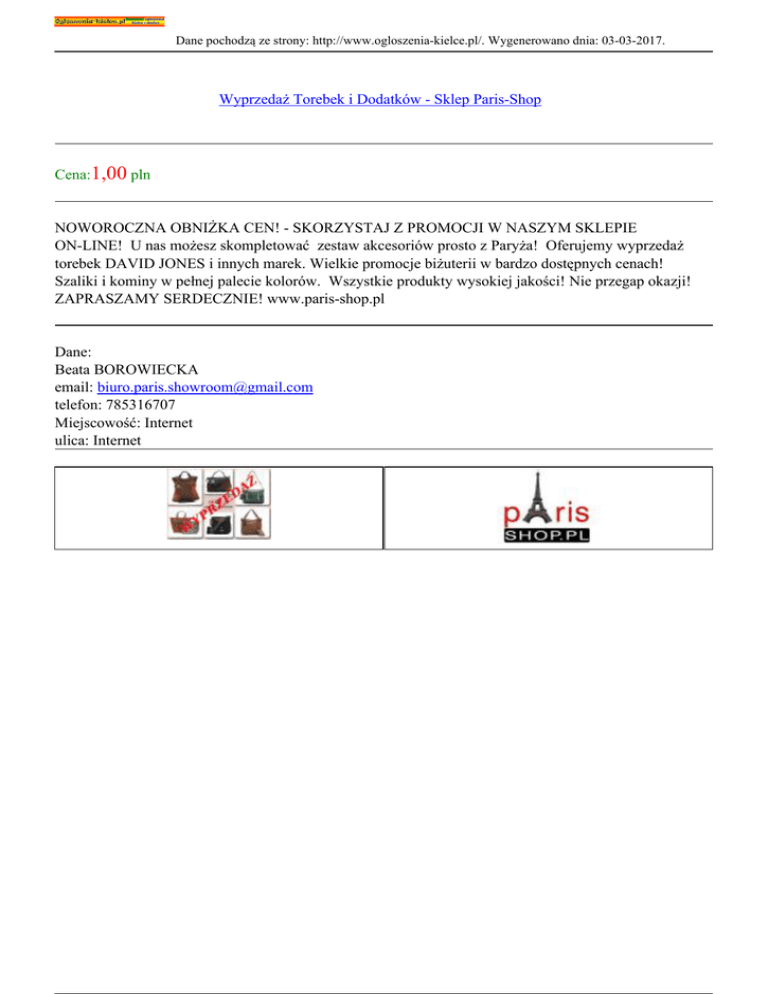 Dane pochodzą ze strony: http://www.ogloszenia-kielce.pl/. Wygenerowano dnia: 03-03-2017. Wyprzedaż Torebek i Dodatków - Sklep Paris-Shop Cena:1,00 pln NOWOROCZNA OBNIŻKA CEN! - SKORZYSTAJ Z PROMOCJI W NASZYM SKLEPIE ON-LINE! U nas możesz skompletować zestaw akcesoriów prosto z Paryża! Oferujemy wyprzedaż torebek DAVID JONES i innych marek. Wielkie promocje biżuterii w bardzo dostępnych cenach! Szaliki i kominy w pełnej palecie kolorów. Wszystkie produkty wysokiej jakości! Nie przegap okazji! ZAPRASZAMY SERDECZNIE! www.paris-shop.pl Dane: Beata BOROWIECKA email: [email protected] telefon: 785316707 Miejscowość: Internet ulica: Internet