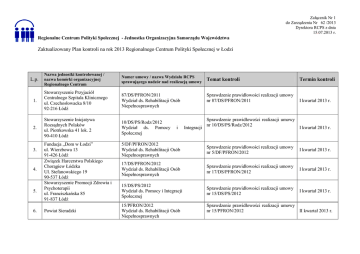 Załącznik Nr 1 do Zarządzenia Nr 62 /2013 Dyrektora RCPS z dnia 15.07.2013 r. Regionalne Centrum Polityki Społecznej - Jednostka Organizacyjna Samorządu Województwa Zaktualizowany Plan kontroli na rok 2013 Regionalnego Centrum Polityki Społecznej w Łodzi Nazwa jednostki kontrolowanej / nazwa komórki organizacyjnej Regionalnego Centrum Numer umowy / nazwa Wydziału RCPS sprawującego nadzór nad realizacją umowy Temat kontroli Termin kontroli 1. Stowarzyszenie Przyjaciół Centralnego Szpitala Klinicznego ul. Czechosłowacka 8/10 92-216 Łódź 87/DS/PFRON/2011 Wydział ds. Rehabilitacji Osób Niepełnosprawnych Sprawdzenie prawidłowości realizacji umowy nr 87/DS/PFRON/2011 I kwartał 2013 r. 2. Stowarzyszenie Inicjatywa Rozsądnych Polaków ul. Piotrkowska 41 lok. 2 90-410 Łódź 10/DS/PS/Rodz/2012 Wydział ds. Pomocy Społecznej L.p. 3. 4. 5. 6. Fundacja „Dom w Łodzi” ul. Wierzbowa 13 91-426 Łódź Związek Harcerstwa Polskiego Chorągiew Łódzka Ul. Stefanowskiego 19 90-537 Łódź Stowarzyszenie Promocji Zdrowia i Psychoterapii ul. Franciszkańska 85 91-837 Łódź Powiat Sieradzki i Integracji Sprawdzenie prawidłowości realizacji umowy nr 10/DS/PS/Rodz/2012 I kwartał 2013 r. 5/DF/PFRON/2012 Wydział ds. Rehabilitacji Osób Niepełnosprawnych Sprawdzenie prawidłowości realizacji umowy nr 5/DF/PFRON/2012 I kwartał 2013 r. 17/DS/PFRON/2012 Wydział ds. Rehabilitacji Osób Niepełnosprawnych Sprawdzenie prawidłowości realizacji umowy nr 17/DS/PFRON/2012 I kwartał 2013 r. 15/DS/PS/2012 Wydział ds. Pomocy i Integracji Społecznej Sprawdzenie prawidłowości realizacji umowy nr 15/DS/PS/2012 I kwartał 2013 r. 15/PFRON/2012 Wydział ds. Rehabilitacji Osób Niepełnosprawnych Sprawdzenie prawidłowości realizacji umowy nr 15/PFRON/2012 II kwartał 2013 r. 7. 8. Polskie Towarzystwo Oświaty Zdrowotnej Oddział Terenowy w Łodzi ul. Dowborczyków 15 lok. 11 90-019 Łódź Liga Kobiet Polskich Łódzki Oddział Wojewódzki w Łodzi ul. Legionów 2 90-401 Łódź 4/DS/HV/2012 Wydział ds. Uzależnień 14/DS/PS/Rodz/2012 Wydział ds. Pomocy i Integracji Społecznej 01/UM/ZAZ/2012 01/ZAZ/2008 - aneks nr 9 z dnia 29.11.2011 Wydział ds. Rehabilitacji Osób Niepełnosprawnych 9. Caritas Archidiecezji Łódzkiej ul. Gdańska 111 90 – 507 Łódź 10. Bank Żywności w Łodzi im. Marka 3/DF/PS/2012 Edelmana Wydział ds. Pomocy i Integracji ul. Piłsudskiego 150/152 Społecznej 92-230 Łódź 11. 12. 13. 14. Stowarzyszenie Samopomocy „Abakus” ul. Próchnika 5 90-408 Łódź Polskie Towarzystwo Stwardnienia Rozsianego Oddział Łódź ul. Przybyszewskiego 255/267 92-338 Łódź Fundacja dla Dzieci z Chorobami Nowotworowymi „Krwinka” ul. Rewolucji 1905 r. nr 9 90-273 Łódź Wydział Organizacyjny Sprawdzenie prawidłowości realizacji umowy nr 4/DS/HV/2012 Sprawdzenie prawidłowości realizacji umowy nr 14/DS/PS/Rodz/2012 Sprawdzenie prawidłowości realizacji umów 01/UM/ZAZ/2012 01/ZAZ/2008 - aneks nr 9 z dnia 29.11.2011 II kwartał 2013 r. II kwartał 2013 r. II kwartał 2013 r. Sprawdzenie prawidłowości realizacji umowy nr 3/DF/PS/2012 II kwartał 2013 r. 3/DS/A/2012 Wydział ds. Uzależnień Sprawdzenie prawidłowości realizacji umowy nr 3/DS/A/2012 07/R/DS/2012 Wydział ds. Rehabilitacji Osób Niepełnosprawnych Sprawdzenie prawidłowości realizacji umowy nr 07/R/DS/2012 III kwartał 2013 r. 13/R/DS/2013 Wydział ds. Rehabilitacji Osób Niepełnosprawnych Kontrola w trakcie realizacji umowy nr 13/R/DS/2013 Kontrola wewnętrzna Kontrola przestrzegania zasad gromadzenia i przetwarzania danych osobowych pracowników Regionalnego Centrum Polityki Społecznej w Łodzi w 2012 roku II kwartał 2013 r. III kwartał 2013 r. III kwartał 2013 r. 15. 16. 17. 18. Fundacja "Równe Szanse" ul. Wólczańska 225 93-005 Łódź Polskie Towarzystwo Stwardnienia Rozsianego Oddział w Sieradzu ul. Sienkiewicza 2 B lok. 15 98-200 Sieradz Fundacja „Gajusz” ul. Piotrkowska 17 90-406 Łódź Związek Harcerstwa Polskiego Chorągiew Łódzka dla Ośrodka Szkoleniowo – Wypoczynkowego „Nadwarciański Gród” Załęcze Wielkie 89 98-335 Pątnów 11/DF/PS/2012 Wydział ds. Pomocy i Integracji Społecznej Sprawdzenie prawidłowości realizacji umowy nr 11/DF/PS/2012 III kwartał 2013 r. 11/DS/PS/Rodz2012 Wydział ds. Pomocy i Integracji Społecznej Sprawdzenie prawidłowości realizacji umowy nr 11/DS/PS/Rodz/2012 III kwartał 2013 r. 1/DF/PS/2012 Wydział ds. Pomocy i Integracji Społecznej Sprawdzenie prawidłowości realizacji umowy nr 1/DF/PS/2012 III kwartał 2013 r. 2/DS/A/2012 Wydział ds. Uzależnień 19. Fundacja PHAROS ul. Braterska 3 98-220 Zduńska Wola 1/DF/A/2012 Wydział ds. Uzależnień 20. Łódzkie Towarzystwo Rodzin i Przyjaciół Dzieci Uzależnionych „Powrót z U” ul. Więckowskiego 13 90 – 721 Łódź 1/DS/N/2012 Wydział ds. Uzależnień 21. Konstantynowskie Stowarzyszenie Abstynentów „Nowe Kansas” ul. Piłsudskiego 3 Konstantynów Łódzki 1/DS/A/2013 Wydział ds. Uzależnień 22. Fundacja „Arka Nadziei” ul. Dzieci Polskich 41 A 97-200 Tomaszów Mazowiecki 4/DF/N//2012 Wydział ds. Uzależnień Sprawdzenie prawidłowości realizacji umowy nr 2/DS/A/2012 III kwartał 2013 r. Sprawdzenie prawidłowości realizacji umowy nr 1/DF/A/2012 IV kwartał 2013 r. Sprawdzenie prawidłowości realizacji umowy nr 1/DS/N/2012 IV kwartał 2013 r. Kontrola w trakcie realizacji umowy nr 1/DS/A/2013 IV kwartał 2013 r. Sprawdzenie prawidłowości realizacji umowy nr 4/DF/N/2012 IV kwartał 2013 r. 23. Fundacja Wspierania Zdrowia „eRka” ul. Bojowników Getta Warszawskiego 16/B 91-438 Łódź 3/DF/P/2012 Wydział ds. Uzależnień 24. Fundacja „Twój Poranek” ul. Długa 29 95-100 Zgierz 02/R/DF/2012 Wydział ds. Rehabilitacji Niepełnosprawnych 25. Mazowieckie Centrum Rozwoju Regionalnego w Rawie Mazowieckiej 10/DS/PS/Rodz/2013 Wydział ds. Pomocy i Integracji Społecznej Sprawdzenie prawidłowości realizacji umowy nr 3/DF/P/2012 Osób Sprawdzenie p