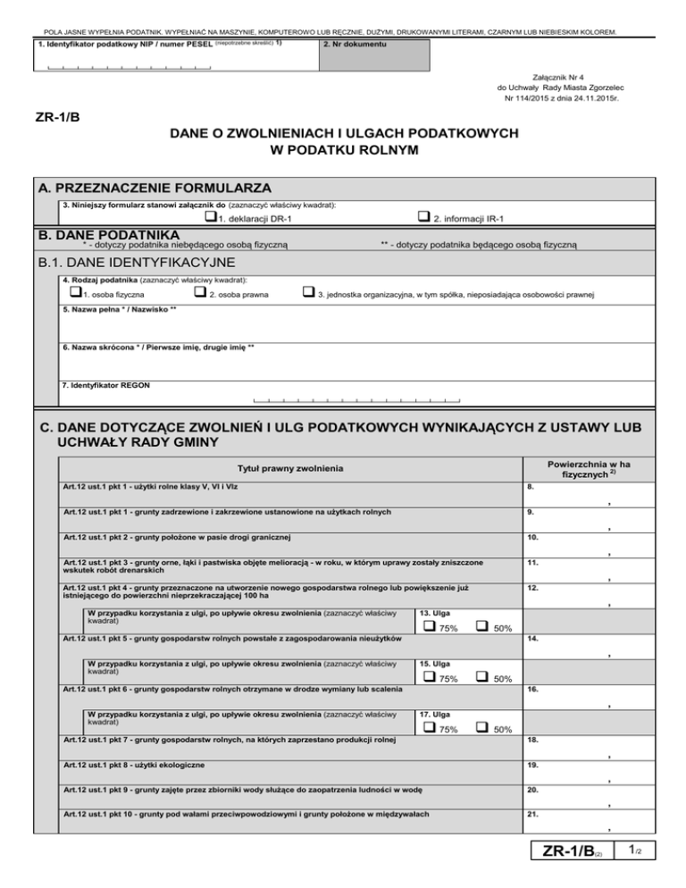POLA JASNE WYPEŁNIA PODATNIK. WYPEŁNIAĆ NA MASZYNIE, KOMPUTEROWO LUB RĘCZNIE, DUŻYMI, DRUKOWANYMI LITERAMI, CZARNYM LUB NIEBIESKIM KOLOREM. 1. Identyfikator podatkowy NIP / numer PESEL (niepotrzebne skreślić) 1) 2. Nr dokumentu Załącznik Nr 4 do Uchwały Rady Miasta Zgorzelec Nr 114/2015 z dnia 24.11.2015r. ZR-1/B DANE O ZWOLNIENIACH I ULGACH PODATKOWYCH W PODATKU ROLNYM A. PRZEZNACZENIE FORMULARZA 3. Niniejszy formularz stanowi załącznik do (zaznaczyć właściwy kwadrat): 1. deklaracji DR-1 B. DANE PODATNIKA * - dotyczy podatnika niebędącego osobą fizyczną 2. informacji IR-1 ** - dotyczy podatnika będącego osobą fizyczną B.1. DANE IDENTYFIKACYJNE 4. Rodzaj podatnika (zaznaczyć właściwy kwadrat): 1. osoba fizyczna 2. osoba prawna 3. jednostka organizacyjna, w tym spółka, nieposiadająca osobowości prawnej 5. Nazwa pełna * / Nazwisko ** 6. Nazwa skrócona * / Pierwsze imię, drugie imię ** 7. Identyfikator REGON C. DANE DOTYCZĄCE ZWOLNIEŃ I ULG PODATKOWYCH WYNIKAJĄCYCH Z USTAWY LUB UCHWAŁY RADY GMINY Powierzchnia w ha fizycznych 2) Tytuł prawny zwolnienia Art.12 ust.1 pkt 1 - użytki rolne klasy V, VI i VIz 8. Art.12 ust.1 pkt 1 - grunty zadrzewione i zakrzewione ustanowione na użytkach rolnych 9. Art.12 ust.1 pkt 2 - grunty położone w pasie drogi granicznej 10. Art.12 ust.1 pkt 3 - grunty orne, łąki i pastwiska objęte melioracją - w roku, w którym uprawy zostały zniszczone wskutek robót drenarskich 11. Art.12 ust.1 pkt 4 - grunty przeznaczone na utworzenie nowego gospodarstwa rolnego lub powiększenie już istniejącego do powierzchni nieprzekraczającej 100 ha 12. , , , W przypadku korzystania z ulgi, po upływie okresu zwolnienia (zaznaczyć właściwy kwadrat) , , 13. Ulga 75% 50% Art.12 ust.1 pkt 5 - grunty gospodarstw rolnych powstałe z zagospodarowania nieużytków 14. , W przypadku korzystania z ulgi, po upływie okresu zwolnienia (zaznaczyć właściwy kwadrat) 15. Ulga 75% 50% Art.12 ust.1 pkt 6 - grunty gospodarstw rolnych otrzymane w drodze wymiany lub scalenia 16. , W przypadku korzystania z ulgi, po upływie okresu zwolnienia (zaznaczyć właściwy kwadrat) 17. Ulga 75% 50% Art.12 ust.1 pkt 7 - grunty gospodarstw rolnych, na których zaprzestano produkcji rolnej 18. Art.12 ust.1 pkt 8 - użytki ekologiczne 19. Art.12 ust.1 pkt 9 - grunty zajęte przez zbiorniki wody służące do zaopatrzenia ludności w wodę 20. Art.12 ust.1 pkt 10 - grunty pod wałami przeciwpowodziowymi i grunty położone w międzywałach 21. , , , , ZR-1/B (2) 1/2 POLA JASNE WYPEŁNIA PODATNIK. WYPEŁNIAĆ NA MASZYNIE, KOMPUTEROWO LUB RĘCZNIE, DUŻYMI, DRUKOWANYMI LITERAMI, CZARNYM LUB NIEBIESKIM KOLOREM. Art.12 ust.1 pkt 11 - grunty wpisane do rejestru zabytków 22. Art.12 ust.1 pkt 12 - grunty stanowiące działki przyzagrodowe członków rolniczych spółdzielni produkcyjnych 23. Art.12 ust.1 pkt 13 - grunty położone na terenie rodzinnego ogrodu działkowego, z wyjątkiem będących w posiadaniu podmiotów innych niż działkowcy lub stowarzyszenia ogrodowe w rozumieniu ustawy dnia 13 grudnia 2013 r. o rodzinnych ogrodach działkowych 24. Art.12 ust.2 pkt 1 – uczelnie; zwolnienie nie dotyczy gruntów przekazanych w posiadanie podmiotom innym niż uczelnie 25. Art.12 ust.2 pkt 2 - publiczne i niepubliczne jednostki organizacyjne objęte systemem oświaty oraz prowadzące je organy, w zakresie gruntów zajętych na działalność oświatową 26. Art.12 ust.2 pkt 3 - instytuty naukowe i pomocnicze jednostki naukowe Polskiej Akademii Nauk, w odniesieniu do gruntów, które są niezbędne do realizacji zadań, o których mowa w art.2 ustawy z dnia 30 kwietnia 2010 r. o Polskiej Akademii Nauk 27. Art.12 ust.2 pkt 4 - prowadzący zakłady pracy chronionej spełniające warunek, o którym mowa w art.28 ust.1 pkt 1 lit. b ustawy z dnia 27 sierpnia 1997 r. o rehabilitacji zawodowej i społecznej oraz zatrudnianiu osób niepełnosprawnych, lub zakłady aktywności zawodowej - w zakresie gruntów zgłoszonych wojewodzie, jeżeli zgłoszenie zostało potwierdzone decyzją w sprawie przyznania statusu zakładu pracy chronionej lub zakładu aktywności zawodowej albo zaświadczeniem - zajętych na prowadzenie tego zakładu, z wyjątkiem gruntów znajdujących się w posiadaniu zależnym podmiotów niebędących prowadzącymi zakłady pracy chronionej spełniające warunek, o którym mowa w art.28 ust.1 pkt 1 lit. b ustawy z dnia 27 sierpnia 1997 r. o rehabilitacji zawodowej i społecznej oraz zatrudnianiu osób niepełnosprawnych lub zakłady aktywności zawodowej 28. Art.12 ust.2 pkt 5 - instytuty badawcze 29. Art.12 ust.2 pkt 5a - przedsiębiorcy o statusie centrum badawczo-rozwojowego uzyskanym na zasadach określonych w przepisach o niektórych formach wspierania działalności innowacyjnej w odniesieniu do przedmiotów opodatkowania zajętych na cele prowadzonych badań i prac rozwojowych 30. , , , , , , , , , D. DANE DOTYCZĄCE ULG PODATKOWYCH WYNIKAJĄCYCH Z USTAWY LUB UCHWAŁY RADY GMINY Tytuł prawny ulgi Art.13 ust.1 - ulga inwestycyjna 31. Art.13b ust.1 - ulga dla gruntów położonych na terenach podgórskich i górskich (zaznaczyć właściwy kwadrat) 32. Ulga tak nie 60% 30% Art.13c ust.1 - ulga z tytułu wprowadzenia stanu klęski żywiołowej 33. tak nie 1) Numer PESEL wpisują podatnicy będący osobami fizycznymi objętymi rejestrem PESEL, nieprowadzący działalności gospodarczej lub niebędący zarejestrowanymi podatnikami podatku od towarów i usług. Identyfikator podatkowy NIP wpisują pozostali podatnicy. 2) Należy podać z dokładnością do czterech miejsc po przecinku. ZR-1/B (2) 2/2