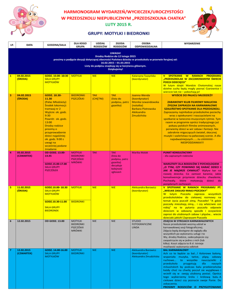 HARMONOGRAM WYDARZEŃ/WYCIECZEK/UROCZYSTOŚCI W PRZEDSZKOLU NIEPUBLICZNYM „PRZEDSZKOLNA CHATKA” LUTY 2015 R. GRUPY: MOTYLKI I BIEDRONKI LP. DATA GODZINA/SALA DLA KOGO GRUPA UDZIAŁ RODZICÓW ZGODA RODZICÓW OSOBA ODPOWIEDZIALNA WYDARZENIE UWAGA! Drodzy Rodzice do 12 lutego 2015 prosimy o podjęcie decyzji dotyczącej obecności Państwa dziecka w przedszkolu w przerwie feryjnej od: 16.02.2015 – 01.03.2015 Listy do podpisu znajdują się w korytarzu głównym. Dziękujemy! 1 04.02.2015 (ŚRODA) GODZ. 10.00- 10:30 SALA GRUPY MOTYLKÓW MOTYLKI NIE NIE Katarzyna Tuszyńska (koordynator) 3 04.02.2015 (ŚRODA) GODZ. 10.3011.30 (Pałac Młodzieży) Środek lokomocji: tramwaj nr 2 Wyjście: ok. godz. 9:30 Powrót: ok. godz. 13:00 Drodzy rodzice prosimy o przyprowadzenie dzieci najpóźniej ok. godz. 9:00 z uwagi na wcześniej podane śniadanie OD GODZ. 13.0014.45 BIEDRONKI PSZCZÓŁKI TAK (CHĘTNI) TAK (lista do podpisu, patrz gazetka) Joanna Wenda (koordynator) Monika Lewandowska (notatka) Barbara Piotrowska Aleksandra Zmudzińska TAK (lista do podpisu, patrz gazetka) decyduje kolejność zgłoszeń Marika Malak 4 05.02.2015 (CZWARTEK) MOTYLKI BIEDRONKI PSZCZÓŁKI MRÓWKI TAK GODZ.10.00- 10.30 SALA GRUPY MOTYLKÓW MOTYLKI NIE NIE Aleksandra Borowicz (koordynator) GODZ.10.30-11.00 BIEDRONKI GODZ.15.00-17.00 SALA GRUPY PSZCZÓŁEK 5 11.02.2015 (ŚRODA) SALA GRUPY BIEDRONEK 6 12.02.2015 OD GODZ. 13.00 MOTYLKI BIEDRONKI PSZCZÓŁKI MRÓWKI NIE NIE STUDIO FOTOGRAFICZNE LINDA 7 12.02.2015 (CZWARTEK) GODZ. 14.00-16.00 SALA GRUPY MOTYLKÓW MOTYLKI BIEDRONKI NIE NIE Aleksandra Borowicz (koordynator) Aleksandra Zmudzińska V SPOTKANIE W RAMACH PROGRAMU „PRZEDSZKOLAK W ZACZAROWANYM ŚWIECIE POEZJI DZIECIĘCEJ” W lutym dzięki Wandzie Chotomskiej nasze dzielne zuchy będą mogły poznać Czarownice i wierzcie lub nie – pokochają je! WYJŚCIE DO PAŁACU MŁODZIEŻY ZABAWOWY KLUB FILMOWY MALUCHA ZYGZAK ZAPRASZA NA KARNAWAŁOWE SZALEŃSTWO SPOTKANIE DLA PRZEDSZKOLI. Zapraszamy najmłodsze przedszkolne pociechy wraz z opiekunami i nauczycielami na spotkanie w taneczno-muzycznym rytmie. Tym razem w programie oprócz tradycyjnego już pokazu polskich filmów animowanych, porwiemy dzieci w wir zabaw i fantazji. Nie zabraknie migoczących świateł, skocznej muzyki i szaleństwa na pałacowej scenie. A dla najodważniejszych…….tu ciiiiiiiiiiiiiii NIESPODZIANKA!!! PUNKT KONSULTACYJNY - dla zapisanych rodziców WARSZTATY DLA RODZICÓW Z PSYCHOLOGIEM „O TYM, CZY POWINNO SIĘ KARAĆ DZIECI I JAK JE MĄDRZE CHWALIĆ” Wpływ kar na rozwój dziecka; Co zamiast karania; Jakie konsekwencje przyniesie dziecku chwalenie; Pochwały, które motywują dzieci do pożądanych zachowań. V SPOTKANIE W RAMACH PROGRAMU PT. „WIELKIE ZASŁUGI MAŁEJ PSZCZOŁY” W lutym Pszczoła zaprasza wszystkich przedszkolaków do ciekawej rozmowy na temat życia pszczół zimą. Pszczoło! "A gdzie pszczoły mieszkają zimą... i czy właściwie coś robią" na te pytania pszczoła odpowie dzieciom w zabawny sposób i oczywiście zaprosi do ulubionych zabaw i pląsów... wiecie dzieciaki jakich! Zapraszam Pszczoła ZDJĘCIA W STROJACH KARNAWAŁOWYCH Nasze przedszkolaki wezmą udział w karnawałowej sesji fotograficznej. Zdjęcia będą dostępne do wglądu dla wszystkich po wykonaniu usługi i to Wy, drodzy Rodzice, zadecydujecie czy zaopatrzycie się w jedno z nich (lub kilka). Koszt zdjęcia to 8 zł. Istnieje możliwość wykonania odbitek BAL KARNAWAŁOWY Ach co to będzie za bal...! Kolorowe balony, wspaniała muzyka, tańce, pląsy, zabawy ruchowe... to wszystko nauczycielki z przedszkola przygotują dla naszych milusińskich by podczas balu przebierańców każdy choć na chwilę poczuł sie wyjątkowo i wcielił się w swoją ulubioną postać. Oprócz tego wybierzemy króla i królową balu. A ciekawe dzieci czy poznacie swoje Panie. Do zobaczenia. PROSIMY RODZICÓW O PRZYGOTOWANIE WYMARZONEGO STROJU KARNAWAŁOWEGO DLA DZIECKA! 6 13.02.2015 (PIĄTEK) GODZ. 9.00-9.30 SALA GRUPY MOTYLKÓW MOTYLKI GODZ.9:30-10.00 SALA GRUPY MOTYLKÓW BIEDRONKI NIE NIE Katarzyna Torzewska Notatka p. Iwona Roszycka TEATRZYK W KOSZYCZKU „O dziadku, babci, przebiegłej lisicy i wilku” „Teatrzyk w koszyczku” nie jest to zwykły spektakl. Dzieci nie muszą siedzieć na widowni i grzecznie oglądać tego, co się dzieje na scenie. Mogą włączyć się w opowiadanie bajek. Dotknąć figurek, które „grają" w przedstawieniu. Funkcję sceny pełni stół, kurtyny - jedwabna zasłona. Rekwizyty zazwyczaj są własnoręcznie zrobione, lalki nie mają rysów twarzy, dekoracje są lekkie i zwiewne. Są też wyroby z gliny i dary natury. A najciekawsze jest to, że cały teatrzyk można zmieścić w koszyczku. SPOTKANIE WALENTYNKOWE W dniu Świętego Walentego zapraszamy przedszkolaków do udziału w zajęciach o tematyce związanej z miłością, szacunkiem i przyjaźnią. Nie zabraknie wspólnych zabaw i tańców w gronie przyjaciół z przedszkola. Wykonamy także kartki walentynkowe, którymi następnie obdarujemy innych. PROSIMY BY DZIECI W TYM DNIU UBRANE BYŁY NA CZERWONO. V SPOTKANIE W RAMACH PROGRAMU „PRZEDSZKOLAK W ZACZAROWANYM ŚWIECIE POEZJI DZIECIĘCEJ” W lutym dzięki Wandzie Chotomskiej nasze dzielne zuchy będą mogły poznać Czarownice i wierzcie lub nie – pokochają je! WARSZTATY DLA DZIECI I RODZICÓW PT. „MAKARONOWE DEKORACJE” 8 16.02.2015 (PONIEDZIAŁEK) GODZ. 11.30-12.15 SALA GRUPY MOTYLKÓW MOTYLKI BIEDRONKI NIE NIE Iwona Roszycka (koordynator) Katarzyna Tuszyńska 9 18.02.2015 (ŚRODA) GODZ. 10.30-11.00 SALA GRUPY BIEDRONEK BIEDRONKI NIE NIE Katarzyna Tuszyńska (koordynator) 10 18.02.2015 (ŚRODA) GODZ. 15.45- 16.30 SALA GRUPY PSZCZÓŁEK MOTYLKI BIEDRONKI PSZCZÓŁKI MRÓWKI TAK TAK (lista do podpisu, patrz gazetka) decyduje kolejność zgłoszeń Katarzyna Tuszyńska (koordynator) GODZ. 15.45- 16.30 SALA GRUPY PSZCZÓŁEK MOTYLKI BIEDRONKI PSZCZÓŁKI MRÓWKI TAK TAK (lista do podpisu, patrz gazetk