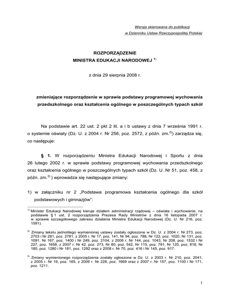 Wersja skierowana do publikacji w Dzienniku Ustaw Rzeczypospolitej Polskiej ROZPORZĄDZENIE MINISTRA EDUKACJI NARODOWEJ 1) z dnia 29 sierpnia 2008 r. zmieniające rozporządzenie w sprawie podstawy programowej wychowania przedszkolnego oraz kształcenia ogólnego w poszczególnych typach szkół Na podstawie art. 22 ust. 2 pkt 2 lit. a i b ustawy z dnia 7 września 1991 r. o systemie oświaty (Dz. U. z 2004 r. Nr 256, poz. 2572, z późn. zm.2)) zarządza się, co następuje: § 1. W rozporządzeniu Ministra Edukacji Narodowej i Sportu z dnia 26 lutego 2002 r. w sprawie podstawy programowej wychowania przedszkolnego oraz kształcenia ogólnego w poszczególnych typach szkół (Dz. U. Nr 51, poz. 458, z późn. zm.3) ) wprowadza się następujące zmiany: 1) w załączniku nr 2 „Podstawa programowa kształcenia ogólnego dla szkół podstawowych i gimnazjów”: 1) Minister Edukacji Narodowej kieruje działem administracji rządowej – oświata i wychowanie, na podstawie § 1 ust. 2 rozporządzenia Prezesa Rady Ministrów z dnia 16 listopada 2007 r. w sprawie szczegółowego zakresu działania Ministra Edukacji Narodowej (Dz. U. Nr 216, poz. 1591). 2) Zmiany tekstu jednolitego wymienionej ustawy zostały ogłoszone w Dz. U. z 2004 r. Nr 273, poz. 2703 i Nr 281, poz. 2781, z 2005 r. Nr 17, poz. 141, Nr 94, poz. 788, Nr 122, poz. 1020, Nr 131, poz. 1091, Nr 167, poz. 1400 i Nr 249, poz. 2104, z 2006 r. Nr 144, poz. 1043, Nr 208, poz. 1532 i Nr 227, poz. 1658, z 2007 r. Nr 42, poz. 273, Nr 80, poz. 542, Nr 115, poz. 791, Nr 120, poz. 818, Nr 180, poz. 1280 i Nr 181, poz. 1292 oraz z 2008 r. Nr 70, poz. 416 i Nr 145, poz. 917. 3) Zmiany wymienionego rozporządzenia zostały ogłoszone w Dz. U. z 2003 r. Nr 210, poz. 2041, z 2005 r. Nr 19, poz. 165, z 2006 r. Nr 228, poz. 1669 oraz z 2007 r. Nr 157, poz. 1100 i Nr 171, poz. 1211. 1 a) w dziale „Szkoła Podstawowa I i II Etap Edukacyjny” w części „II Etap Edukacyjny klasy IV – VI” w części dotyczącej przedmiotu „Język polski” pozycja „Lektura” otrzymuje brzmienie: „Lektura 1. Utwory zaproponowane przez uczniów i nauczyciela (dwie powieści lub dwa zbiory opowiadań w klasie IV oraz po trzy powieści lub trzy zbiory opowiadań w klasach V i VI). 2. Baśnie, legendy, opowiadania i utwory poetyckie, w tym pochodzące z regionu. 3. Fragmenty wybranych utworów polskiej i światowej klasycznej literatury dziecięcej i młodzieŜowej, przy systematycznym motywowaniu uczniów do samodzielnego poznawania całych utworów. 4. Teksty reprezentatywne dla źródeł kultury europejskiej. 5. Utwory prozatorskie i poetyckie wprowadzające w polską tradycję i współczesność literacką. 6. Teksty reprezentatywne dla róŜnych rodzajów, gatunków i form artystycznego wyrazu, ze szczególnym uwzględnieniem utworów epickich, w tym odmian prozy fabularnej (w szczególności powieści podróŜniczo - przygodowe, obyczajowe i fantastyczne). 7. Teksty uŜytkowe, publicystyczne, popularnonaukowe, przedstawienia teatralne, filmy, słuchowiska radiowe, programy telewizyjne. Lektura przykładowa: Carlo Collodi – Pinokio; Wiktor Gomulicki – Wspomnienia niebieskiego mundurka; Irena Jurgielewiczowa – Ten obcy; Rudyard Kipling - Księga DŜungli; Józef Ignacy Kraszewski – Stara Baśń; C.S. Lewis - Opowieści z Narnii, cz. I: Lew, Czarownica i stara szafa; Kornel Makuszyński – Szatan z siódmej klasy; Lucy Maud Montgomery - Ania z Zielonego Wzgórza; Edmund Niziurski – Sposób na Alcybiadesa; Henryk Sienkiewicz - W pustyni i w puszczy; Alfred Szklarski - Tomek w krainie kangurów; ks. Jan Twardowski - Zeszyt w kratkę; Mark Twain - Przygody Tomka Sawyera; Juliusz Verne – W 80 dni dookoła świata; Stanisław Lem – Bajki robotów. 2 Nauczyciel moŜe wybrać utwory niewymienione w wykazie „Lektura przykładowa”.”, b) w dziale „Gimnazjum III Etap Edukacyjny” w części dotyczącej przedmiotu „Język polski” pozycja „Lektura” otrzymuje brzmienie: „Lektura 1. Wybrane utwory z klasyki światowej: Biblia (fragmenty); mitologia (wybór); Homer - Iliada lub Odyseja (fragmenty); Sofokles - Antygona; Pieśń o Rolandzie (fragmenty); William Szekspir - Romeo i Julia; Miguel Cervantes - Don Kichote (fragmenty); Karol Dickens - Opowieść wigilijna lub Dawid Copperfield (fragmenty); Antoni Czechow - wybrana nowela; Antoine de Saint-Exupéry - Mały KsiąŜę lub Nocny lot; Ernest Hemingway wybrane opowiadanie. 2. Wybrane utwory z klasyki polskiej: Bogurodzica; Jan Kochanowski - wybrane fraszki, pieśni, psalmy i treny; wybór poezji barokowej; Ignacy Krasicki - wybrane bajki i jedna z satyr; Adam Mickiewicz - wybrane bajki i ballady, Dziady cz. II, Pan Tadeusz (fragmenty); Juliusz Słowacki - Balladyna (fragmenty); Aleksander Fredro Zemsta; Henryk Sienkiewicz – wybrana nowela; Bolesław Prus - wybrana nowela; Stefan śeromski - Syzyfowe prace, wybrana nowela. 3. Wybór liryki XIX wieku, wybór poezji XX wieku. 4. Wybór nowelistyki XIX i XX wieku (w tym co najmniej jeden utwór pozytywistyczny). 5. Wybrane utwory współczesnej prozy polskiej i dramatu. 6. Wybrane utwory o dorastaniu, w tym powieści dla młodzieŜy. 7. Przykłady pamiętnika, dziennika, korespondencji literackich, reportaŜu, w tym Aleksander Kamiński - Kamienie na szaniec; Miron Białoszewski - Pamiętnik z powstania warszawskiego (fragmenty). 8. Przykłady literatury regionalnej, wkład literatury regionalnej do ogólnopolskiej skarbnicy literackiej. 9. Wybrane z czasopism i prasy codziennej teksty publicystyczne, informacyjne i reklamowe. 3 10. Utwory zaproponowane przez uczniów i nauczyciela, w tym literatura popularna (co najmniej jeden utwór w kaŜdej klasie). 11. Inne składniki kultury (przedstawienia teatralne, filmy, słuchowiska radiowe, programy telewizyjne, przekazy ikoniczne, poezja śpiewana). Lektura przykładowa: Biblia (Pieśń nad Pieśniami, Hymn św. Pawła o miłości, Apokalipsa); Antoni Czechow - Śmierć urzędnika; E