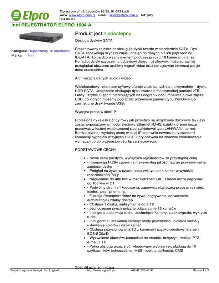 Elpro.com.pl: ul. Legionów 93/95, 91-072 Łódź www: www.elpro.com.pl e-mail: [email protected] tel: (42) 664-06-00 Inni REJESTRATOR ELPRO 1604 A Produkt jest niedostępny Obsługa dysków SATA Kategorie Rejestratory 16 kanałowe Marka Inni Prezentowany rejestrator obsługuje dyski twarde w standardzie SATA. Dyski SATA zapewniają szybszy zapis i dostęp do danych niż ich poprzednicy IDE/ATA. To bardzo ważny element podczas pracy z 16 kamerami na raz. Ponadto, dzięki szybszemu odczytowi danych użytkownik może sprawniej przeglądać obszerne archiwa nagrań video oraz odnajdować interesujące go dane audio/video. Archiwizacja danych audio i wideo Wielokanałowy rejestrator cyfrowy oferuje zapis danych na maksymalnie 1 dysku HDD SATA. Urządzenie obsługuje dyski twarde o maksymalnej pamięci 2TB. Łatwy i szybki eksport interesujących nas nagrań video umożliwiają dwa złącza USB, do których możemy podłączyć przenośne pamięci typu PenDrive lub zewnętrzne dyski twarde USB. Wydajna praca w sieci IP Profesjonalny rejestrator cyfrowy jak przystało na urządzenie dozorowe tej klasy został wyposażony w moduł sieciowy Ethernet RJ-45, dzięki któremu może pracować w każdej współczesnej sieci pakietowej typu LAN/WAN/Internet. Bardzo płynną i wydajną pracę w sieci IP zapewnia nowoczesny standard kompresji sygnałów wizyjnych H264, który pozwala na znaczne zredukowanie wymagań co do przepustowości łącza sieciowego. PODSTAWOWE CECHY: - Nowa seria prostych, wydajnych rejestratorów za przystępną cenę - Kompresja H.264 zapewnia maksymalną jakość nagrań przy minimalnej zajętości dysku - Podgląd na żywo w czasie rzeczywistym do 4 kamer w wysokiej rozdzielczości 720p - Nagrywanie do 400 kl/s w rozdzielczości CIF, 1 kanał może nagrywać do 100 kl/s w D1 - Podwójny strumień kodowania, zapewnia elastyczną pracę przez sieć, telefon, pda, iphone, itp. - Funkcja Pentaplex: obraz na żywo, nagrywanie, odtwarzanie, archiwizacja i zdalny dostęp - Obsługa 1 dysku, maksymalnie do 2 TB - Jednoczesne synchroniczne odtwarzanie 16 kanałów - Inteligentna detekcja ruchu: zasłonięcie kamery, zanik sygnału, wykrycie ruchu - Inteligentne ustawienia kamery: strefy prywatności, blokada kamery, ustawienie kolorów i nazw kamer - Obsługa pozycjonowania 3D z kamerami szybko-obrotowymi z serii BCS-SD0x/D - Wyzwalanie alarmów: komunikat na ekranie, brzęczyk, reakcja PTZ, e-mail, FTP - Pełna obsługa przez sieć: wbudowany web-server, obsługa do 10 użytkowników jednocześnie, MSS(mobilna aplikacja), CMS Projekt i wykonanie wydruku: Logisoft Specyfikacja techniczna http://www.logisoft.pl/ +48 42 235 41 51 Strona 1 z 2 Format kompresji Wejścia audio Prędkość zapisu wideo Wejścia alarmowe Porty Maksymalna liczba dysków twardych Detekcja ruchu Język oprogramowania Inteligentne pozycjonowanie głowic 3D Synchroniczne odtwarzanie wszystkich kanałów jednocześnie Maskowanie kamer LAN H.264 4 wejścia/1 wyjście 100kl/s w D1 (400kl/s w CIF) 16 wejść/1 wyjście 2 x USB 2.0, VGA, BNC 1 dysk twardy (max. 2TB) Tak Polski Tak Tak Tak Tak Wersja produktu Projekt i wykonanie wydruku: Logisoft Powered by TCPDF (www.tcpdf.org) Cena http://www.logisoft.pl/ +48 42 235 41 51 Strona 2 z 2