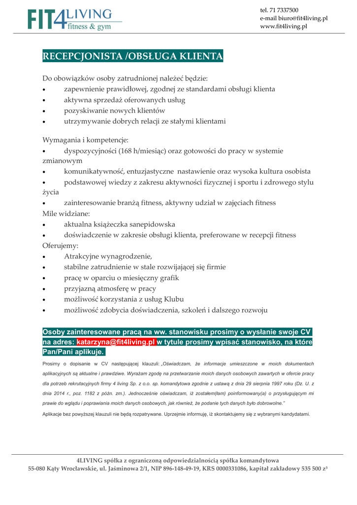 tel. 71 7337500 e-mail [email protected] www.fit4living.pl RECEPCJONISTA /OBSŁUGA KLIENTA Do obowiązków osoby zatrudnionej należeć będzie: zapewnienie prawidłowej, zgodnej ze standardami obsługi klienta aktywna sprzedaż oferowanych usług pozyskiwanie nowych klientów utrzymywanie dobrych relacji ze stałymi klientami Wymagania i kompetencje: dyspozycyjności (168 h/miesiąc) oraz gotowości do pracy w systemie zmianowym komunikatywność, entuzjastyczne nastawienie oraz wysoka kultura osobista podstawowej wiedzy z zakresu aktywności fizycznej i sportu i zdrowego stylu życia zainteresowanie branżą fitness, aktywny udział w zajęciach fitness Mile widziane: aktualna książeczka sanepidowska doświadczenie w zakresie obsługi klienta, preferowane w recepcji fitness Oferujemy: Atrakcyjne wynagrodzenie, stabilne zatrudnienie w stale rozwijającej się firmie pracę w oparciu o miesięczny grafik przyjazną atmosferę w pracy możliwość korzystania z usług Klubu możliwość zdobycia doświadczenia, szkoleń i dalszego rozwoju Osoby zainteresowane pracą na ww. stanowisku prosimy o wysłanie swoje CV na adres: [email protected] w tytule prosimy wpisać stanowisko, na które Pan/Pani aplikuje. Prosimy o dopisanie w CV następującej klauzuli: „Oświadczam, że informacje umieszczone w moich dokumentach aplikacyjnych są aktualne i prawdziwe. Wyrażam zgodę na przetwarzanie moich danych osobowych zawartych w ofercie pracy dla potrzeb rekrutacyjnych firmy 4 living Sp. z o.o. sp. komandytowa zgodnie z ustawą z dnia 29 sierpnia 1997 roku (Dz. U. z dnia 2014 r., poz. 1182 z późn. zm.). Jednocześnie oświadczam, iż zostałem(łam) poinformowany(a) o przysługującym mi prawie do wglądu i poprawiania moich danych osobowych, jak również, że podanie tych danych było dobrowolne.” Aplikacje bez powyższej klauzuli nie będą rozpatrywane. Uprzejmie informuję, iż skontaktujemy się z wybranymi kandydatami. 4LIVING spółka z ograniczoną odpowiedzialnością spółka komandytowa 55-080 Kąty Wrocławskie, ul. Jaśminowa 2/1, NIP 896-148-49-19, KRS 0000331086, kapitał zakładowy 535 500 z³