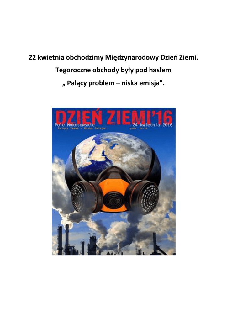 22 kwietnia obchodzimy Międzynarodowy Dzień Ziemi. Tegoroczne obchody były pod hasłem „ Palący problem – niska emisja”. W związku z obchodami Międzynarodowego Dnia Ziemi, 25 kwietnia 2016r. klasa Id zorganizowała uroczysty apel pod hasłem „Żyj z przyrodą zawsze w zgodzie”. Uczniowie przygotowali program słowno-muzyczny, w którym przypomnieli o konieczności ochrony przyrody i zasadach zachowania w czasie wycieczek i pikników na łonie natury. Leśne skrzaty, które dbają o czystość lasu, zachęciły dzieci do porządków. Przypomniały o szczególnych zasadach bezpieczeństwa i higieny w czasie sprzątania terenów zielonych. W ramach szkolnych obchodów Dnia Ziemi został zorganizowany konkurs plastyczny na najbardziej pomysłową zabawkę z odpadów – surowców wtórnych. W konkursie, w klasach 1-3, wzięło udział 60 uczniów. Wszystkie prace zostały zaprezentowane w czasie szkolnej wystawy. 17 uczniów otrzymało dyplom i nagrodę, a pozostałe osoby wyróżnienia za udział w konkursie. Uczniowie, którzy przygotowali prace na konkurs wykazali się ogromną pomysłowością i talentem. Często w przygotowanie prac zostały włączone całe rodziny. Wielkie podziękowania kierujemy do uczniów i osób zaangażowanych w tworzenie małych arcydzieł. Nasi uczniowie udowodnili, że „NASZE DZIECI, POTRAFIĄ BUDOWAĆ ZABAWKI ZE ŚMIECI”.