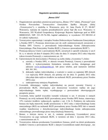 Regulamin sprzedaży premiowej „Bonus 15%” 1. Organizatorem sprzedaży premiowej pod nazwą „Bonus 15%” (dalej „Promocja”) jest Nordea Powszechne Towarzystwo Emerytalne Spółka Akcyjna (dalej „Towarzystwo”), z siedzibą w Warszawie, przy Al. Jana Pawła II 27, 00-867 Warszawa, wpisana do rejestru przedsiębiorców przez Sąd dla m.st. Warszawy w Warszawie, XII Wydział Gospodarczy Krajowego Rejestru Sądowego pod nr KRS 0000010345, NIP: 521-29-76-286, kapitał zakładowy w wysokości 252 308 034 zł (w całości wpłacony). 2. Towarzystwo reprezentuje i zarządza Nordea Dobrowolnym Funduszem Emerytalnym („Nordea DFE”). Promocja skierowana jest do osób zainteresowanych zawarciem z Nordea DFE Umowy o prowadzenie Indywidualnego Konta Zabezpieczenia Emerytalnego, Plan Emerytalny Nordea IKZE („Umowa o prowadzenie IKZE”). 3. Promocja dotyczy Umów o prowadzenie IKZE, zawartych w sposób wskazany w ust.4 lit. a, w okresie od dnia 9 sierpnia 2012 roku do dnia 31 sierpnia 2012 roku włącznie (okres trwania Promocji), z zastrzeżeniem ust. 10. 4. Uprawnionymi do skorzystania z Promocji są osoby (dalej „Uczestnicy”), które: a. zawarły z Nordea DFE, w okresie trwania Promocji, Umowę o prowadzenie IKZE, z wykorzystaniem formularza wniosku on-line, dostępnego pod adresem www.nordeapolska.pl, lub przez telefon, pod numerem infolinii 801 301 301, b. dokonały wpłaty indywidualnej, o wartości w sumie co najmniej 400 złotych i co najwyżej 4030 złotych, nie później niż do dnia 31 grudnia 2012 roku (decyduje data wpływu środków na rachunek IKZE, prowadzony przez Nordea DFE) oraz c. zaakceptowany niniejszy Regulamin. 5. Uczestnik, dokonujący wpłaty indywidualnej na poczet zawartej Umowy o prowadzenie IKZE, obowiązany jest dostosować wysokość wpłaty do jego indywidualnego limitu wpłat, wynikającego z powszechnie obowiązujących przepisów prawa. 6. Uczestnik, który spełnił wszystkie warunki wskazane w ust. 4 otrzyma w ramach Promocji, na swój rachunek IKZE prowadzony przez Nordea DFE bonus, stanowiący 15% wartości środków wpłaconych, zgodnie z ust. 4 lit. b. Podstawy do naliczenia bonusa nie będą stanowiły środki przeniesione w 2012 roku z indywidualnego konta emerytalnego (IKE) na rachunek IKZE prowadzony przez Nordea DFE lub w ramach wypłaty transferowej z dotychczasowego indywidualnego konta zabezpieczenia emerytalnego, prowadzonego przez inną instytucję finansową. 7. Bonus, o którym mowa w ust. 6, zostanie przekazany Uczestnikowi przez Towarzystwo na jego rachunek IKZE, w terminie od dnia 1 stycznia 2013 roku, z zastrzeżeniem ust. 8. 8. Towarzystwo dokona przekazania Uczestnikowi bonusa, jeżeli na dzień przekazania środków Umowa o prowadzenie IKZE z danym Uczestnikiem nadal obowiązuje , nie została wypowiedziana przez żadną ze Stron Umowy o prowadzenie IKZE, ani Uczestnik nie odstąpił od Umowy o prowadzenie IKZE. 9. Uczestnik, biorący udział w Promocji, wyraża zgodę na przetwarzanie jego danych osobowych w celach związanych z realizacją Promocji, zgodnie z powszechnie obowiązującymi w tym zakresie przepisami prawa. 10. Towarzystwo może zmieniać okres trwania Promocji. 11. Regulamin niniejszy stanowi całość regulacji dotyczących organizacji i realizacji Promocji, jak również praw i obowiązków Towarzystwa lub Uczestnika, wynikających z Promocji. Wszelkie inne materiały pochodzące od Towarzystwa, stanowią jedynie treści marketingowe. 12. Niniejszy Regulamin dostępny jest na stronie www.nordeapolska.pl. Z dniem 16 sierpnia 2012 roku zmianie uległa nazwa Promocji z „Gwarantowane 15” na „Bonus 15”. Pozostałe postanowienia Regulaminu nie uległy zmianie. 13. W sprawach nieuregulowanych niniejszym Regulaminem mają zastosowanie powszechnie obowiązujące przepisy prawa.