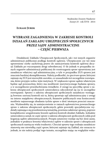 67 Studenckie Zeszyty Naukowe Zeszyt 25 ∙ rok XVII ∙ 2014 Łukasz Jurek Wybrane zagadnienia w zakresie kontroli działań Zakładu Ubezpieczeń Społecznych przez sądy administracyjne – część pierwsza Działalność Zakładu Ubezpieczeń Społecznych, jak i też innych organów administracji publicznej podlega kontroli sądowej. Ubezpieczeni czy też inne uprawnione osoby zachowują prawo do zainicjowania kontroli sądowej decyzji Zakładu po wyczerpaniu drogi odwoławczej. O ile jednak w przypadku innych organów administracji publicznej do rozstrzygania spraw uprawniony jest zasadniczo właściwy sąd administracyjny, o tyle w przypadku ZUS sprawa jest znacznie bardziej skomplikowana. Należy podkreślić, że spectrum spraw, którymi zajmuje się ZUS jest niezwykle szerokie, co uzasadniało też szczególnie rozwiązania, które przyjęto wobec tejże instytucji. W większości spraw sądem właściwym będzie sąd powszechny, który ma możliwość merytorycznego badania sprawy, a w szczególności przesłuchiwania świadków. Z uwagi na specyfikę spraw z zakresu ubezpieczeń społecznych ustawodawca zdecydował się na to szczególne rozwiązanie. Sprawy z zakresu ubezpieczeń społecznych zasadniczo wymagają bowiem szerszej kontroli niż ta, którą sprawuje sąd administracyjny z uwagi na interes majątkowy ubezpieczonych, finansów publicznych oraz konieczność możliwie najszerszego zbadania tychże spraw o dość istotnym przecież znaczeniu. Wydawałoby się, że umiejscowienie w ramach sądownictwa powszechnego spraw z zakresu ubezpieczeń społecznych, gdzie powstały specjalistyczne wydziały zajmujące się przedmiotową tematyką, powinno załatwiać sprawę, poprzez kompleksowe uregulowanie kwestii sądowej kontroli działań Zakładu. Jednakże ustawodawca uznał, że część spraw z zakresu ubezpieczeń społecznych odda pod kognicję sądów administracyjnych. Przepis ustawowy wydaje się być dość jasny, jednakże w praktyce kwestia właściwości sądów w zakresie spraw z ubezpieczeń społecznych nastręcza wielu trudności. Chociaż sprawy tego rodzaju zasadniczo stanowią one niewielką część spraw, którymi zajmuje się Zakład, nie oznacza to jednak, że nie należy podjąć tego tematu, szczególnie mając na względzie wska- 68 zane wyżej uwarunkowania. Celem artykułu jest ukazanie zakresu sprawowanej kontroli przez sądy administracyjne nad działaniami ZUS oraz zasad na jakich jest ona wykonywana, ze szczególnym uwzględnieniem węzłowych zagadnień problemowych w tym zakresie. Wskazane zagadnienie nie było dotychczas szerzej omawiane w literaturze przedmiotu, co przesądza też o pionierskim charakterze tejże pracy. Należy jednakże wyraźnie podkreślić, że nie aspiruje ona do całościowego rozwiązania omawianej kwestii, ma jedynie za zadanie wprowadzić czytelnika w ogólne zagadnienia związane z omawianą problematyką. Aby wyraźnie oddzielić sprawy z zakresu ubezpieczeń społecznych podlegających rozpoznaniu przez sądy powszechne od spraw tego rodzaju rozpoznawanych przez sądy administracyjne należy na wstępie odwołać się do art. 83b u.s.u.s. Przepis ten stanowi, że w przypadkach, w których przepisy Kodeksu postępowania administracyjnego przewidują wydanie postanowienia kończącego postępowanie w sprawie ZUS wydaje decyzję. Na innego rodzaju postanowienia zażalenie nie przysługuje. Należy w pełni podzielić argumentację WSA w Warszawie, który słusznie dostrzegł że powołany wyżej przepis nie określa właściwości ZUS, ,,lecz ma na celu tylko wskazanie bądź odmiennej formy jego działania, polegającej na wydawaniu decyzji w miejsce postanowień kończących postępowanie w sprawie przewidzianych w k.p.a., bądź pozbawienie przymiotu zaskarżalności innych postanowień wydawanych przez Zakładu, które na gruncie k. p.a. byłyby zaskarżalne w drodze zażalenia. Zawiera zatem wyłącznie modyfikacje stricte procesowe w stosunku do regulacji przewidzianych w k.p.a. w tym zakresie”. Celem wskazanej regulacji było wyjęcie większości spraw z ubezpieczeń społecznych spod kognicji sądów administracyjnych i przekazanie ich do rozpoznania sądów powszechnych. Gdyby nie cytowany przepis art. 83b ustawy systemowej, na każde postanowienie, nie tylko te kończące postępowanie w sprawie, służyłoby zażalenie do właściwego wojewódzkiego sądu administracyjnego. Brzmienie przepisu wskazuje zatem jednoznacznie, że ustawodawca chciał tego uniknąć. W artykule 83 ust. 1 u.s.u.s. ustawodawca wskazał przypadki, w których ZUS wydaje decyzję. Dotyczy to w szczególności zgłaszania do ubezpieczeń społecznych, przebiegu ubezpieczeń, ustalania wymiaru składek i ich poboru, a także umarzania należności z tytułu składek, ustalania wymiaru składek na Fundusz Emerytur Pomostowych i ich poboru, a także umarzania należności z tytułu tych składek, ustalania uprawnień do świadczeń z ubezpieczeń społecznych oraz ustalania wymiaru świadczeń z ubezpieczeń społecznych. Ustawodawca wskazał przy tym wyraźnie w ustępie drugim powołanego wyżej przepisu, że od decyzji przysługuje odwołanie do właściwego sądu powszechne Wyrok WSA w Warszawie z dnia 18 sierpnia 2006 r., III SA/Wa 1471/06, LEX nr 282445. 69 go, jednocześnie odesłał w zakresie terminu oraz zasad na jakich należy wnieść odwołanie do przepisów Kodeksu postępowania cywilnego. Jak już wspomniano wyżej, co jest przedmiotem niniejszej pracy, ustawodawca wyodrębnił także w art. 83 ust. 4 u.s.u.s. te przypadki, w których właściwym będzie sąd administracyjny. Zgodnie z cytowanym przepisem od decyzji przyznającej świadczenie w drodze wyjątku, od decyzji odmawiającej przyznania takiego świadczenia oraz od decyzji w sprawach o umorzenie należności z tytułu składek na ubezpieczenie społeczne odwołanie nie przysługuje. Strona zachowuje natomiast prawo do wniesienia wniosku do Prezesa ZUS 