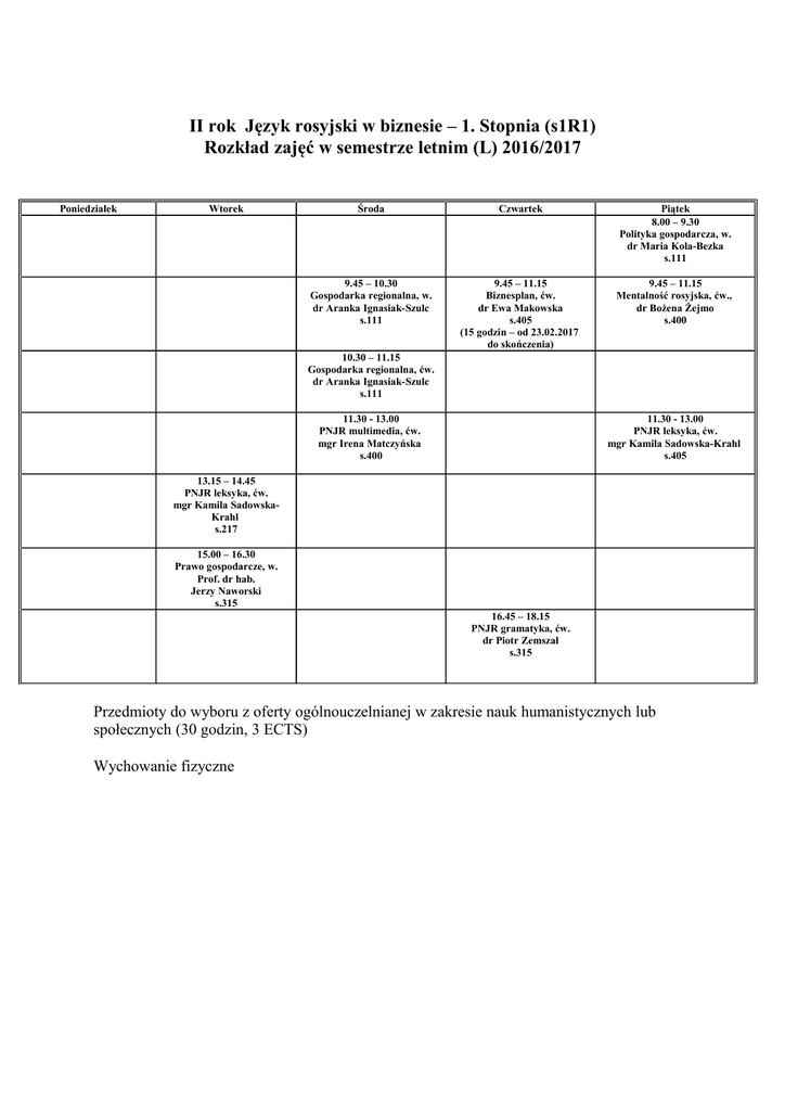 II rok Język rosyjski w biznesie – 1. Stopnia (s1R1) Rozkład zajęć w semestrze letnim (L) 2016/2017 Poniedziałek Wtorek Środa Czwartek Piątek 8.00 – 9.30 Polityka gospodarcza, w. dr Maria Kola-Bezka s.111 9.45 – 10.30 Gospodarka regionalna, w. dr Aranka Ignasiak-Szulc s.111 9.45 – 11.15 Biznesplan, ćw. dr Ewa Makowska s.405 (15 godzin – od 23.02.2017 do skończenia) 9.45 – 11.15 Mentalność rosyjska, ćw., dr Bożena Żejmo s.400 10.30 – 11.15 Gospodarka regionalna, ćw. dr Aranka Ignasiak-Szulc s.111 11.30 - 13.00 PNJR multimedia, ćw. mgr Irena Matczyńska s.400 11.30 - 13.00 PNJR leksyka, ćw. mgr Kamila Sadowska-Krahl s.405 13.15 – 14.45 PNJR leksyka, ćw. mgr Kamila SadowskaKrahl s.217 15.00 – 16.30 Prawo gospodarcze, w. Prof. dr hab. Jerzy Naworski s.315 16.45 – 18.15 PNJR gramatyka, ćw. dr Piotr Zemszał s.315 Przedmioty do wyboru z oferty ogólnouczelnianej w zakresie nauk humanistycznych lub społecznych (30 godzin, 3 ECTS) Wychowanie fizyczne