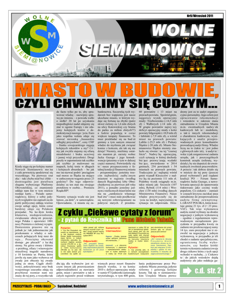 Kiedy sięga się po kolejny numer Nowych Siemianowic można z cała pewnością spodziewać się wszystkiego. Na pierwszy rzut oka – taki chyba miał być efekt – dostrzegalna jest parafraza sloganu wyborczego Platformy Obywatelskiej, co znamiennie oddaje nam kto w tym mieście rozdaje karty… Pseudo samorządowcy, którzy z sobie jedynych względów nie zapisali się do partii politycznej oddają wiernie swoje usługi opcji, która coraz bardziej zdaje się Polakom przejadać. Na każdym kroku kłamstwa, niedopowiedzenia, zwiększanie obciążeń przeciętnego Polaka i opowieści 1001 nocy Premiera o zielonej wyspie. Doniesienia prasowe nie są jednak już tak jednoznaczne jak przekonanie o władzy o sukcesach pchających kraj nasz do raju… Przeciętny obywatel dostaje „po plecach” z każdej strony. Na górze swary i kłótnie o przebieg, ofiary i winowajców straszliwej tragedii narodowej z 10 kwietnia ur. Partia, która jawiła się nam jako wybawca od zwady jest obecnie tej zwady jedną ze stron. Ciągłe złośliwości, pokrzykiwania oraz brak wzajemnego szacunku zdają się przybierać rozmiar nam nie znany do tej pory, a wszystko tak de facto tylko po to, aby sprawować władzę – nazwijmy sprawę po imieniu – z powodu walki o stołki! 20 lat po uzyskaniu niepodległości nadal zdajemy się stać w ogonie Europy i nie zdajemy kolejnych testów z demokratyzacji naszego życia. Euro jako wspólna waluta zdaje się stawać mrzonką „baaaardzo odległej przyszłości”, ceny CHF – franka szwajcarskiego sięgają kolejnych rekordów a my? Cóż my jak zwykle stajemy się ofiarą nieudolności i braku uczciwej i jasnej wizji przyszłości. Drogi poszły w zapomnienie tak szybko jak szybko je malowano na mapach, kolej tonie w długach i kolejnych absurdach – bo jak można nazwać podróż pociągiem nad morze ze Śląska na stojąco w zatłoczonym wagonie przez 23 godziny? Do tego odpowiedzialny za ten stan ma swojego protektora w osobie… Premiera Rządu RP! Niestety sytuacja wcale nie jest lepsza „na dole”, w samorządzie. Opowiadanie, że miasta się za- Pytanie: 1. Czy Pan Prezydent nie uważa za niestosowne, że w tak biednym mieście Prezes Spółki komunalnej Aqua Sprint, w małym miasteczku pośrodku konurbacji śląskiej zarabia rocznie 274.293 zł, a dyrektor finansowy spółki w 100% komunalnej 249.656 zł, to jest rok w rok tylko dwóch pracowników tej spółki za- bankructwa. Soczewką tych wydarzeń bez wątpienia jest nasze ukochane miasto, w którym wydaje się fortunę na zbytki (patrz skwer zielony za 1,6 mln złotych na ulicy Katowickiej czy brama do parku za milion złotych!!!) a ludzie popadają w coraz większe tarapaty finansowe. To musi przekładać się na budżet gminny a tym samym zmuszać władze do myślenia jak związać koniec z końcem, ale tak się nie dzieje! Niestety, mieliśmy ostatnio maraton pt. zarzuty wobec Jacka Guzego i jego konsekwencje (piszemy o tym w dalszej części numeru). Potwierdziły się też nasze przypuszczenia o fatalnej kondycji finansowej miasta – przypomnijmy: jesteśmy trzecim najbardziej zadłużonym miastem w regionie (według danych Regionalnej Izby Obrachunkowej za pierwsze pół roku 2011), a ponadto jesteśmy jednym z nielicznych miast które nie ma na „zamkniecie własnego budżetu” i musi stale posiłkować się nowymi zobowiązaniami na pokrycie starych. Z przedsta- rabia ponad pół miliona złotych rocznie? Czyli i jeden i drugi zarabia więcej niż PREMIER RP oraz Prezydent RP??? Odpowiedź: „Nie, prezydent Siemianowic Śląskich nie uważa, żeby odpowiednie płacenie fachowcom za ich prace było błędem.” dłużają dla wyborców jest niczym innym jak przerzucaniem odpowiedzialności za stawianie gmin, miast i powiatów a także całych regionów przed widmem Komentarze internautów: Hypnos: „Trzeba jeszcze umieć odróżnić fachowca od cwaniaczka...” siemce2: „…a płacenie fachowcom, z papierami i wykształceniem zdobytym w trybie dziennym w wieku lat 19-24 (nie 60 powiatów i 13 miast na prawach powiatu. Spośród gmin, najgorszy wynik operacyjny miały: Trzebownisko (-14,5 mln zł) i Wałbrzych (-14 mln zł). W grupie powiatów najwyższy deficyt operacyjny miały z kolei powiaty biłgorajski (-10,9 mln zł) i lubiński (-7,9 mln zł), a wśród miast na prawach powiatu: Lublin (-25,5 mln zł) i Piekary Śląskie (-20 mln zł). Miasto Siemianowice Śląskie niestety znalazło się również na tej "czarnej liście". Nadwyżkę operacyjną, czyli sytuację w której dochody bieżące przewyższają wydatki bieżące, stwierdzono w 2014 gminach, 254 powiatach i 54 miastach na prawach powiatu. Tradycyjnie już najlepiej wśród gmin wypadł Kleszczów z nadwyżką na poziomie 111 mln zł. Podobny wynik osiągnęły m.in. takie miasta jak: Szczecin (107 mln), Rybnik (114 mln) i Wrocław (130 mln) (według danych Ministerstwa Finansów). Nasze władze przyzwyczaiły się do życia na kredyt, najwyraźniej ta sytuacja im odpowiada. Dzia- zaocznym w wieku 50 lat jak co poniektórzy) głodowych pensji jest czy nie jest błędem? Czy prezes tej całej spółki jest chociaż absolwentem politechniki na kierunku inżynieria wodna w trybie dziennym?” Pytanie: 2. Czy prawdą jest, iż w ramach oszczędności budżetowych wyłączane wionych przez resort finansów danych wynika, że na koniec 2010 r. deficyt operacyjny miały w sumie 473 jednostki samorządu terytorialnego, w tym 400 gmin, jest oświetlenie ulic przed świtem gdy na ulicach jeszcze jest ciemno? Odpowiedź: „Od 1 sierpnia br. decyzją Prezydenta Miasta oświetlenie uliczne na terenie Siemianowic Śląskich jest włączane 15 min. później i gaśnie 15 min. wcześniej w stosunku do zegara astronomicznego.” łania podejmowane przez Prezydenta Miasta pozorują jedynie reformy i generują kolejne koszty. Tak np. w siemianowickim Urzędzie Miasta prowa- dzony jest za to audyt organizacyjno-personalny. Jego cel