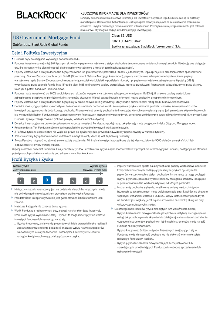 KLUCZOWE INFORMACJE DLA INWESTORÓW Niniejszy dokument zawiera kluczowe informacje dla inwestorów dotyczące tego funduszu. Nie są to materiały marketingowe. Dostarczenie tych informacji jest wymogiem prawnym mającym na celu ułatwienie zrozumienia charakteru i ryzyka związanego z inwestowaniem w ten fundusz. Przeczytanie niniejszego dokumentu jest zalecane inwestorowi, aby mógł on podjąć świadomą decyzję inwestycyjną. Class E2 USD US Government Mortgage Fund ISIN: LU0147385842 Subfundusz BlackRock Global Funds Spółka zarządzająca: BlackRock (Luxembourg) S.A. Cele i Polityka Inwestycyjna Fundusz dąży do osiągania wysokiego poziomu dochodu. Fundusz inwestuje co najmniej 80% łącznych aktywów w papiery wartościowe o stałym dochodzie denominowane w dolarach amerykańskich. Obejmują one obligacje oraz instrumenty rynku pieniężnego (tj. dłużne papiery wartościowe o krótkich terminach zapadalności). Papiery wartościowe o stałym dochodzie będą emitowane lub gwarantowane przez Rząd Stanów Zjednoczonych, jego agencje lub przedsiębiorstwa sponsorowane przez rząd Stanów Zjednoczonych, w tym GNMA (Government National Mortgage Association), papiery wartościowe zabezpieczone hipoteką i inne papiery wartościowe rządu Stanów Zjednoczonych reprezentujące udział właścicielski w portfelach hipotek, np. papiery wartościowe zabezpieczone hipoteką (MBS) wyemitowane przez agencje Fannie Mae i Freddie Mac. MBS to finansowe papiery wartościowe, które są przepływami finansowymi zabezpieczonymi przez aktywa, takie jak hipoteki handlowe i mieszkaniowe. Fundusz może inwestować do 100% swoich łącznych aktywów w papiery wartościowe zabezpieczone aktywami i MBS (tj. finansowe papiery wartościowe zabezpieczone przepływami pieniężnymi z instrumentów dłużnych). Więcej szczegółowych informacji można znaleźć w prospekcie informacyjnym. Papiery wartościowe o stałym dochodzie będą miały w czasie nabycia rating kredytowy, który będzie odzwierciedlał rating rządu Stanów Zjednoczonych. Doradca inwestycyjny będzie wykorzystywał finansowe instrumenty pochodne w celu zmniejszenia ryzyka w obszarze portfela Funduszu, zmniejszenia kosztów inwestycji oraz generowania dodatkowego dochodu. Finansowe instrumenty pochodne to inwestycje, których ceny opierają się na jednym rodzaju aktywów bazowych lub większej ich liczbie. Fundusz może, za pośrednictwem finansowych instrumentów pochodnych, generować zróżnicowane kwoty dźwigni rynkowej (tj. w sytuacji, gdy Fundusz uzyskuje zaangażowanie rynkowe powyżej wartości swoich aktywów). Doradca inwestycyjny ma prawo decydowania o wyborze inwestycji Funduszu, a podejmując taką decyzję może uwzględnić indeks Citigroup Mortgage Index. Rekomendacja: Ten Fundusz może nie być odpowiedni w przypadku inwestycji krótkoterminowych. Z Państwa tytułami uczestnictwa nie wiąże sie prawo do dywidendy (tzn. przychód z dywidendy będzie zawarty w wartości tytułów). Państwa udziały będą denominowane w dolarach amerykańskich, które są walutą bazową Funduszy. Mogą Państwo nabywać lub zbywać swoje udziały codziennie. Minimalna inwestycja początkowa dla tej klasy udziałów to 5000 dolarów amerykańskich lub odpowiednik tej kwoty w innej walucie. Więcej informacji na temat Funduszu, klas jednostek/tytułów uczestnictwa, ryzyka i opłat można znaleźć w prospekcie informacyjnym Funduszu, dostępnym na stronach poświęconych produktom w witrynie pod adresem www.blackrock.com Profil Ryzyka i Zysku Niższe ryzyko Zazwyczaj niższe zyski Wyższe ryzyko Zazwyczaj wyższe zyski Niniejszy wskaźnik wyznaczony jest na podstawie danych historycznych i może nie być wiarygodnym wskaźnikiem przyszłego profilu ryzyka Funduszu. Przedstawiona kategoria ryzyka nie jest gwarantowana i może z czasem ulec zmianie. Najniższa kategoria nie oznacza braku ryzyka. Wynik Funduszu z ratingu wynosi trzy, z uwagi na charakter jego inwestycji, które niosą ryzyka wymienione dalej. Czynniki te mogą mieć wpływ na wartość inwestycji Funduszu lub narazić go na straty. - Ryzyko kredytowe, zmiany stóp procentowych i/lub przypadki braku realizacji zobowiązań przez emitenta będą mieć znaczący wpływ na zwrot z papierów wartościowych o stałym dochodzie. Potencjalne lub rzeczywiste obniżki ratingów kredytowych mogą zwiększyć poziom ryzyka. Papiery wartościowe oparte na aktywach oraz papiery wartościowe oparte na kredytach hipotecznych podlegają tym samym ryzykom opisanym dla papierów wartościowych o stałym dochodzie. Instrumenty te mogą podlegać Ryzyku płynności, posiadać wysokie poziomy zaciągania kredytów i mogą nie w pełni odzwierciedlać wartości aktywów, od których pochodzą. - Instrumenty pochodne są bardzo wrażliwe na zmiany wartości aktywów bazowych, w związku z czym mogą zwiększać skalę strat i zysków, co skutkuje większymi wahaniami wartości Funduszu. Wpływ instrumentów pochodnych na Fundusz jest większy, jeżeli są one stosowane na szeroką skalę lub przy wykorzystaniu złożonych struktur. Do szczególnych rodzajów ryzyka nieobjętych tym wskaźnikiem należą: - Ryzyko kontrahenta: niewypłacalność jakiejkolwiek instytucji oferującej takie usługi jak przechowywanie aktywów lub działającej w charakterze kontrahenta względem instrumentów pochodnych lub innych instrumentów może narazić Fundusz na straty finansowe. - Ryzyko kredytowe: Emitent aktywów finansowych znajdujących się w Funduszu może nie wypłacić dochodu lub nie dokonać w terminie spłaty należnego Funduszowi kapitału. - Ryzyko płynności: oznacza niewystarczającą liczbę nabywców lub sprzedających umożliwiających Funduszowi swobodne sprzedawanie lub nabywanie inwestycji. - Opłaty Wnoszone opłaty służą pokryciu kosztów działania Funduszu, w tym kosztów marketingu i dystrybucji. Opłaty te zmniejszają potencjalny wzrost inwestycji. Podawana jest zawsze 