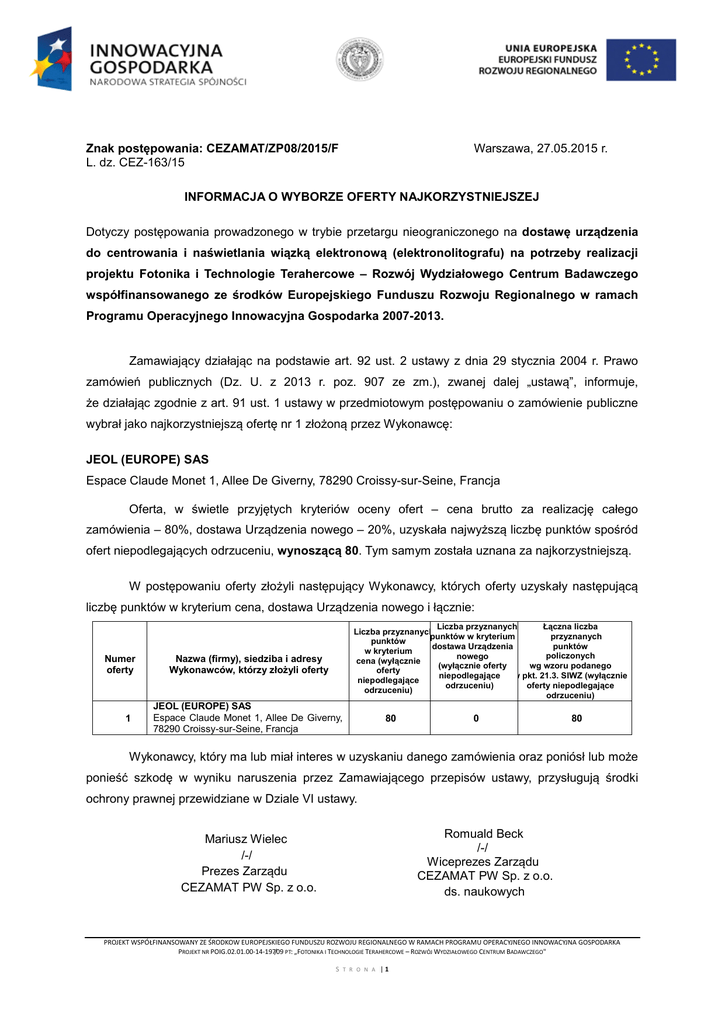 Znak postępowania: CEZAMAT/ZP08/2015/F L. dz. CEZ-163/15 Warszawa, 27.05.2015 r. INFORMACJA O WYBORZE OFERTY NAJKORZYSTNIEJSZEJ Dotyczy postępowania prowadzonego w trybie przetargu nieograniczonego na dostawę urządzenia do centrowania i naświetlania wiązką elektronową (elektronolitografu) na potrzeby realizacji projektu Fotonika i Technologie Terahercowe – Rozwój Wydziałowego Centrum Badawczego współfinansowanego ze środków Europejskiego Funduszu Rozwoju Regionalnego w ramach Programu Operacyjnego Innowacyjna Gospodarka 2007-2013. Zamawiający działając na podstawie art. 92 ust. 2 ustawy z dnia 29 stycznia 2004 r. Prawo zamówień publicznych (Dz. U. z 2013 r. poz. 907 ze zm.), zwanej dalej „ustawą”, informuje, że działając zgodnie z art. 91 ust. 1 ustawy w przedmiotowym postępowaniu o zamówienie publiczne wybrał jako najkorzystniejszą ofertę nr 1 złożoną przez Wykonawcę: JEOL (EUROPE) SAS Espace Claude Monet 1, Allee De Giverny, 78290 Croissy-sur-Seine, Francja Oferta, w świetle przyjętych kryteriów oceny ofert – cena brutto za realizację całego zamówienia – 80%, dostawa Urządzenia nowego – 20%, uzyskała najwyższą liczbę punktów spośród ofert niepodlegających odrzuceniu, wynoszącą 80. Tym samym została uznana za najkorzystniejszą. W postępowaniu oferty złożyli następujący Wykonawcy, których oferty uzyskały następującą liczbę punktów w kryterium cena, dostawa Urządzenia nowego i łącznie: Numer oferty 1 Liczba przyznanych Łączna liczba Liczba przyznanych punktów w kryterium przyznanych punktów dostawa Urządzenia punktów w kryterium policzonych nowego cena (wyłącznie wg wzoru podanego (wyłącznie oferty oferty niepodlegające w pkt. 21.3. SIWZ (wyłącznie niepodlegające odrzuceniu) oferty niepodlegające odrzuceniu) odrzuceniu) Nazwa (firmy), siedziba i adresy Wykonawców, którzy złożyli oferty JEOL (EUROPE) SAS Espace Claude Monet 1, Allee De Giverny, 78290 Croissy-sur-Seine, Francja 80 0 80 Wykonawcy, który ma lub miał interes w uzyskaniu danego zamówienia oraz poniósł lub może ponieść szkodę w wyniku naruszenia przez Zamawiającego przepisów ustawy, przysługują środki ochrony prawnej przewidziane w Dziale VI ustawy. Romuald Beck /-/ Wiceprezes Zarządu CEZAMAT PW Sp. z o.o. ds. naukowych Mariusz Wielec /-/ Prezes Zarządu CEZAMAT PW Sp. z o.o. PROJEKT WSPÓŁFINANSOWANY ZE ŚRODKOW EUROPEJSKIEGO FUNDUSZU ROZWOJU REGIONALNEGO W RAMACH PROGRAMU OPERACYJNEGO INNOWACYJNA GOSPODARKA PROJEKT NR POIG.02.01.00-14-197/09 PT: „FOTONIKA I TECHNOLOGIE TERAHERCOWE – ROZWÓJ WYDZIAŁOWEGO CENTRUM BADAWCZEGO" S T R O N A |1
