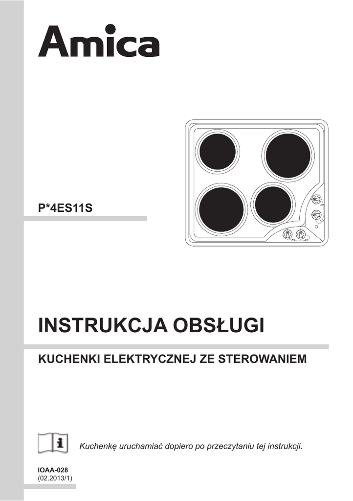 0 1 2 P*4ES11S 3 0 1 2 3 3 0 3 0 1 1 2 2 INSTRUKCJA OBSŁUGI KUCHENKI ELEKTRYCZNEJ ZE STEROWANIEM Kuchenkę uruchamiać dopiero po przeczytaniu tej instrukcji. IOAA-028 (02.2013/1) SZANOWNY KLIENCIE, Płyta Amica to połączenie wyjątkowej łatwości obsługi i doskonałej efektywności. Po przeczytaniu instrukcji, obsługa płyty nie będzie problemem. Płyta, która opuściła fabrykę była dokładnie sprawdzona przed zapakowaniem pod względem bezpieczeństwa i funkcjonalności na stanowiskach kontrolnych. Prosimy Państwa o uważną lekturę instrukcji obsługi przed uruchomieniem urządzenia. Przestrzeganie zawartych w niej wskazówek uchroni Państwa przed niewłaściwym użytko waniem. Instrukcję należy zachować i przechowywać tak, aby mieć ją zawsze pod ręką. Należy dokładnie przestrzegać instrukcji obsługi w celu uniknięcia nieszczęśliwych wypadków. Uwaga! Urządzenie obsługiwać tylko po przeczytaniu / zrozumieniu niniejszej instrukcji. Urządzenie zostało zaprojektowane wyłącznie jako urządzenie do gotowania.Każde inne jego zastosowanie ( np. do ogrzewania pomieszczeń) jest niezgodne z jego przeznaczeniem i może być niebezpieczne. Producent zastrzega sobie możliwość dokonywania zmian nie wpływających na działanie urządzenia. Oświadczenie producenta Producent deklaruje niniejszym, że wyrób ten spełnia zasadnicze wymagania wymienionych poniżej dyrektyw europejskich: ● dyrektywy niskonapięciowej 2006/95/WE, ● dyrektywy kompatybilności elektromagnetycznej 2004/108/WE, ● dyrektywy ekoprojektowania 2009/125/WE, i dlatego wyrób został oznakowany oraz została wystawiona dla niego deklaracja zgodności udostępniana organom nadzorującym rynek. Masz wątpliwości? Nie wszystko, co przeczytałeś w instrukcji jest zrozumiałe zadzwoń do Centrum Serwisowego, gdzie uzyskasz wszechstronną pomoc. tel. 801 801 800 2 spis treści Podstawowe informacje............................................................................................2 Wskazówki odnośnie bezpieczeństwa.....................................................................4 Jak oszczędzać energię.............................................................................................6 Rozpakowanie...........................................................................................................7 Usuwanie zużytych urządzeń.......................................................................................7 Opis wyrobu..........................................................................................................8 Dane techniczne.........................................................................................................8 Instalacja....................................................................................................................9 Podłączenie kuchenki do sieci elektrycznej................................................................11 Obsługa....................................................................................................................12 Załączenie urządzenia do pracy..................................................................................12 Odpowiednie naczynia do gotowania........................................................................12 Czyszczenie i konserwacja.....................................................................................15 Płytki grzejne.......................................................................................................15 Płyta robocza.............................................................................................................15 Gwarancja, obsługa posprzedażna......................................................................16 3 WSKAZÓWKI DOTYCZĄCE BEZPIECZEŃSTWA UŻYTKOWANIA Uwaga.Urządzenie i jego dostępne części stają się gorące podczas użycia. Możliwość dotknięcia elementów grzejnych powinno być objęte szczególną troską. Dzieci poniżej 8 roku życia powinny trzymać się z daleka, chyba że są pod stałą opieką. Niniejszy sprzęt może być używany przez dzieci w wieku od 8 lat i wyżej i osoby z ograniczeniami fizycznymi, czuciowymi albo umysłowymi albo brakiem doświadczenia i wiedzy, jeśli odbywa się pod nadzorem lub zgodnie z instrukcją użytkowania sprzętu, przekazanej przez osoby odpowiadające za ich bezpieczeństwo. Należy zwracać uwagę na dzieci, aby nie bawiły się sprzętem. Sprzątanie i czynności obsługowe nie powinny być robione przez dzieci bez nadzoru. Uwaga. Gotowanie bez nadzoru tłuszczu lub oleju na płycie kuchennej może być niebezpieczne i doprowadzić do pożaru. NIGDY nie próbuj gasić ognia wodą, ale wyłącz urządzenie i wtedy przykryj płomień np. pokrywką lub niepalnym kocem. Uwaga. Niebezpieczeństwo pożaru: nie gromadź rzeczy na powierzchni do gotowania. 4 WSKAZÓWKI ODNOŚNIE BEZPIECZEŃSTWA Urządzeniem nie należy sterować zewnętrznym zegarem lub niezależnym układem zdalnego sterowania. Do czyszczenia płyty nie wolno używać sprzętu do czyszczenia parą • Należy zwracać uwagę na dzieci, aby nie bawiły się sprzętem. • Niniejszy sprzęt nie jest przeznaczony do użytkowania przez osoby (w tym dzieci) o ograniczonej zdolności fizycznej, czuciowej lub psychicznej, lub osoby o braku doświadczenia lub znajomości sprzętu, chyba że odbywa się to pod nadzorem lub zgodnie z instrukcją użytkowania sprzętu, przekazanej przez osoby odpowiadające za ich bezpieczeństwo. • Należy uważać, żeby elektryczny przewód przyłączeniowy zmechanizowanego sprzętu nie dotykał gorących części kuchenki. • Wtyczka przewodu przyłączeniowego powinna być dostępna po zainstalowaniu kuchenki. • Zabrania się instalować kuchenkę w pobliżu urządzeń chłodniczych. • Nie należy pozostawiać kuchenki bez nadzoru podczas smażenia. Oleje i tłuszcze mogą się zapalić z powodu przegrzania. • Je