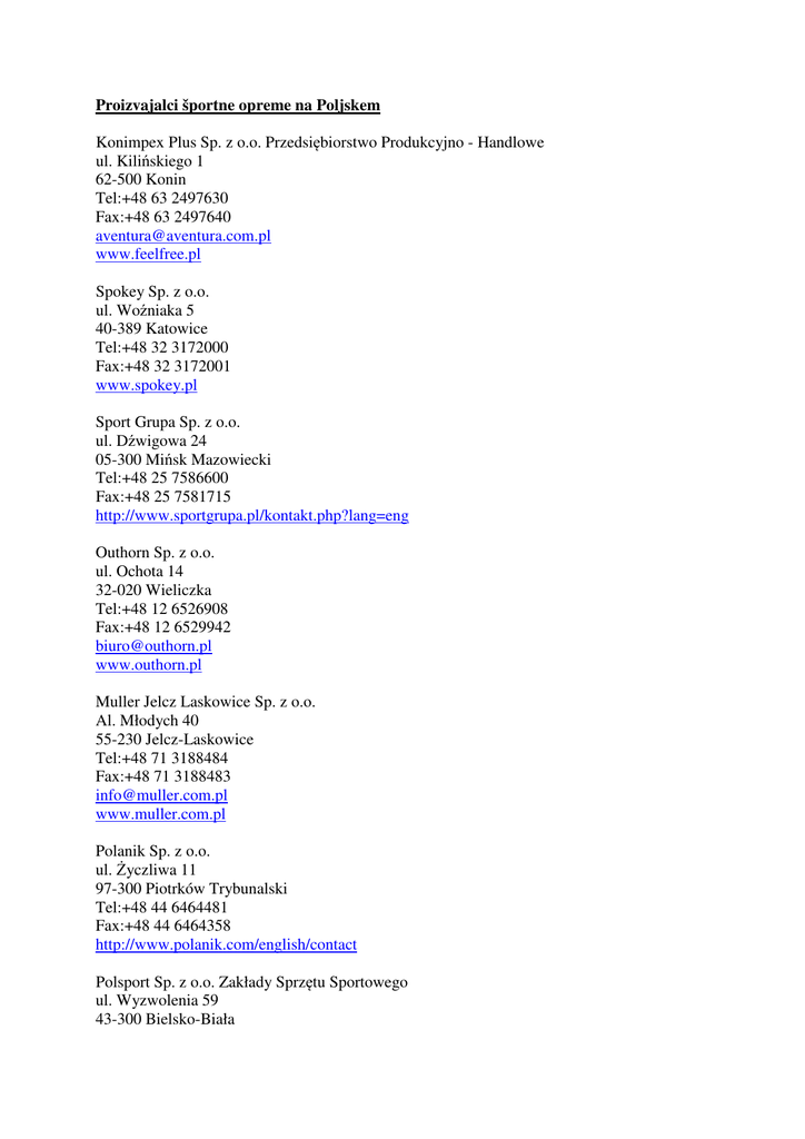 Proizvajalci športne opreme na Poljskem Konimpex Plus Sp. z o.o. Przedsiębiorstwo Produkcyjno - Handlowe ul. Kilińskiego 1 62-500 Konin Tel:+48 63 2497630 Fax:+48 63 2497640 [email protected] www.feelfree.pl Spokey Sp. z o.o. ul. Woźniaka 5 40-389 Katowice Tel:+48 32 3172000 Fax:+48 32 3172001 www.spokey.pl Sport Grupa Sp. z o.o. ul. Dźwigowa 24 05-300 Mińsk Mazowiecki Tel:+48 25 7586600 Fax:+48 25 7581715 http://www.sportgrupa.pl/kontakt.php?lang=eng Outhorn Sp. z o.o. ul. Ochota 14 32-020 Wieliczka Tel:+48 12 6526908 Fax:+48 12 6529942 [email protected] www.outhorn.pl Muller Jelcz Laskowice Sp. z o.o. Al. Młodych 40 55-230 Jelcz-Laskowice Tel:+48 71 3188484 Fax:+48 71 3188483 [email protected] www.muller.com.pl Polanik Sp. z o.o. ul. Życzliwa 11 97-300 Piotrków Trybunalski Tel:+48 44 6464481 Fax:+48 44 6464358 http://www.polanik.com/english/contact Polsport Sp. z o.o. Zakłady Sprzętu Sportowego ul. Wyzwolenia 59 43-300 Bielsko-Biała Tel:+48 33 8161289 Fax:+48 33 8181279 http://www.polsport-bielsko.com.pl/en/?page=kontakt Arpav Sp.z o.o. ul. Ziemowita 3a 80-354 Gdańsk Tel:+48 58 5582087 Fax:+48 58 5584532 [email protected] www.arpav.pl Polskok Sp. z o.o. ul. Wodzińska 1 32-500 Chrzanów Tel:+48 32 6423747 Fax:+48 32 6423747 ext.25 http://www.polskok.com.pl/pl/kontakt.php Mustang Wyrób i Sprzedaż Artykułów Jeździeckich ul. Bażantowa 2b 55-200 Oława Tel:+48 71 3133542 Fax:+48 71 3133542 [email protected] www.mustang.pl Tico 3000 Sp. z o.o. Al. Pamięci Ofiar Litzmannstadt Getto 5 91-859 Łódź Tel:+48 42 6599689 [email protected] http://www.tico.com.pl Meduza Sp. j. Przedsiębiorstwo Handlowe. Sylwia Rychlik, Mariusz Rychlik ul. Sosnowa 6E 71-468 Szczecin Tel:+48 91 4235858 Fax:+48 91 4227627 [email protected] http://www.york.info.pl/ Športna oprema in oprema za taborjenje, distributerji in verige trgovin na drobno a) Hipermarketi, ki mdr. prodajajo športno opremo CARREFOUR Polska Sp. z o.o. ul. Targowa 72 03-734 Warszawa Tel:+48 22 5172116 Centrala Fax:+48 22 5172203 Centrala [email protected] www.carrefour.pl Selgros Sp. z o.o. ul. Zamenhofa 133 61-131 Poznań Tel:+48 61 8742161 Fax:+48 61 8742199 https://www.selgros.pl/kontakt Auchan Polska Sp. z o.o. ul. Puławska 46 05-500 Piaseczno Tel:+48 22 7038200 Fax:+48 22 7038210 http://www.auchan.pl/kontakt Alma Market SA ul. Pilotów 6 30-964 Kraków Tel:+48 12 6276320 Centrala Fax:+48 12 6276165 [email protected] www.almamarket.pl Marcpol SA Polska Sieć Handlowa Al. Wilanowska 365 02-665 Warszawa Tel:+48 22 5470508 Fax:+48 22 6217754 [email protected] www.marcpol.waw.pl Makro Cash and Carry Polska SA Al. Jana Pawła II 123 85-140 Bydgoszcz Tel:+48 52 3496500 Fax:+48 52 3492873 http://www.makro.pl/public/formularz-kontaktowy http://www.makro.pl/public/kontakt-dla-dostawcow Astra Sp. z o.o. ul. Horbaczewskiego 4-6 54-130 Wrocław Tel:+48 71 3549608 Fax:+48 71 3515152 http://astra.wroc.pl/kontakt/adresy-i-telefony/? b) Trgovine specializirane na prodajo športne opreme, distributerji Decathlon Sp.z o.o. ul. Geodezyjna 76 03-290 Warszawa Tel:+48 22 3337000 Fax:+48 22 3337071 http://www.decathlon.com.pl/PL/warszawa-39310240/ INTERSPORT Polska S.A. Cholerzyn 382, 32-060 LISZKI Tel. (+4812) 44 48 100, 44 48 103 Fax. (+4812) 44 48 000, 44 48 102 Mail: [email protected] www.intersport.pl City Sport 03-285 Warszawa ul. Kondratowicza 27 tel: +48 -22 674-03-01 +48 22 674-04-72 fax: +48 -22 811-36-86 email: [email protected] www.citysport.com.pl Jubilat Handlowa Spółdzielnia Al. Krasińskiego 1/3 31-111 Kraków Tel:+48 12 4228040 Fax:+48 12 4222565 http://www.jubilat.com.pl/pl/3/0/10/Kontakt Spółdzielnia Pracy Gorzków Handlowo-Produkcyjna ul. Magazynowa 1 33-300 Nowy Sącz Tel:+48 18 4427453 Fax:+48 18 4427426 [email protected] www.hpsp.com.pl Zenit Sp. z o.o. Zakład Pracy Chronionej ul. Ochronek 34 33-100 Tarnów Tel:+48 14 6887170 http://www.zenit.tarnow.pl/kontakt.html PM Sport Sp.j. Paweł Lewandowski, Michał Wojtiuk ul. Puławska 435A 02-801 Warszawa Tel:+48 22 5468838 Fax:+48 22 5468858 http://www.pmsport.com.pl/contact/ ACM Sp. z o.o. ul. Żmigrodzka 242 D/A 51-131 Wrocław Tel:+48 71 3529320 http://www.bergson.pl/kontakt Tytan Sport Sp. z o.o. ul. Krawczyka 1 43-190 Mikołów Tel:+48 32 3481855 Fax:+48 32 3481856 http://www.k2sports.pl/index.php/kontakt LAUBR-SPORT PL Sp. z o.o. ul. Cechowa 51 30-614 Kraków Tel:+48 12 6548500 Fax:+48 12 6548500 [email protected] www.laubrsport.pl Net Sport Sp. z o.o. ul. Leszno 34/36 01-199 Warszawa Tel:+48 22 6317263 Fax:+48 22 6315521 Adatom Zielazek Sport S.c. Adam Zielazek, Tomasz Zielazek ul. Zamenhofa 133/38 61-131 Poznań Tel:+48 61 8757875 Fax:+48 61 8757875 [email protected] www.familisport.pl Mad Bike Polska Sp. z o.o. ul. 26 Kwietnia 81 71-126 Szczecin Tel:+48 91 4325401 Fax:+48 91 4325405 [email protected] www.madbike.pl WIND-SNOW-MOTO S.c. ul. Opolska 18 31-323 Kraków Tel:+48 12 4169210 Fax:+48 12 4169220 http://wsm24.pl/ [email protected] Extreme Bike Przemysław Zyber ul. Niepodległości 27 41-106 Siemianowice Śląskie Tel:+48 32 6080177 Fax:+48 32 6080177 GSM: +48 506 13 27 31 [email protected] www.extremebike.com.pl Athletic Shop S.c. ul. Lubelska 20/20a 03-802 Warszawa Tel:+48 22 6188288 Fax:+48 22 6188023 Sport - Centrum Regionalna Hurtownia Sportowa Jarosław Dźwierzyński PHP ul. Baczyńskiego 8 35-210 Rzeszów Tel:+48 17 8537054 www.sport-centrum.pl [email protected] ESPADA Spółka z o.o. Ul. Radzymińska 171 03-576 Warszawa Tel:+48 22 6799717 Fax:+48 22 6783474 [email protected] Športni časopisi in revije Sport Marketing House Sp. z o.o. ul. Krótka 29/31 42-200 Częstochowa Tel:+48 34 3671727 KiF Redakcja ul. Ostrzycka 2/4 04-035 Warszawa tel. (22) 673 77 95 e-mail: [email protected] BRAVO SPORT 04-035 Warszawa ul. Motorowa 1 , telefon: (22) 51 70 244, fax: (22) 51 70 243, [email protected] Redakcja Golfpl.com i czasopisma „GOLF” Ul. Kruszwicka 1 b 71-043 Szczecin Tel. 91 886 52 30, 91 886 52 30, 91 886 52 31 Fax 91 886 52 32, 22 212 83 81 E-mai