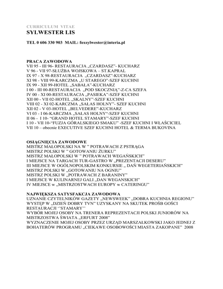 CURRICULUM VITAE SYLWESTER LIS TEL 0 606 330 903 MAIL: [email protected] PRACA ZAWODOWA VII 95 - III 96- RESTAURACJA „CZARDASZ”- KUCHARZ V 96 - VII 97-SŁUŻBA WOJSKOWA – ST.KAPRAL IX 97 - X 98-RESTAURACJA „CZARDASZ”-KUCHARZ XI 98 - VIII 99-KARCZMA „U STAREGO”-SZEF KUCHNI IX 99 - XII 99-HOTEL „SABAŁA”-KUCHARZ I 00 - III 00-RESTAURACJA „POD SKOCZNIĄ”-Z-CA SZEFA IV 00 - XI 00-RESTAURACJA „PASIEKA”-SZEF KUCHNI XII 00 - VII 02-HOTEL „SKALNY”-SZEF KUCHNI VIII 02 - XI 02-KARCZMA „SAŁAS HOLNY”- SZEF KUCHNI XII 02 - V 03-HOTEL „BELVEDERE”-KUCHARZ VI 03 - I 06-KARCZMA „SAŁAS HOLNY“-SZEF KUCHNI II 06 - I 10- “GRAND HOTEL STAMARY”-SZEF KUCHNI I 10 - VII 10-“FUZJA GÓRALSKIEGO SMAKU” -SZEF KUCHNI I WŁAŚCICIEL VII 10 – obecnie EXECUTIVE SZEF KUCHNI HOTEL & TERMA BUKOVINA OSIĄGNIĘCIA ZAWODOWE MISTRZ MAŁOPOLSKI NA W ” POTRAWACH Z PSTRĄGA MISTRZ POLSKI W ” GOTOWANIU ŻURKU” MISTRZ MAŁOPOLSKI W ” POTRAWACH WEGAŃSKICH” I MIEJSCE NA TARGACH TUR-GASTRO W „PREZENTACJI DESERU” III MIEJSCE W OGÓLNOPOLSKIM KONKURSIE „ DAŃ WEGETERIAŃSKICH” MISTRZ POLSKI W „GOTOWANIU NA OGNIU” MISTRZ POLSKI W „POTRAWACH Z BARANINY” I MIEJSCE W KULINARNEJ GALI „DAN WEGANSKICH” IV MIEJSCE w „MISTRZOSTWACH EUROPY w CATERINGU” NAJWIĘKSZA SATYSFAKCJA ZAWODOWA UZNANIE CZYTELNIKÓW GAZETY „NEWSWEEK” „DOBRA KUCHNIA REGIONU” WYSTĘP W „DZIEŃ DOBRY TVN” UZYSKANY NA SKUTEK PROŚB GOŚCI RESTAURACJI „‟STAMARY‟‟ WYBÓR MOJEJ OSOBY NA TRENERA REPREZENTACJI POLSKI JUNIORÓW NA MISTRZOSTWA ŚWIATA „ERFURT 2008” WYZNACZENIE MOJEJ OSOBY PRZEZ URZĄD MARSZAŁKOWSKI JAKO JEDNEJ Z BOHATERÓW PROGRAMU „CIEKAWE OSOBOWOŚCI MIASTA ZAKOPANE” 2008