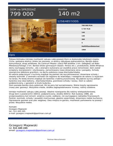 Józefów DOM na SPRZEDAŻ 140 m2 799 000 1258/4857/ODS 799 000 PLN 5 707 PLN 140 140 360 5 HalfOfSemiDetached 1984 Opis Połowa bliźniaka (istnieje możliwość zakupu całej posesji).Dom w doskonałej lokalizacji miasta. Cicha, spokojna okolica, blisko las sosnowy, w okolicy zabudowa jednorodzinna. Bardzo dobra komunikacja, drogi asfaltowe. Do Centrum Miasta i stacji PKP Józefów 1 km. Odległość od Wału Miedzeszyńskiego 2 km. Bardzo blisko gimnazjum (basen, fitness etc.), przedszkola, żłobki.Wnętrza domu wymagają remontu , ale z zewnątrz wykonano już wszelkie prace remontowe- dom został ocieplony styropianemi i otynkowany, zamontowano nowe drewniane okna i parapety, Schody zewnętrzne obłożono granitem, na dachu położono nową blachodachówkę. W salonie połączonym z kuchnią znajduje się parkiet (do wycyklinowania), drewniane schody i otwarty kominek. Z zewnatrz wchodzi sie najpierw do wiatrołapu i następnie do salonu (z wyjściem na taras), Po lewej stronie znajduje sie łazienka z kabiną prysznicową. Na piętrze są trzy pokoje i łazienka oraz dwa balkony., blachodachówka, granitowe schody i tarasy. Dom w całości podpiwniczony, z garażem w bryle budynku. Dom posiada bardzo duży potencjał. Do tej pory był wynajmowany. Niskie koszty ogrzewania (nowy piec gazowy). Wszystkie media, działka zagospodarowana- krzewy, rośliny ozdobne. Istnieje możliwość zakupu całej posesji. Idealne rozwiązanie dla rodziny wielopokoleniowej. Drugi dom o powierzchni 160m2, podpiwniczony, działka 600m2. Rok budowy 1986, ale przeprowadzony był remont- wnętrza czyste, zadbane, nie wymagajace nakladów finansowych. Parkiet, kominek, schody i posadzki marmurowe, gładzie szpachlowe, drewniane meble kuchenne. Ogrzewanie gazowe oraz piec węglowy. Dwa miejsca w garażu, możliwość parkowania na posesji i przed. Wszystkie media. Kontakt: Grzegorz Majewski tel.: 511 445 245 e-mail: [email protected] Grzegorz Majewski tel. 511 445 245 email: [email protected] Portman Nieruchomości Portman Nieruchomości Powered by TCPDF (www.tcpdf.org)