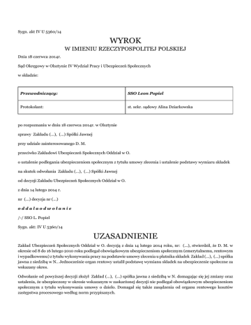 Sygn. akt IV U 5360/14 WYROK W IMIENIU RZECZYPOSPOLITEJ POLSKIEJ Dnia 18 czerwca 2014r. Sąd Okręgowy w Olsztynie IV Wydział Pracy i Ubezpieczeń Społecznych w składzie: Przewodniczący: SSO Leon Popiel Protokolant: st. sekr. sądowy Alina Dziarkowska po rozpoznaniu w dniu 18 czerwca 2014r. w Olsztynie sprawy Zakładu (...), (...) Spółki Jawnej przy udziale zainteresowanego D. M. przeciwko Zakładowi Ubezpieczeń Społecznych Oddział w O. o ustalenie podlegania ubezpieczeniom społecznym z tytułu umowy zlecenia i ustalenie podstawy wymiaru składek na skutek odwołania Zakładu (...), (...) Spółki Jawnej od decyzji Zakładu Ubezpieczeń Społecznych Oddział w O. z dnia 14 lutego 2014 r. nr (...) decyzja nr (...) oddalaodwołanie /-/ SSO L. Popiel Sygn. akt: IV U 5360/14 UZASADNIENIE Zakład Ubezpieczeń Społecznych Oddział w O. decyzją z dnia 14 lutego 2014 roku, nr: (...), stwierdził, że D. M. w okresie od 8 do 16 lutego 2010 roku podlegał obowiązkowym ubezpieczeniom społecznym (emerytalnemu, rentowym i wypadkowemu) z tytułu wykonywania pracy na podstawie umowy zlecenia u płatnika składek Zakład (...), (...) spółka jawna z siedzibą w N.. Jednocześnie organ rentowy ustalił podstawę wymianu składek na ubezpieczenie społeczne za wskazany okres. Odwołanie od powyższej decyzji złożył Zakład (...), (...) spółka jawna z siedzibą w N. domagając się jej zmiany oraz ustalenia, że ubezpieczony w okresie wskazanym w zaskarżonej decyzji nie podlegał obowiązkowym ubezpieczeniom społecznym z tytułu wykonywania umowy o dzieło. Domagał się także zasądzenia od organu rentowego kosztów zastępstwa procesowego według norm przypisanych. Zaskarżonej decyzji zarzucił naruszenie przepisów prawa materialnego: 1. art. 83 ust. 1 pkt 1it. 3 w zw. z art. 6 ust 1 pkt 4 oraz art. 13 pkt 2 ustawy z 13 października 1998 r. o systemie ubezpieczeń społecznych poprzez ich niewłaściwe zastosowanie i uznanie , że umowa nazwana przez strony jako umowa o dzieło stanowi podstawę do objęcia wykonawcy ubezpieczeniami społecznymi; emerytalnym, rentowym, wypadkowym; 2. art. 734 kc w zw. z art. 65 § 2 kc, poprzez błędną wykładnię i niewłaściwa zastosowanie i uznanie, że umowa zawarta przez strony jest umową zlecenie, podczas gdy umowa ta ma charakter umowy o dzieło, o czym świadczy również cel tejże umowy zgodny zamiar stron ją zawierających. Odwołujący w pierwszej kolejności zwrócił uwagę na charakter prawny umowy nazwanej przez jej strony umową o dzieło. Przedstawił obszerną charakterystykę tej umowy oraz umowy zlecenia w świetle przepisów kodeksu cywilnego i orzecznictwa Sądu Najwyższego w tym zakresie. Mając na uwadze powyżej wskazane cechy, którymi charakteryzują się umowy o dzieło stwierdził, iż umowy zakwestionowane w protokole kontroli przeprowadzonej u odwołującego błędnie uznane za umowę zlecenie, w rzeczywistości odpowiadają charakterem umowie o dzieło. Umowa zlecenia charakteryzuje się bowiem tym, że przyjmujący zlecenie zobowiązuje się do dokonania określonych czynności dla dającego zlecenie, za których ostateczny efekt nie jest odpowiedzialny (odmiennie od umowy o dzieło, która jest tzw. umową rezultatu). Istota umowy zlecenia zasadza się więc w ustaleniu, iż jest to umowa starannego działania. Oznacza to, iż do oceny wykonania umowy konieczne jest nie osiągniecie określonego rezultatu, lecz starania w celu osiągnięcia tego wyniku. Tym samym w przypadku umowy zlecenia ocenie podlega nie konkretnie osiągnięty cel, ale czynności zmierzające do jego osiągnięcia oraz staranność ich wykonania. Mając na względzie brak jakiejkolwiek kontroli, osób z którymi zawarte były umowy błędnie przez Zakład Ubezpieczeń Społecznych zakwalifikowane jako umowy zlecenia, uznać należy że nie było obiektywnej możliwości ocenić czynności zmierzających do osiągnięcia przez nich określonego celu, a już tym bardziej nie istniała możliwość oceny staranności ich działania. Zakwestionowane umowy, wbrew stanowisku Zakładu Ubezpieczeń Społecznych nie mają cech pozwalających ich zakwalifikowanie jako umowy zlecenia. Wskazana umowa została zawarta przez odwołującego z ubezpieczonym polegała na wykonaniu dzieła. Umowa ta niewątpliwie, charakteryzuje się cechami właściwymi dla umów o dzieło. Nawet w przypadku, gdyby posiadała ona również cechy umowy zlecenia, były one marginalne. Należy zaś pamiętać, iż w przypadku gdy w danej umowie, przeważają elementy charakterystyczne dla stosunku prawnego powstającego na podstawie umowy o dzieło, zaś elementy charakterystyczne dla innego stosunku prawnego są jedynie drugorzędne, zastosowanie mają przepisy regulujące ten pierwszy stosunek prawny. Wnioskodawca podkreślił, że treścią zakwestionowanej umowy było wykonanie dzieła w postaci wytworzenia umówionego elementu konstrukcyjnego. Abstrahując od literalnego brzmienia użytych w umowie sformułowań, jej treścią było dokonanie zmian w już istniejącej rzeczy, poprzez jej połączenie z innymi, uzupełnienie lub rozbudowę. Materialny efekt tych prac, przybrał charakter dzieła w jego doktrynalnym rozumieniu. Od umowy zlecenia odróżnia je też to, że zainteresowany nie podjął się dokonania na rzecz dającego zlecenie określonych czynności prawnych, o których stanowi art. 734 KC (por. wyrok SN z dnia 19 maja 1998 r., sygn. akt II CKN 764/97). Sporna umowa nie jest także umową o świadczenie usług nieuregulowaną innymi przepisami (art. 750 KC), gdyż jej istotą było zobowiązanie się przyjmującego zamówienie do osiągnięcia weryfikowalnego rezultatu w zamian za zobowiązanie do zapłaty wynagrodzenia. Również rezultat działań zainteresowanego należy kwalifikować jako dzieło, a jego istnienie jako konstrukcyjny element umowy stron, pozwalający odróżnić ją od innych umów o świadczenie usług. Przyjmujący zamówienie po