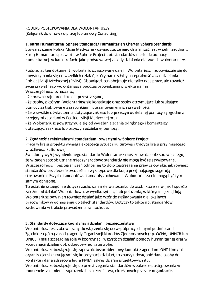 KODEKS POSTĘPOWANIA DLA WOLONTARIUSZY (Załącznik do umowy o pracę lub umowy Consulting) 1. Karta Humanitarna Sphere Standards/ Humanitarian Charter Sphere Standards Stowarzyszenie Polska Misja Medyczna - oświadcza, że jego działalnośd jest w pełni zgodna z Kartą Humanitarną zawarta w Sphere Project dot. standardów niesienia pomocy humanitarnej w katastrofach jako podstawowej zasady działania dla swoich wolontariuszy. Podpisując ten dokument, wolontariusz, nazywany dalej "Wolontariusz", zobowiązuje się do powstrzymania się od wszelkich działao, który naruszałyby integralnośd zasad działania Polskiej Misji Medycznej (PMM). Obowiązek ten obejmuje nie tylko czas pracy, ale również życia prywatnego wolontariusza podczas prowadzenia projektu na misji. W szczególności oznacza to, - że prawo kraju projektu jest przestrzegane, - że osoby, z którymi Wolontariusz sie kontaktuje oraz osoby otrzymujące lub szukające pomocy są traktowane z szacunkiem i poszanowaniem ich prywatności, - że wszystkie oświadczenia dotyczące zakresu lub przyczyn udzielanej pomocy są zgodne z przyjętymi zasadami w Polskiej Misji Medycznej oraz - że Wolontariusz powstrzymuje się od wyrażania zdania odrębnego i komentarzy dotyczących zakresu lub przyczyn udzielanej pomocy. 2. Zgodnośd z minimalnymi standardami zawartymi w Sphere Project Praca w kraju projektu wymaga akceptacji sytuacji kulturowej i tradycji kraju przyjmującego i wrażliwości kulturowej. Świadomy wyżej wymienionego standardu Wolontariusz musi zdawad sobie sprawę z tego, że w żaden sposób uznane międzynarodowo standardy nie mogą byd relatywizowane. W szczególności i bez ograniczeo odnosi się to do przestrzegania praw człowieka, jak również standardów bezpieczeostwa. Jeśli nawyki typowe dla kraju przyjmującego sugerują stosowanie niższych standardów, standardy zachowania Wolontariusza nie mogą byd tym samym obniżone. To ostatnie szczególnie dotyczy zachowania się w stosunku do osób, które są w jakiś sposób zależne od działao Wolontariusza, w wyniku sytuacji lub położenia, w którym się znajdują. Wolontariusz powinien również działad jako wzór do naśladowania dla lokalnych pracowników w odniesieniu do takich standardów. Dotyczy to także np. standardów zachowania w trakcie prowadzenia samochodu. 3. Standardy dotyczące koordynacji działao i bezpieczeostwa Wolontariusz jest zobowiązany do włączenia się do współpracy z innymi podmiotami. Zgodnie z ogólną zasadą, agendy Organizacji Narodów Zjednoczonych (np. OCHA, UNHCR lub UNICEF) mają szczególną rolę w koordynacji wszystkich działao pomocy humanitarnej oraz w koordynacji działao dot. odbudowy po katastrofie. Wolontariusz zobowiązuje się zapewnid bezproblemowy kontakt z agendami ONZ i innymi organizacjami zajmującymi się koordynacją działao, to znaczy udostępnid dane osoby do kontaktu i dane adresowe biura PMM, zakres działao projektowych itp. Wolontariusz zobowiązuje się do przestrzegania standardów w zakresie postępowania w momencie zaistnienia zagrożenia bezpieczeostwa, określonych przez te organizacje. Jeżeli istnieją specjalne wytyczne dot. bezpieczeostwa, np. godzina policyjna narzucona przez paostwo lub inne zakazy lub zalecenia dotyczące zachowania w odniesieniu do mobilności i bezpieczeostwa osobistego, Wolontariusz jest zobowiązany nie tylko postępowad zgodnie z nimi, ale także pouczad i zachęcad swoich pracowników do ich przestrzegania. Skuteczne i sprawdzone standardy, jak na przykład, komunikacja za pomocą radia VHF lub ograniczenia dotyczących nagrao audio i wideo mają byd ściśle przestrzegane. Jak najszybciej po przybyciu do kraju projektu Wolontariusz ponosi odpowiedzialnośd za zapoznanie się z zasadami unikania niebezpieczeostw, jak również z zasadami odpowiedniego zachowania w wyjątkowych okolicznościach. Są to, na przykład zasady dot. zachowania sie w przypadku kradzieży, rabunku, zatrzymania, napaści i przemocy słownej czy użycia siły zbrojnej. Sytuacje takie wymagają złożenia pisemnego raportu do Polskiej Misji Medycznej. 4. Postępowanie dotyczące przyjmowania prezentów Wolontariusz działa jako przedstawiciel i w imieniu Polskiej Misji Medycznej. Pomoc humanitarna Polskiej Misji Medycznej jest prowadzana zgodnie z zasadami stowarzyszenia. Przyjmowanie prezentów lub przysług w zamian za usługi zależne Wolontariusza jest, niezależnie od ich charakteru, surowo zabronione. Prezenty, które są prezentowane przez osoby ściśle związane z Wolontariuszem (np. współpracowników tych samych lub innych organizacji) i przy okazji wyraźnie osobiste są zwolnione z tego rozporządzenia. Jeżeli przyjęcia prezentu nie można uniknąd bez sprawienia afrontu ofiarodawcy, prezent musi byd przyjęty w taki sposób, aby wyjaśnid, że Wolontariusz nie traktuje go jako mienia osobistego. Ocena takiej sytuacji spoczywa na Wolontariuszu i powinna byd oparta na starannym rozważeniu wszelkich okoliczności. Prezenty od osób i organizacji, z którymi Wolontariusz współpracuje w imieniu Polskiej Misji Medycznej są we wszystkich przypadkach są niewłaściwe i należy odmówid ich przyjęcia. 5. Reprezentowanie Polskiej Misji Medycznej Wolontariusz ma świadomośd, że wszelkie oświadczenia udzielane w drodze oficjalnych kontaktów oraz do społeczności lokalnej reprezentują wyłącznie standardy i dobre imię Polskiej Misji Medycznej (oraz, jeżeli więcej organizacji jest zaangażowanych w projekt, także dobre imię partnerów). 6. Postępowanie w stosunku do innych organizacji działających na miejscu w kraju projektu Wolontariusz nie jest upoważniony do wydawania poleceo przedstawicielom innych organizacji działających w kraju projektu, ani do wydawania oświadczeo lub uwag w stosunku do donorów lub mediów w imieniu innej organizacji (na przykład na spotkaniach koordynacyjnych). 7. Poważne naruszenia Kodeksu Postępowania W przypadku s