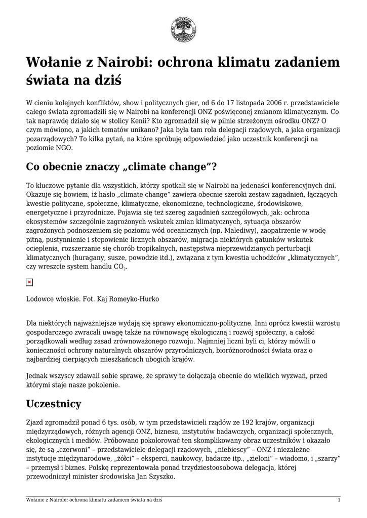 Wołanie z Nairobi: ochrona klimatu zadaniem świata na dziś W cieniu kolejnych konfliktów, show i politycznych gier, od 6 do 17 listopada 2006 r. przedstawiciele całego świata zgromadzili się w Nairobi na konferencji ONZ poświęconej zmianom klimatycznym. Co tak naprawdę działo się w stolicy Kenii? Kto zgromadził się w pilnie strzeżonym ośrodku ONZ? O czym mówiono, a jakich tematów unikano? Jaka była tam rola delegacji rządowych, a jaka organizacji pozarządowych? To kilka pytań, na które spróbuję odpowiedzieć jako uczestnik konferencji na poziomie NGO. Co obecnie znaczy „climate change”? To kluczowe pytanie dla wszystkich, którzy spotkali się w Nairobi na jedenaści konferencyjnych dni. Okazuje się bowiem, iż hasło „climate change” zawiera obecnie szeroki zestaw zagadnień, łączących kwestie polityczne, społeczne, klimatyczne, ekonomiczne, technologiczne, środowiskowe, energetyczne i przyrodnicze. Pojawia się też szereg zagadnień szczegółowych, jak: ochrona ekosystemów szczególnie zagrożonych wskutek zmian klimatycznych, sytuacja obszarów zagrożonych podnoszeniem się poziomu wód oceanicznych (np. Malediwy), zaopatrzenie w wodę pitną, pustynnienie i stepowienie licznych obszarów, migracja niektórych gatunków wskutek ocieplenia, rozszerzanie się chorób tropikalnych, następstwa nieprzewidzianych perturbacji klimatycznych (huragany, susze, powodzie itd.), związana z tym kwestia uchodźców „klimatycznych”, czy wreszcie system handlu CO2. Lodowce włoskie. Fot. Kaj Romeyko-Hurko Dla niektórych najważniejsze wydają się sprawy ekonomiczno-polityczne. Inni oprócz kwestii wzrostu gospodarczego zwracali uwagę także na równowagę ekologiczną i rozwój społeczny, a całość porządkowali według zasad zrównoważonego rozwoju. Najmniej liczni byli ci, którzy mówili o konieczności ochrony naturalnych obszarów przyrodniczych, bioróżnorodności świata oraz o najbardziej cierpiących mieszkańcach ubogich krajów. Jednak wszyscy zdawali sobie sprawę, że sprawy te dołączają obecnie do wielkich wyzwań, przed którymi staje nasze pokolenie. Uczestnicy Zjazd zgromadził ponad 6 tys. osób, w tym przedstawicieli rządów ze 192 krajów, organizacji międzyrządowych, różnych agencji ONZ, biznesu, instytutów badawczych, organizacji społecznych, ekologicznych i mediów. Próbowano pokolorować ten skomplikowany obraz uczestników i okazało się, że są „czerwoni” – przedstawiciele delegacji rządowych, „niebiescy” – ONZ i niezależne instytucje międzynarodowe, „żółci” – eksperci, naukowcy, badacze itp., „zieloni” – wiadomo, i „szarzy” – przemysł i biznes. Polskę reprezentowała ponad trzydziestoosobowa delegacja, której przewodniczył minister środowiska Jan Szyszko. Wołanie z Nairobi: ochrona klimatu zadaniem świata na dziś 1 W swym głównym nurcie spotkanie było poświęcone 12. Konferencji Stron Ramowej Konwencji ONZ o Zmianach Klimatu oraz 2. Spotkaniu Stron Protokołu z Kioto. Tu prym wiedli negocjatorzy rządowi. Jednak każdy z obecnych miał też możliwość uczestniczenia w wielu spotkaniach, minikoferencjach i prezentacjach organizowanych przez poszczególne delegacje rządowe, ośrodki naukowo-badawcze, różne organizacje biznesowe, obywatelskie i ekologiczne. Dlaczego kwestie klimatyczne zasługują na tyle uwagi? Bowiem fakty są alarmujące. Okazuje się, że bez radykalnych działań ograniczających emisję gazów cieplarnianych, już za 20 lat ich koncentracja w atmosferze może osiągnąć poziom dwukrotnie wyższy, aniżeli stężenie z okresu przed uprzemysłowieniem. Oznacza to podwyższenie przeciętnej globalnej temperatury o ponad 2o C i tym samym spore zmiany w geografii fizycznej świata. W zeszłym roku ludzkość emitowała w powietrze około 7,5 mld ton węgla w postaci gazów cieplarnianych. Wypada więc prawie 1,5 tony na jednego człowieka. Oczywiście – jak powtarzają przedstawiciele Afryki – nie wszyscy w jednakowym stopniu zapracowaliśmy na ten wynik. Im biedniejszy kraj, tym jego mieszkańcy mniej zanieczyszczają ziemską atmosferę. Przeciętny Afrykanin emituje znikome ilości zanieczyszczeń, podczas gdy na jednego Amerykanina czy Australijczyka – rekordzistów w tej klasyfikacji – wypada po kilka ton rocznie. Najbardziej podatne na konsekwencje emisji szkodliwych gazów do atmosfery są kraje najbiedniejsze i najuboższa część ludności. Ucierpią one w pierwszej kolejności i w największym stopniu, choć najmniej przyczyniły się do zmian klimatycznych. Koszty ekstremalnych warunków atmosferycznych, w tym powodzi, suszy i sztormów, już rosną, również w państwach zamożnych. Konsekwencje ocieplenia klimatu mogą być liczne: przesuną się strefy klimatyczne, zniknie wiele gatunków roślin i zwierząt, wybrzeża i wyspy zostaną zalane przez podnoszące się morza, susze w Afryce zmniejszą już dziś niedostateczne plony, w błyskawicznie ocieplającej się Arktyce nastąpi katastrofa ekologiczna, kłopoty z zaopatrzeniem w wodę dotkną dwie trzecie ludzkości, upadnie turystyka w niektórych regionach, rozszerzą się choroby tropikalne, nastąpi dalsze ubożenie biednych społeczeństw. Wiadomo też, że Protokół z Kioto ponosi porażkę, mimo iż wynikające z niego zobowiązania podjęło aż 168 krajów. Niestety wyłamali się najwięksi producenci gazów cieplarnianych, jak USA (wyjątkiem jest tam Kalifornia) czy Australia. Niektóre kraje ratyfikowały protokół, ale ze względu na bieżące potrzeby gospodarcze nie obiecują zredukowania emisji, jak Indie, Chiny czy Polska. Stąd też organizatorzy za cel nadrzędny uznali rozpoczęcie negocjacji w sprawie określenia formuły drugiego okresu zobowiązań, po 2012 roku. Norwegia. Fot. Joanna Milewska O czym mówiono, a jakich tematów unikano? Najogólniejsze wrażenie jest takie, że mówiono dużo o pieniądzach i nowych technologiach, sporo
