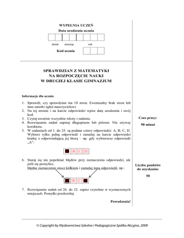 WYPEŁNIA UCZEŃ Data urodzenia ucznia dzień miesiąc rok Kod ucznia SPRAWDZIAN Z MATEMATYKI NA ROZPOCZĘCIE NAUKI W DRUGIEJ KLASIE GIMNAZJUM Informacje dla ucznia 1. Sprawdź, czy sprawdzian ma 10 stron. Ewentualny brak stron lub inne usterki zgłoś nauczycielowi. 2. Na tej stronie i na karcie odpowiedzi wpisz datę urodzenia i swój kod. 3. Czytaj uważnie wszystkie teksty i zadania. 4. Rozwiązania zadań zapisuj długopisem lub piórem. Nie używaj korektora. 5. W zadaniach od 1. do 25. są podane cztery odpowiedzi: A, B, C, D. Wybierz tylko jedną odpowiedź i zamaluj na karcie odpowiedzi kratkę z odpowiadającą jej literą – np. gdy wybierzesz odpowiedź „A”: A B. C. Czas pracy: 90 minut D. 6. Staraj się nie popełniać błędów przy zaznaczeniu odpowiedzi, ale jeśli się pomylisz, błędne zaznaczenie otocz kółkiem i zamaluj inną odpowiedź, np.: Liczba punktów do uzyskania: 50 A B. C. D 7. Rozwiązania zadań od 26. do 32. zapisz czytelnie w wyznaczonych miejscach. Pomyłki przekreślaj. Powodzenia! Informacje do zadań od 1. do 5. Diagramy przedstawiają wyniki klasyfikacji rocznej (procent ocen) w klasach pierwszych, drugich i trzecich pewnego gimnazjum. Zadanie 1. (0–1) W których klasach procentowy udział ocen celujących był największy? A. W klasach pierwszych. B. W klasach drugich. C. W klasach trzecich. D. Jest za mało danych, by odpowiedzieć. Zadanie 2. (0–1) W których klasach liczba ocen bardzo dobrych była największa? A. W klasach pierwszych. B. W klasach drugich. C. W klasach trzecich. D. Jest za mało danych, by odpowiedzieć. Zadanie 3. (0–1) W klasach pierwszych było w sumie 1600 ocen. Ile było w klasach pierwszych ocen dobrych? A. 460 B. 530 C. 560 D. 640 Zadanie 4. (0–1) Ile ocen było w sumie w klasach drugich, jeżeli 120 spośród nich to były oceny celujące? A. 1200 B. 1500 C. 1600 D. 1800 Zadanie 5. (0–1) Jaką miarę ma kąt środkowy odpowiadający na diagramie procentowemu udziałowi ocen dobrych w klasach trzecich? A. 144 B. 124 C. 112 D. 72 Zadanie 6. (0–1) W gimnazjum dziewczęta stanowią gimnazjum jest A. 240 uczniów. 4 wszystkich uczniów. Chłopców jest 120. W tym 7 B. 280 uczniów. C. 320 uczniów. D. 360 uczniów. Informacje do zadań 7. i 8. Rysunki przedstawiają różne kształty ciasteczek sprzedawanych w sklepiku szkolnym. I II III IV Zadanie 7. (0–1) Największą liczbę osi symetrii ma figura A. I B. II C. III D. IV Zadanie 8. (0–1) Środka symetrii nie ma figura A. I B. II C. III D. IV Informacje do zadań 9. i 10. 10 cm W sklepiku szkolnym sprzedawany jest sok w kartonach o wymiarach podanych na rysunku. 5 cm 8 cm Zadanie 9. (0–1) Objętość tego prostopadłościanu jest równa A. 0,04 dm3 B. 0,4 dm3 C. 0,04 m3 D. 0,4 m3 Zadanie 10. (0–1) O ile procent zwiększyłaby się objętość tego prostopadłościanu, gdyby najdłuższą krawędź zwiększono o 5 cm? 1 A. O 33 %. 3 B. O 50%. C. O 66 2 %. 3 D. O 200%. Zadanie 11. (0–1) Cenę soku wynoszącą 1,60 zł obniżono o 15%. Cena soku po obniżce jest równa A. 1,46 zł B. 1,45 zł C. 1,36 zł D. 1,24 zł Zadanie 12. (0–1) Na rysunku przedstawiony jest fragment posadzki, która jest na szkolnym korytarzu. Posadzka zbudowana jest z rombów i trójkątów równobocznych. Jeżeli a oznacza obwód trójkąta równobocznego tej posadzki, to obwód rombu można zapisać za pomocą wyrażenia A. 3a C. B. 4a 3 a 4 D. 4 a 3 Zadanie 13. (0–1) Gdy uczniowie klasy IIb tworzyli grupy dwu lub trzyosobowe, zawsze jeden uczeń pozostawał bez grupy. Dopiero gdy tworzyli grupy pięcioosobowe, żaden uczeń nie pozostał bez swojej grupy. W klasie IIb było A. 15 uczniów. B. 19 uczniów. C. 25 uczniów. D. 31 uczniów. Zadanie 14. (0–1) Marek układał z zapałek figury w sposób pokazany na rysunku. ... Liczba zapałek: 4 12 24 ? Ile zapałek potrzebuje Marek do ułożenia następnej figury? A. 32 B. 36 C. 40 D. 44 Zadanie 15. (0–1) Boisko szkolne ma kształt prostokąta o bokach długości a metrów i b metrów. Na ogrodzenie boiska kupiono tyle metrów bieżących siatki, ile wynosi obwód boiska. Za siatkę zapłacono x złotych. Które wyrażenie opisuje cenę metra bieżącego siatki? A. x ab B. ab x C. 2(a b) x D. Zadanie 16. (0–1) Trawnik przed szkołą ma kształt wielokąta przedstawionego na rysunku obok. Pole tego wielokąta jest równe A. 67 m2 B. 58 m2 C. 57 m2 D. 34 m2 1m x 2(a b) Zadanie 17. (0–1) Z 7 metrów materiału uszyto 4 jednakowe zasłony i wykorzystano cały materiał. Ile metrów materiału potrzeba na uszycie 120 takich zasłon? A. 160 m B. 210 m C. 240 m D. 270 m Informacje do zadań 18. i 19. C 45o Marek na lekcji techniki zbudował model żaglówki. Żagiel miał kształt trójkąta o wymiarach podanych na rysunku. 20 cm 45o A D B Zadanie 18. (0–1) Pole trójkąta ABC jest równe A. 4 dm2 B. 40 dm2 C. 200 cm2 D. 800 cm2 Zadanie 19. (0–1) Wskaż zdanie fałszywe. A. Trójkąt ABC jest równoramienny. B. Trójkąt ABC jest prostokątny. C. Trójkąty ADC i DBC są przystające. D. Trójkąt ABC nie ma osi symetrii. Informacje do zadań 20. i 21. Jacek dojeżdża do szkoły na rowerze. Na dojazd potrzebuje 10 minut. Jedzie ze średnią prędkością 18 km/h. Zadanie 20. (0–1) W jakiej odległości od szkoły mieszka Jacek? A. 18 km B. 6 km C. 3 km D. 2 km Zadanie 21. (0–1) Bartek, brat Jacka, idzie do szkoły ze średnią prędkością 6 km/h. Jak długo idzie do szkoły Bartek? A. 20 minut. B. 30 minut. C. 40 minut. D. 60 minut. Zadanie 22. (0–1) Jacek i Bartek mają łącznie 23 lata. Jacek jest o 3 lata starszy od Bartka. Ile lat temu Jacek był 2 razy starszy od Bartka? A. 3 lata temu. B. 4 lata temu. C. 5 lat temu. D. 7 lat temu. Zadanie 23. (0–1) 31 sierpnia 2009 roku Jacek miał 30 zł oszczędności. Począwszy od 1 września 2009 roku postanowił odkładać po 5 zł w pierwszym dniu każdego miesiąca. Bartek, który dotychczas nie miał oszczędności, postanowił też od 1 września 2009 rok
