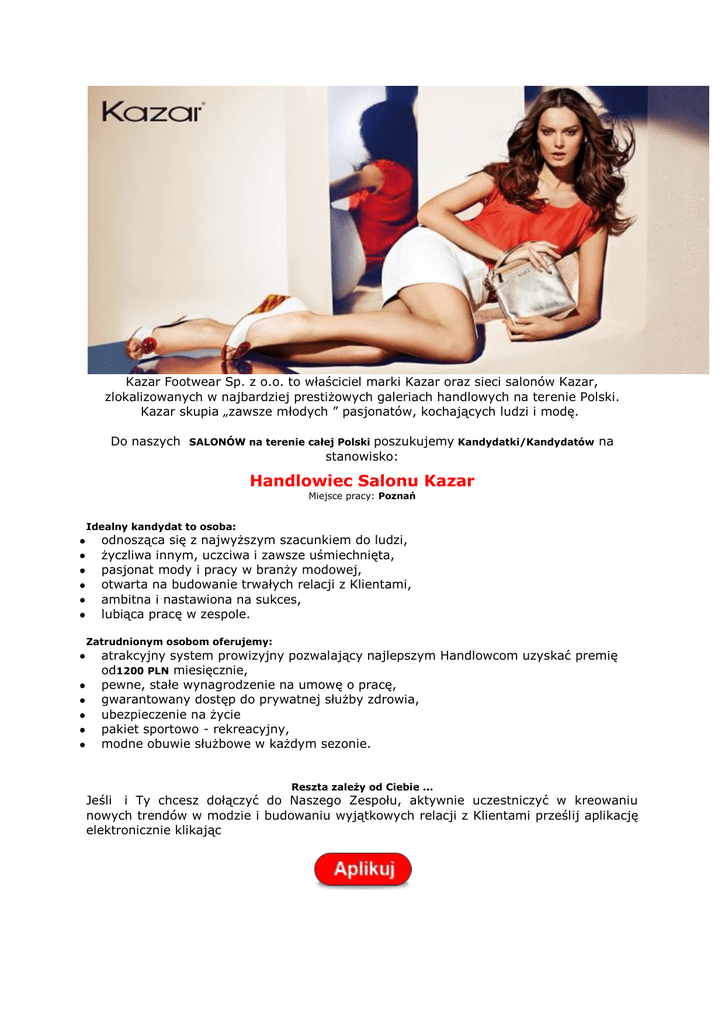 Kazar Footwear Sp. z o.o. to właściciel marki Kazar oraz sieci salonów Kazar, zlokalizowanych w najbardziej prestiżowych galeriach handlowych na terenie Polski. Kazar skupia „zawsze młodych ” pasjonatów, kochających ludzi i modę. Do naszych SALONÓW na terenie całej Polski poszukujemy Kandydatki/Kandydatów na stanowisko: Handlowiec Salonu Kazar Miejsce pracy: Poznań Idealny kandydat to osoba: odnosząca się z najwyższym szacunkiem do ludzi, życzliwa innym, uczciwa i zawsze uśmiechnięta, pasjonat mody i pracy w branży modowej, otwarta na budowanie trwałych relacji z Klientami, ambitna i nastawiona na sukces, lubiąca pracę w zespole. Zatrudnionym osobom oferujemy: atrakcyjny system prowizyjny pozwalający najlepszym Handlowcom uzyskać premię od1200 PLN miesięcznie, pewne, stałe wynagrodzenie na umowę o pracę, gwarantowany dostęp do prywatnej służby zdrowia, ubezpieczenie na życie pakiet sportowo - rekreacyjny, modne obuwie służbowe w każdym sezonie. Reszta zależy od Ciebie ... Jeśli i Ty chcesz dołączyć do Naszego Zespołu, aktywnie uczestniczyć w kreowaniu nowych trendów w modzie i budowaniu wyjątkowych relacji z Klientami prześlij aplikację elektronicznie klikając lub wejdź na naszą stronę www.kazar.com.pl i przekaż nam dokumenty za pomocą formularza zgłoszeniowego (zakładka Kariera). Prosimy o załączenie następującej klauzuli: „Wyrażam zgodę na przetwarzanie moich danych osobowych zawartych w ofercie pracy dla potrzeb procesu rekrutacji (zgodnie z ustawą z dnia 29.08.1997 r. o ochronie danych osobowych, Dz. U. z 2002 roku Nr 101 poz. 926)”. Uprzejmie informujemy, że skontaktujemy się wyłącznie z wybranymi osobami. Źródło / Aplikuj: http://www.pracuj.pl/praca/handlowiec-salonu-poznan,oferta,2805272