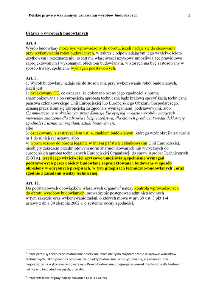 Polskie prawo o wzajemnym uznawaniu wyrobów budowlanych 1 Ustawa o wyrobach budowlanych Art. 4. Wyrób budowlany może być wprowadzony do obrotu, jeżeli nadaje się do stosowania przy wykonywaniu robót budowlanych, w zakresie odpowiadającym jego właściwościom użytkowym i przeznaczeniu, to jest ma właściwości użytkowe umożliwiające prawidłowo zaprojektowanym i wykonanym obiektom budowlanym, w których ma być zastosowany w sposób trwały, spełnienie wymagań podstawowych. Art. 5. 1. Wyrób budowlany nadaje się do stosowania przy wykonywaniu robót budowlanych, jeżeli jest: 1) oznakowany CE, co oznacza, że dokonano oceny jego zgodności z normą zharmonizowaną albo europejską aprobatą techniczną bądź krajową specyfikacją techniczną państwa członkowskiego Unii Europejskiej lub Europejskiego Obszaru Gospodarczego, uznaną przez Komisję Europejską za zgodną z wymaganiami podstawowymi, albo (2) umieszczony w określonym przez Komisję Europejską wykazie wyrobów mających niewielkie znaczenie dla zdrowia i bezpieczeństwa, dla których producent wydał deklarację zgodności z uznanymi regułami sztuki budowlanej), albo 3) oznakowany, z zastrzeżeniem ust. 4, znakiem budowlanym, którego wzór określa załącznik nr 1 do niniejszej ustawy, albo 4) wprowadzony do obrotu legalnie w innym państwie członkowskim Unii Europejskiej, nieobjęty zakresem przedmiotowym norm zharmonizowanych lub wytycznych do europejskich aprobat technicznych Europejskiej Organizacji do spraw Aprobat Technicznych (EOTA), jeżeli jego właściwości użytkowe umożliwiają spełnienie wymagań podstawowych przez obiekty budowlane zaprojektowane i budowane w sposób określony w odrębnych przepisach, w tym przepisach techniczno-budowlanych1, oraz zgodnie z zasadami wiedzy technicznej. Art. 12. Do podstawowych obowiązków właściwych organów2 należy kontrola wprowadzonych do obrotu wyrobów budowlanych, prowadzenie postępowań administracyjnych w tym zakresie oraz wykonywanie zadań, o których mowa w art. 39 ust. 3 pkt 1-4 ustawy z dnia 30 sierpnia 2002 r. o systemie oceny zgodności. 1 Przez przepisy techniczno-budowlane należy rozumieć nie tylko rozporządzenie w sprawie warunków technicznych, jakim powinny odpowiadać obiekty budowlane i ich usytuowanie, ale również inne rozporządzenia wykonawcze do ustawy – Prawo budowlane, obejmujące warunki techniczne dla budowli rolniczych, hydrotechnicznych, dróg itd. 2 Przez właściwe organy należy rozumieć UOKiK i GUNB Polskie prawo o wzajemnym uznawaniu wyrobów budowlanych 2 Ustawa – Prawo budowlane Art. 10. Wyroby wytworzone w celu zastosowania w obiekcie budowlanym w sposób trwały, o właściwościach użytkowych, umożliwiających prawidłowo zaprojektowanym i wykonanym obiektom budowlanym spełnienie wymagań podstawowych, o których mowa w art. 5 ust. 1 pkt 1, można stosować przy wykonywaniu robót budowlanych wyłącznie, jeżeli wyroby te zostały wprowadzone do obrotu zgodnie z przepisami odrębnymi3. Art. 25. Do podstawowych obowiązków inspektora nadzoru inwestorskiego należy: 1) reprezentowanie inwestora na budowie przez sprawowanie kontroli zgodności jej realizacji z projektem i pozwoleniem na budowę, przepisami oraz zasadami wiedzy technicznej; 2) sprawdzanie jakości wykonywanych robót i wbudowanych wyrobów budowlanych, a w szczególności zapobieganie zastosowaniu wyrobów budowlanych wadliwych i niedopuszczonych do stosowania w budownictwie;[…] Art. 26. Inspektor nadzoru inwestorskiego ma prawo: 1) wydawać kierownikowi budowy lub kierownikowi robót polecenia, potwierdzone wpisem do dziennika budowy, dotyczące: usunięcia nieprawidłowości lub zagrożeń, wykonania prób lub badań, także wymagających odkrycia robót lub elementów zakrytych, oraz przedstawienia ekspertyz dotyczących prowadzonych robót budowlanych i dowodów dopuszczenia do stosowania w budownictwie wyrobów budowlanych oraz urządzeń technicznych;[…] Art. 81c. 1. Organy administracji architektoniczno-budowlanej i nadzoru budowlanego przy wykonywaniu zadań określonych przepisami prawa budowlanego mogą żądać od uczestników procesu budowlanego, właściciela lub zarządcy obiektu budowlanego, informacji lub udostępnienia dokumentów: 1) związanych z prowadzeniem robót, przekazywaniem obiektu budowlanego do użytkowania, utrzymaniem i użytkowaniem obiektu budowlanego; 2) świadczących o dopuszczeniu wyrobu budowlanego do obrotu albo jednostkowego zastosowania w obiekcie budowlanym. Art. 84a. 1. Kontrola przestrzegania i stosowania przepisów prawa budowlanego obejmuje: 1) kontrolę zgodności wykonywania robót budowlanych z przepisami prawa budowlanego, projektem budowlanym i warunkami określonymi w decyzji o pozwoleniu na budowę; 2) sprawdzanie posiadania przez osoby pełniące samodzielne funkcje techniczne w budownictwie właściwych uprawnień do pełnienia tych funkcji; 3) sprawdzanie dopuszczenia do stosowania w budownictwie wyrobów budowlanych. 3 Przepisem odrębnym jest w tym przypadku ustawa o wyrobach budowlanych. Polskie prawo o wzajemnym uznawaniu wyrobów budowlanych 3 Komentarz Wzajemne uznawanie wyrobów budowlanych wg zasad określonych w Traktacie o Funkcjonowaniu Unii Europejskiej (art. 34-36) dotyczy przede wszystkim wyrobów konsumpcyjnych i z zasady nie obejmuje wyrobów objętych harmonizacją europejską, które mają wpływ na spełnienie choćby jednego wymagania podstawowego. Ustawa o wyrobach budowlanych - potwierdzając zasady traktatowe - daje możliwość umieszczania na polskim rynku wyrobów budowlanych wprowadzonych legalnie do obrotu w innych państwach UE, nie czyni jednak tego mechanicznie, bowiem stawia wymaganie aby właściwości użytkowe takich wyrobów umożliwiały spełnienie krajowych przepisów. Ustawa o wyrobach budowlanych nie wskazuje jednak, jakimi dokumentami należy udowodnić spełnienie krajowych przepisów. Jednocześnie ustawa precyzuje, że zasad
