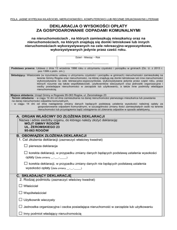POLA JASNE WYPEŁNIA WŁAŚCICIEL NIERUCHOMOŚCI, KOMPUTEROWO LUB RĘCZNIE DRUKOWANYMI LITERAMI DEKLARACJA O WYSOKOŚCI OPŁATY ZA GOSPODAROWANIE ODPADAMI KOMUNALNYMI na nieruchomościach , na których zamieszkują mieszkańcy oraz na nieruchomościach, na których znajdują się domki letniskowe lub innych nieruchomościach wykorzystywanych na cele rekreacyjno-wypoczynkowe, wykorzystywanych jedynie przez cześć roku. Dzień - Miesiąc – Rok _________-_________-___________ Podstawa prawna: Ustawa z dnia 13 września 1996 roku o utrzymaniu czystości i porządku w gminach (Dz. U. z 2013 r. poz.1399 z późn. zm.); Składający: Właściciele (w rozumieniu ustawy o utrzymaniu czystości i porządku w gminach) nieruchomości zamieszkałej na terenie Gminy Rogów oraz nieruchomości, na której znajdują się domki letniskowe lub inne nieruchomości wykorzystywane na cele rekreacyjno-wypoczynkowe, wykorzystywane jedynie przez część roku, przez których rozumie się także współwłaścicieli, użytkowników wieczystych oraz jednostki organizacyjne i osoby posiadające nieruchomości w zarządzie lub użytkowaniu, a także inne podmioty władające nieruchomością; Miejsce składania: Urząd Gminy w Rogowie 95-063 Rogów, ul. Żeromskiego 23 Termin składania: - w ciągu 14 dni od dnia zamieszkania na danej nieruchomości pierwszego mieszkańca lub powstania na danej nieruchomości odpadów komunalnych, - w ciągu 14 dni od dnia nastąpienia zmiany danych będących podstawą ustalenia wysokości należnej opłaty za gospodarowanie odpadami komunalnymi, w szczególności zmiany ilości zamieszkałych osób na terenie nieruchomości lub przystąpienia bądź odstąpienia od zbierania odpadów w sposób selektywny, A. ORGAN WŁAŚCIWY DO ZŁOŻENIA DEKLARACJI Nazwa i adres siedziby organu, do którego należy złożyć deklarację: WÓJT GMINY ROGÓW UL. ŻEROMSKIEGO 23 95-063 ROGÓW B. OBOWIĄZEK ZŁOŻENIA DEKLARACJI 1. Cel złożenia deklaracji (zaznaczyć właściwy kwadrat) □ pierwsza deklaracja □ korekta deklaracji, w przypadku zmiany danych będących podstawą ustalenia wysokości opłaty (data zmiany __-___-_____) □ korekta deklaracji, w przypadku zmiany danych nie będących podstawą ustalenia wysokości opłaty (data zmiany __-__-_____) C. SKŁADAJĄCY DEKLARACJĘ 2. Rodzaj podmiotu (zaznaczyć właściwy kwadrat) □ Właściciel □ Współwłaściciel □ Użytkownik wieczysty □ Jednostka organizacyjna i osoba posiadająca nieruchomość w zarządzie lub użytkowaniu □ Inny podmiot władający nieruchomością D. DANE IDENTYFIKACYJNE D.1. Osoba fizyczna 4. Imię/Imiona 3. Nazwisko 5. Data urodzenia 6. PESEL 7. Telefon 8. Adres poczty elektronicznej 12. Telefon 13. Adres poczty elektronicznej D.2. Pozostałe podmioty 9. Imię i nazwisko/ Pełna nazwa 10. NIP 11. REGON D.3. Adres zamieszkania/ Adres siedziby 14. Kraj 15. Województwo 16. Powiat 17. Gmina 18. Ulica 19. Nr domu 21. Miejscowość 22. Kod pocztowy 23. Poczta D.3. Adres do korespondencji 24. Kraj 25. Województwo 26. Powiat 27. Gmina 28. Ulica 29. Nr domu 31. Miejscowość 32. Kod pocztowy 33. Poczta 20. Nr lokalu 30. Nr lokalu E. RODZAJ NIERUCHOMOŚCI, NA KTÓREJ POWSTAJĄ ODPADY KOMUNALNE 34. □ nieruchomość zamieszkała □ 35. nieruchomość, na której znajdują się domki letniskowe lub inne nieruchomości wykorzystywane na cele rekreacyjno-wypoczynkowe, wykorzystywane jedynie przez część roku E.1. ADRES NIERUCHOMOŚCI, NA KTÓREJ POWSTAJĄ ODPADY KOMUNALNE 36. Miejscowość/Ulica 37. Nr domu 38. Nr lokalu F. OŚWIADCZAM, ŻE ODPADY KOMUNALNE POWSTAJĄCE NA NIERUCHOMOŚCI WSKAZANEJ W CZĘŚCI E.1. ZBIERANE I ODBIERANE BĘDĄ W SPOSÓB (należy zaznaczyć odpowiedni kwadrat znakiem x): 39. □ selektywny □ nieselektywny G. 1. OBLICZENIE WYSOKOŚCI OPŁATY DLA NIERUCHOMOŚCI WSKAZANEJ W CZĘŚCI E poz. 34: 40. Oświadczam, że na terenie nieruchomości wskazanej w poz. 34 niniejszej deklaracji zamieszkuje ……………. osób (podać liczbę mieszkańców) 41. Stawka opłaty za osobę określona w uchwale Rady Gminy w Rogowie w sprawie wyboru metody ustalenia opłaty za gospodarowanie odpadami komunalnymi oraz ustalenia stawki tej opłaty: □ opłata za odpady zbierane w sposób selektywny wynosi od jednego mieszkańca miesięcznie: …….. zł (zaznaczyć jeśli wybrano selektywny w poz. 39) □ opłata za odpady zbierane w sposób nieselektywny wynosi od jednego mieszkańca miesięcznie: ….…… zł (zaznaczyć jeśli wybrano zmieszany w poz. 39) 42. Miesięczna kwota opłaty (iloczyn liczby osób wskazanych w poz. 40 i kwoty z poz.41) 43.. G. 2. OBLICZENIE WYSOKOŚCI OPŁATY DLA NIERUCHOMOŚCI WSKAZANEJ W CZĘŚCI E poz. 35: 44. Oświadczam, że na terenie nieruchomości wskazanej w poz. 35 niniejszej deklaracji znajduje się ……………. (podać liczbę) domków letniskowych lub innych nieruchomości wykorzystywanych na cele rekreacyjno-wypoczynkowe, wykorzystywanych jedynie przez część roku. 45. Ryczałtowa roczna stawka opłaty od jednego domku letniskowego lub innej nieruchomości wykorzystywanej na cele rekreacyjno-wypoczynkowe, wykorzystywanej jedynie przez część roku, określona w uchwale Rady Gminy w Rogowie w sprawie wyboru metody ustalenia opłaty za gospodarowanie odpadami komunalnymi oraz ustalenia stawki tej opłaty: □ opłata za odpady zbierane w sposób selektywny wynosi od jednego domku letniskowego miesięcznie: ……... zł □ opłata za odpady zbierane w sposób nieselektywny wynosi od jednego domku letniskowego miesięcznie: …….... zł 46. Miesięczna kwota opłaty (iloczyn liczby 47. nieruchomości z poz. 44 i kwoty z poz.45) ……………………. zł H. PODPIS OSOBY SKŁADAJACEJ DEKLARACJĘ 48. Data 49. Podpis składającego deklarację/osoby występującej w imieniu składającego deklarację I. ADNOTACJE ORGANU J. DATA I PODPIS PRZYJMUJĄCEGO FORMULARZ POUCZENIE 1. Stosownie do art. 6n ustawy z dnia 13 września 1996 roku o utrzymaniu 