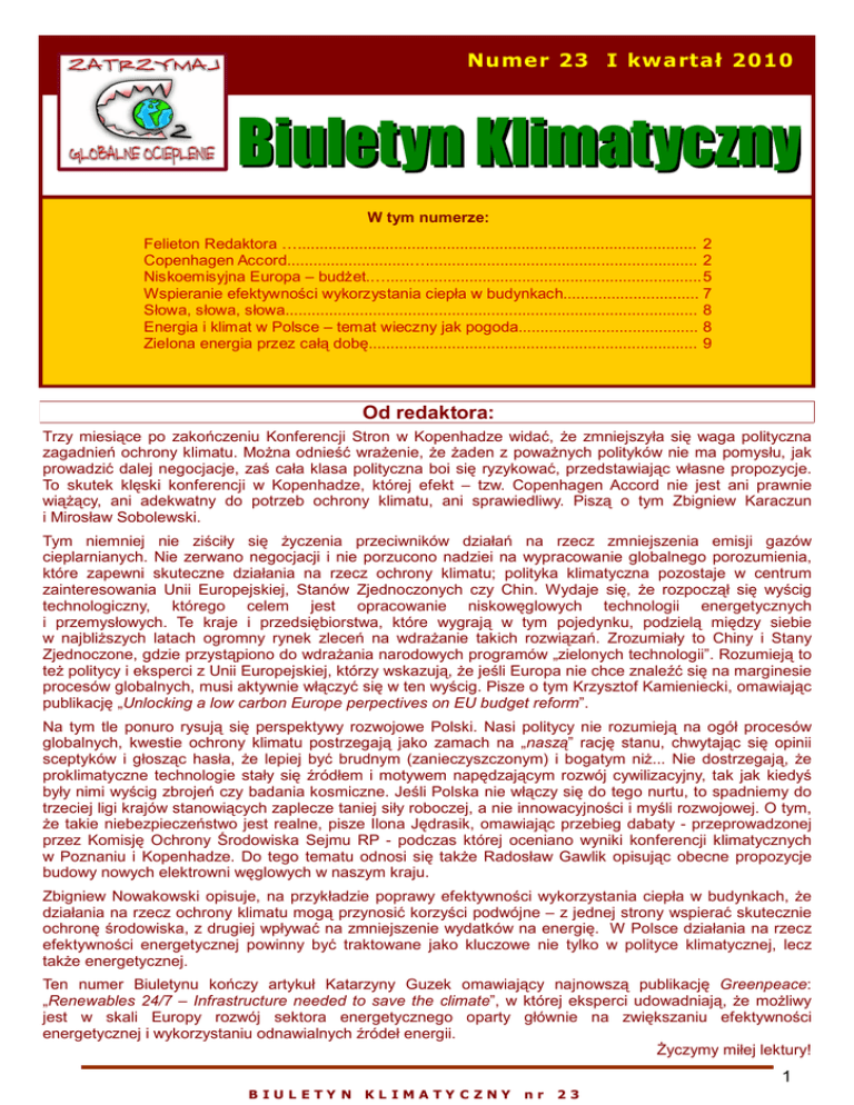 Numer 23 I kwartał 2010 Biuletyn Klimatyczny W tym numerze: Felieton Redaktora …........................................................................................... 2 Copenhagen Accord............................….............................................................. 2 Niskoemisyjna Europa – budżet.…........................................................................5 Wspieranie efektywności wykorzystania ciepła w budynkach............................... 7 Słowa, słowa, słowa.............................................................................................. 8 Energia i klimat w Polsce – temat wieczny jak pogoda......................................... 8 Zielona energia przez całą dobę........................................................................... 9 Od redaktora: Trzy miesiące po zakończeniu Konferencji Stron w Kopenhadze widać, że zmniejszyła się waga polityczna zagadnień ochrony klimatu. Można odnieść wrażenie, że żaden z poważnych polityków nie ma pomysłu, jak prowadzić dalej negocjacje, zaś cała klasa polityczna boi się ryzykować, przedstawiając własne propozycje. To skutek klęski konferencji w Kopenhadze, której efekt – tzw. Copenhagen Accord nie jest ani prawnie wiążący, ani adekwatny do potrzeb ochrony klimatu, ani sprawiedliwy. Piszą o tym Zbigniew Karaczun i Mirosław Sobolewski. Tym niemniej nie ziściły się życzenia przeciwników działań na rzecz zmniejszenia emisji gazów cieplarnianych. Nie zerwano negocjacji i nie porzucono nadziei na wypracowanie globalnego porozumienia, które zapewni skuteczne działania na rzecz ochrony klimatu; polityka klimatyczna pozostaje w centrum zainteresowania Unii Europejskiej, Stanów Zjednoczonych czy Chin. Wydaje się, że rozpoczął się wyścig technologiczny, którego celem jest opracowanie niskowęglowych technologii energetycznych i przemysłowych. Te kraje i przedsiębiorstwa, które wygrają w tym pojedynku, podzielą między siebie w najbliższych latach ogromny rynek zleceń na wdrażanie takich rozwiązań. Zrozumiały to Chiny i Stany Zjednoczone, gdzie przystąpiono do wdrażania narodowych programów „zielonych technologii”. Rozumieją to też politycy i eksperci z Unii Europejskiej, którzy wskazują, że jeśli Europa nie chce znaleźć się na marginesie procesów globalnych, musi aktywnie włączyć się w ten wyścig. Pisze o tym Krzysztof Kamieniecki, omawiając publikację „Unlocking a low carbon Europe perpectives on EU budget reform”. Na tym tle ponuro rysują się perspektywy rozwojowe Polski. Nasi politycy nie rozumieją na ogół procesów globalnych, kwestie ochrony klimatu postrzegają jako zamach na „naszą” rację stanu, chwytając się opinii sceptyków i głosząc hasła, że lepiej być brudnym (zanieczyszczonym) i bogatym niż... Nie dostrzegają, że proklimatyczne technologie stały się źródłem i motywem napędzającym rozwój cywilizacyjny, tak jak kiedyś były nimi wyścig zbrojeń czy badania kosmiczne. Jeśli Polska nie włączy się do tego nurtu, to spadniemy do trzeciej ligi krajów stanowiących zaplecze taniej siły roboczej, a nie innowacyjności i myśli rozwojowej. O tym, że takie niebezpieczeństwo jest realne, pisze Ilona Jędrasik, omawiając przebieg dabaty - przeprowadzonej przez Komisję Ochrony Środowiska Sejmu RP - podczas której oceniano wyniki konferencji klimatycznych w Poznaniu i Kopenhadze. Do tego tematu odnosi się także Radosław Gawlik opisując obecne propozycje budowy nowych elektrowni węglowych w naszym kraju. Zbigniew Nowakowski opisuje, na przykładzie poprawy efektywności wykorzystania ciepła w budynkach, że działania na rzecz ochrony klimatu mogą przynosić korzyści podwójne – z jednej strony wspierać skutecznie ochronę środowiska, z drugiej wpływać na zmniejszenie wydatków na energię. W Polsce działania na rzecz efektywności energetycznej powinny być traktowane jako kluczowe nie tylko w polityce klimatycznej, lecz także energetycznej. Ten numer Biuletynu kończy artykuł Katarzyny Guzek omawiający najnowszą publikację Greenpeace: „Renewables 24/7 – Infrastructure needed to save the climate”, w której eksperci udowadniają, że możliwy jest w skali Europy rozwój sektora energetycznego oparty głównie na zwiększaniu efektywności energetycznej i wykorzystaniu odnawialnych źródeł energii. Życzymy miłej lektury! 1 B IUL ETY N KL IMATY C ZNY nr 23 Felieton Redaktora Jestem na tyle stary, że już nic nie powinno mnie dziwić. A jednak. Od lat zadziwia mnie niedojrzałość polskiej klasy politycznej i jej krótkowzroczność. I cały czas nie mogę przestać się dziwić. Dziś, gdy na całym świecie rządy podejmują decyzje o budowie innowacyjnej, efektywnej i opartej na niewęglowych paliwach gospodarki, większość krajowych polityków walczy o przemysł węglowy. Nie przyjmują oni do wiadomości rad i zaleceń ekspertów wskazujących, że ten kierunek rozwoju prowadzi na manowce, zwraca Polskę w stronę ekonomicznego skansenu. Nie rozumieją oni, że taka polityka nie służy przedsiębiorcom, którzy muszą prowadzić w Polsce działalność w warunkach rosnącej niepewności, mamieni obietnicami, że politycy nie dopuszczą do wprowadzenia w Polsce ograniczeń dla rozwoju energetyki węglowej. W praktyce okazuje się, że nie mają oni nic do powiedzenia, gdyż decyzje zapadają poza naszym krajem, a my się musimy do nich po prostu dostosować. Brak nam bowiem umiejętności i przezorności, by w porę zaproponować rozwiązania, które nie są sprzeczne z proponowanym celem działania, a z drugiej strony akceptowalne nie tylko dla Polski, lecz także dla innych krajów. Alternatywą jest wystąpienie z Unii Europejskiej, albo opuszczenie agend ONZ (zdarzają się głosy polityków wzywających do wystąpienia z UE – pisze o tym w dalszej części Biuletynu Ilona Jędrasik). Przemysł nie lubi być zaskak