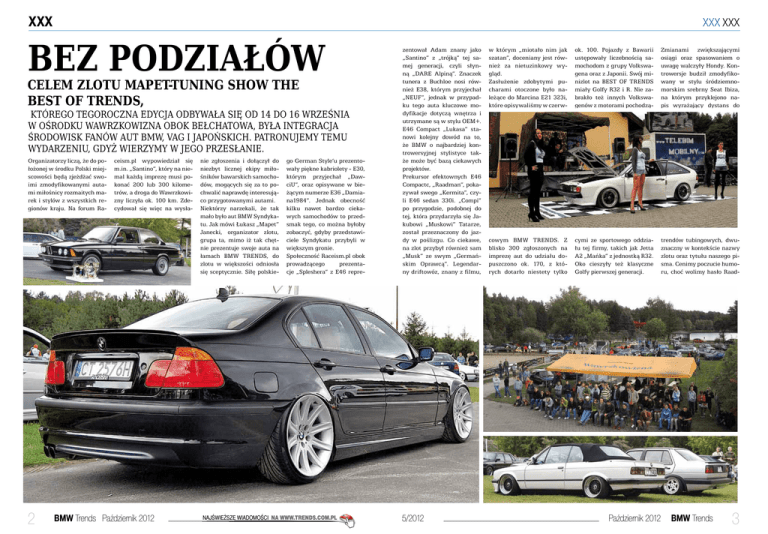 XXX Bez podziałów Celem zlotu Mapet-Tuning Show THE BEST OF TRENDS, którego tegoroczna edycja odbywała się od 14 do 16 września w ośrodku Wawrzkowizna obok Bełchatowa, była integracja środowisk fanów aut BMW, VAG i japońskich. Patronujemy temu wydarzeniu, gdyż wierzymy w jego przesłanie. Organizatorzy liczą, że do położonej w środku Polski miejscowości będą zjeżdżać swoimi zmodyfikowanymi autami miłośnicy rozmaitych marek i stylów z wszystkich regionów kraju. Na forum Ra- 2 ceism.pl wypowiedział się m.in. „Santino”, który na niemal każdą imprezę musi pokonać 200 lub 300 kilometrów, a droga do Wawrzkowizny liczyła ok. 100 km. Zdecydował się więc na wysła- BMW Trends Październik 2012 nie zgłoszenia i dołączył do niezbyt licznej ekipy miłośników bawarskich samochodów, mogących się za to pochwalić naprawdę interesująco przygotowanymi autami. Niektórzy narzekali, że tak mało było aut BMW Syndykatu. Jak mówi Łukasz „Mapet” Janecki, organizator zlotu, grupa ta, mimo iż tak chętnie prezentuje swoje auta na łamach BMW TRENDS, do zlotu w większości odniosła się sceptycznie. Siłę polskie- go German Style’u prezentowały piękne kabriolety - E30, którym przyjechał „DawciU”, oraz opisywane w bieżącym numerze E36 „Damiana1984”. Jednak obecność kilku nawet bardzo ciekawych samochodów to przedsmak tego, co można byłoby zobaczyć, gdyby przedstawiciele Syndykatu przybyli w większym gronie. Społeczność Raceism.pl obok prowadzącego prezentacje „Spleshera” z E46 repre- NAJŚWIEŻSZE WIADOMOŚCI NA WWW.TRENDS.COM.PL XXX XXX zentował Adam znany jako „Santino” z „trójką” tej samej generacji, czyli słynną „DARE Alpiną”. Znaczek tunera z Buchloe nosi również E38, którym przyjechał „NEUF”, jednak w przypadku tego auta kluczowe modyfikacje dotyczą wnętrza i utrzymane są w stylu OEM+. E46 Compact „Lukasa” stanowi kolejny dowód na to, że BMW o najbardziej kontrowersyjnej stylistyce także może być bazą ciekawych projektów. Prekursor efektownych E46 Compactc, „Raadman”, pokazywał swego „Kermita”, czyli E46 sedan 330i. „Compi” po przygodzie, podobnej do tej, która przydarzyła się Jakubowi „Muskowi” Tatarze, został przeznaczony do jazdy w poślizgu. Co ciekawe, na zlot przybył również sam „Musk” ze swym „Germańskim Oprawcą”. Legendarny driftowóz, znany z filmu, 5/2012 w którym „miotało nim jak szatan”, doceniany jest również za nietuzinkowy wygląd. Zasłużenie zdobytymi pucharami otoczone było należące do Marcina E21 323i, które opisywaliśmy w czerw- ok. 100. Pojazdy z Bawarii ustępowały liczebnością samochodom z grupy Volkswagena oraz z Japonii. Swój minizlot na BEST OF TRENDS miały Golfy R32 i R. Nie zabrakło też innych Volkswagenów z motorami pochodzą- Zmianami zwiększającymi osiągi oraz spasowaniem o uwagę walczyły Hondy. Kontrowersje budził zmodyfikowany w stylu śródziemnomorskim srebrny Seat Ibiza, na którym przyklejono napis wyrażający dystans do cowym BMW TRENDS. Z blisko 300 zgłoszonych na imprezę aut do udziału dopuszczono ok. 170, z których dotarło niestety tylko cymi ze sportowego oddziału tej firmy, takich jak Jetta A2 „Mańka” z jednostką R32. Oko cieszyły też klasyczne Golfy pierwszej generacji. trendów tubingowych, dwuznaczny w kontekście nazwy zlotu oraz tytułu naszego pisma. Cenimy poczucie humoru, choć wolimy hasło Raad- Październik 2012 BMW Trends 3 XXX XXX XXX mana: „Set trends, do not follow them”. Mimo starań „Mapeta” na skutek awarii samochodu ekipy Illegal-D uczestnicy nie mogli podziwiać driftingu w skali 1:10 i główną atrakcją pozostały prezentacje aut. Dużą widownię zgromadziło „air SHOW”, czyli pokaz możliwości aut z zawieszeniami pneumatycznymi. Chwilę po jego rozpoczęciu trudno było znaleźć miejsce umożliwiające obejrzenie tej części imprezy. Fundatorem nagród za najlepiej działające air-ride’y była firma airRIDE-System.pl, która we współpracy z Mapet-TUNING group, AP Sportfahrwerke, Meguiar’s i MTP Sport Brake Discs sponsorowała również kategorię Sweet Sixteen The BEST OF TRENDS, czyli wyróżnienia dla właścicieli szesnastu najciekawszych aut zlotu. Mapet-TUNING.com wspierane przez DragWheels nagradzało też najbardziej efektowne koła. Wyróżnienie za zmiany mechaniczne przyznawała firma G-Lab zajmująca się tuningiem elektronicznym oraz udostępniająca hamownię. Oferujące felgi i opony auto motor PROJECT sponsorowało kategorię Najlepszy negatyw, czyli The BEST Of Camber. Upominki za najciekawszą komorę silnika dostarczył Mapet-TUNING powered by Meguiar’s. Dla posiadaczy aut o najlepiej utrzymanych i zmody- 4 fikowanych wnętrzach nagrody, którymi było obszycie lub pokrycie elementów karbonem, przygotowało Carsdream. Szczególnie cenionym prezentem okazały się szklanki z grawerowanym logo zlotu. Prosty, a zarazem przydatny gadżet bardzo przypadł do gustu uczestnikom. Integracyjna część imprezy była w tym roku nieoficjalna, ale odgrywa istotną rolę w planach kolejnej edycji. Założyciel forum Raceism. pl, Splesher, w relacji z Mapet-Tuning Show THE BEST OF TRENDS proponuje nam połączenie magazynów TRENDS w jeden, bez podziałów na marki, gdyż jego zdaniem, takich podziałów już nie ma. My zaś sądzimy, że społeczność miłośników motoryzacji byłaby mniej barwna bez osób, które wiążą się z ulubioną marką na całe życie. Zlot dowiódł jednak, że można zintegrować na pozór zupełnie odmienne środowiska. Warto zatem wybrać się na tego typu imprezę, podejrzeć, co interesuje miłośników innych samochodów czy stylów i znaleźć z nimi wspólny język. Pozostając przy swoich upodobaniach można doceniać podobną, choć odmiennie wyrażaną pasję. Andrzej Szczodrak Fot. Piotr Mokwiński BMW Trends Październik 2012 NAJŚWIEŻSZE WIADOMOŚCI NA WW