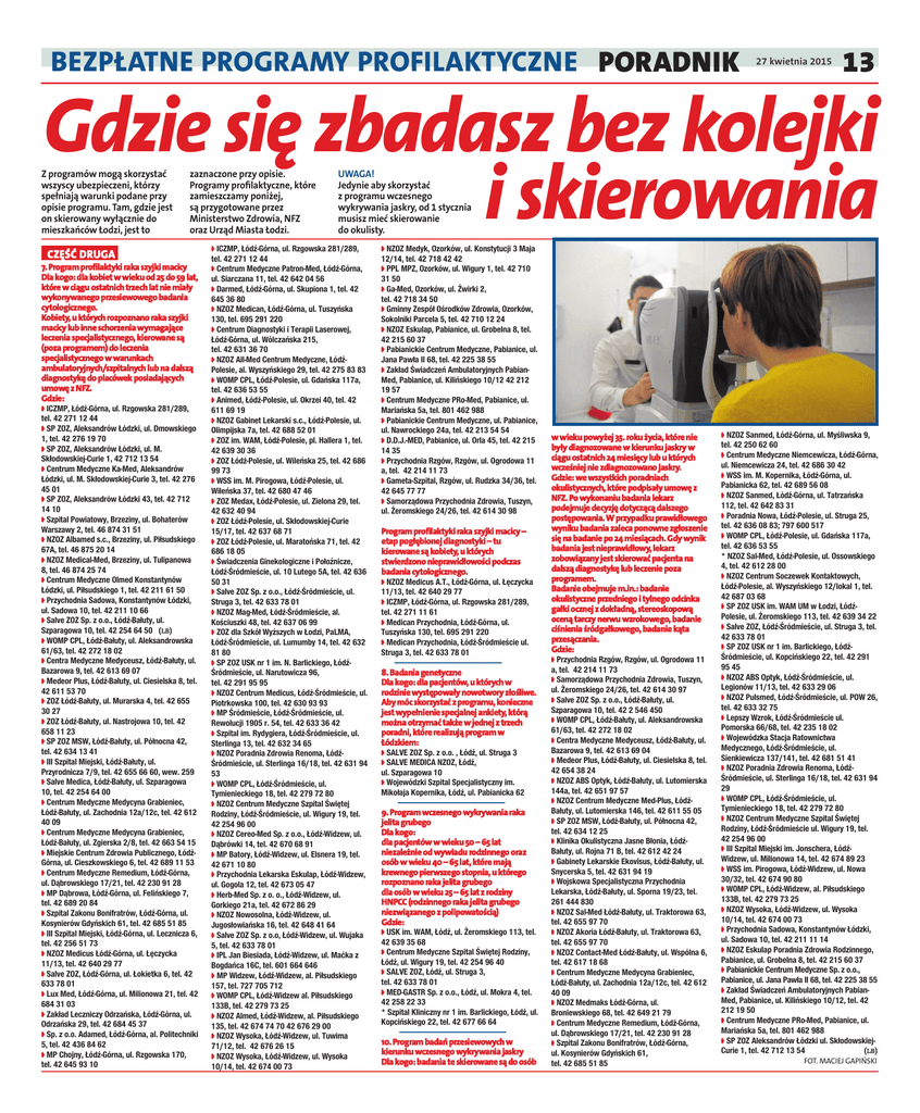 BEzPŁaTNE PrOgraMY PrOFILaKTYCzNE PORADNIK 27 kwietnia 2015 13 Gdzie się zbadasz bez kolejki i skierowania Z programów mogą skorzystać wszyscy ubezpieczeni, którzy spełniają warunki podane przy opisie programu. Tam, gdzie jest on skierowany wyłącznie do mieszkańców Łodzi, jest to zaznaczone przy opisie. Programy prolaktyczne, które zamieszczamy poniżej, są przygotowane przez Ministerstwo Zdrowia, NFZ oraz Urząd Miasta Łodzi. Część d ruga 7. Program profilaktyki raka szyjki macicy dla kogo: dla kobiet w wieku od 25 do 59 lat, które w ciągu ostatnich trzech lat nie miały wykonywanego przesiewowego badania cytologicznego. Kobiety, u których rozpoznano raka szyjki macicy lub inne schorzenia wymagające leczenia specjalistycznego, kierowane są (poza programem) do leczenia specjalistycznego w warunkach ambulatoryjnych/szpitalnych lub na dalszą diagnostykę do placówek posiadających umowę z NFz. gdzie: l ICZMP, Łódź-Górna, ul. Rzgowska 281/289, tel. 42 271 12 44 l SP ZOZ, Aleksandrów Łódzki, ul. Dmowskiego 1, tel. 42 276 19 70 l SP ZOZ, Aleksandrów Łódzki, ul. M. Skłodowskiej-Curie 1, 42 712 13 54 l Centrum Medyczne Ka-Med, Aleksandrów Łódzki, ul. M. Skłodowskiej-Curie 3, tel. 42 276 45 01 l SP ZOZ, Aleksandrów Łódzki 43, tel. 42 712 14 10 l Szpital Powiatowy, Brzeziny, ul. Bohaterów Warszawy 2, tel. 46 874 31 51 l NZOZ Albamed s.c., Brzeziny, ul. Piłsudskiego 67A, tel. 46 875 20 14 l NZOZ Medical-Med, Brzeziny, ul. Tulipanowa 8, tel. 46 874 25 74 l Centrum Medyczne Olmed Konstantynów Łódzki, ul. Piłsudskiego 1, tel. 42 211 61 50 l Przychodnia Sadowa, Konstantynów Łódzki, ul. Sadowa 10, tel. 42 211 10 66 l Salve ZOZ Sp. z o.o., Łódź-Bałuty, ul. Szparagowa 10, tel. 42 254 64 50 (LB) l WOMP CPL, Łódź-Bałuty, ul. Aleksandrowska 61/63, tel. 42 272 18 02 l Centra Medyczne Medyceusz, Łódź-Bałuty, ul. Bazarowa 9, tel. 42 613 69 07 l Medeor Plus, Łódź-Bałuty, ul. Ciesielska 8, tel. 42 611 53 70 l ZOZ Łódź-Bałuty, ul. Murarska 4, tel. 42 655 30 27 l ZOZ Łódź-Bałuty, ul. Nastrojowa 10, tel. 42 658 11 23 l SP ZOZ MSW, Łódź-Bałuty, ul. Północna 42, tel. 42 634 13 41 l III Szpital Miejski, Łódź-Bałuty, ul. Przyrodnicza 7/9, tel. 42 655 66 60, wew. 259 l Salve Medica, Łódź-Bałuty, ul. Szparagowa 10, tel. 42 254 64 00 l Centrum Medyczne Medycyna Grabieniec, Łódź-Bałuty, ul. Zachodnia 12a/12c, tel. 42 612 40 09 l Centrum Medyczne Medycyna Grabieniec, Łódź-Bałuty, ul. Zgierska 2/8, tel. 42 663 54 15 l Miejskie Centrum Zdrowia Publicznego, ŁódźGórna, ul. Cieszkowskiego 6, tel. 42 689 11 53 l Centrum Medyczne Remedium, Łódź-Górna, ul. Dąbrowskiego 17/21, tel. 42 230 91 28 l MP Dąbrowa, Łódź-Górna, ul. Felińskiego 7, tel. 42 689 20 84 l Szpital Zakonu Bonifratrów, Łódź-Górna, ul. Kosynierów Gdyńskich 61, tel. 42 685 51 85 l III Szpital Miejski, Łódź-Górna, ul. Lecznicza 6, tel. 42 256 51 73 l NZOZ Medicus Łódź-Górna, ul. Łęczycka 11/13, tel. 42 640 29 77 l Salve ZOZ, Łódź-Górna, ul. Łokietka 6, tel. 42 633 78 01 l Lux Med, Łódź-Górna, ul. Milionowa 21, tel. 42 684 31 03 l Zakład Leczniczy Odrzańska, Łódź-Górna, ul. Odrzańska 29, tel. 42 684 45 37 l Sp. z o.o. Adamed, Łódź-Górna, al. Politechniki 5, tel. 42 436 84 62 l MP Chojny, Łódź-Górna, ul. Rzgowska 170, tel. 42 645 93 10 UWAGA! Jedynie aby skorzystać z programu wczesnego wykrywania jaskry, od 1 stycznia musisz mieć skierowanie do okulisty. l ICZMP, Łódź-Górna, ul. Rzgowska 281/289, tel. 42 271 12 44 l Centrum Medyczne Patron-Med, Łódź-Górna, ul. Siarczana 11, tel. 42 642 04 56 l Darmed, Łódź-Górna, ul. Skupiona 1, tel. 42 645 36 80 l NZOZ Medican, Łódź-Górna, ul. Tuszyńska 130, tel. 695 291 220 l Centrum Diagnostyki i Terapii Laserowej, Łódź-Górna, ul. Wólczańska 215, tel. 42 631 36 70 l NZOZ All-Med Centrum Medyczne, ŁódźPolesie, al. Wyszyńskiego 29, tel. 42 275 83 83 l WOMP CPL, Łódź-Polesie, ul. Gdańska 117a, tel. 42 636 53 55 l Animed, Łódź-Polesie, ul. Okrzei 40, tel. 42 611 69 19 l NZOZ Gabinet Lekarski s.c., Łódź-Polesie, ul. Olimpijska 7a, tel. 42 688 52 01 l ZOZ im. WAM, Łódź-Polesie, pl. Hallera 1, tel. 42 639 30 36 l ZOZ Łódź-Polesie, ul. Wileńska 25, tel. 42 686 99 73 l WSS im. M. Pirogowa, Łódź-Polesie, ul. Wileńska 37, tel. 42 680 47 46 l ZOZ Medax, Łódź-Polesie, ul. Zielona 29, tel. 42 632 40 94 l ZOZ Łódź-Polesie, ul. Skłodowskiej-Curie 15/17, tel. 42 637 68 71 l ZOZ Łódź-Polesie, ul. Maratońska 71, tel. 42 686 18 05 l Świadczenia Ginekologiczne i Położnicze, Łódź-Śródmieście, ul. 10 Lutego 5A, tel. 42 636 50 31 l Salve ZOZ Sp. z o.o., Łódź-Śródmieście, ul. Struga 3, tel. 42 633 78 01 l NZOZ Mag-Med, Łódź-Śródmieście, al. Kościuszki 48, tel. 42 637 06 99 l ZOZ dla Szkół Wyższych w Łodzi, PaLMA, Łódź-Śródmieście, ul. Lumumby 14, tel. 42 632 81 80 l SP ZOZ USK nr 1 im. N. Barlickiego, ŁódźŚródmieście, ul. Narutowicza 96, tel. 42 291 95 95 l NZOZ Centrum Medicus, Łódź-Śródmieście, ul. Piotrkowska 100, tel. 42 630 93 93 l MP Śródmieście, Łódź-Śródmieście, ul. Rewolucji 1905 r. 54, tel. 42 633 36 42 l Szpital im. Rydygiera, Łódź-Śródmieście, ul. Sterlinga 13, tel. 42 632 34 65 l NZOZ Poradnia Zdrowia Renoma, ŁódźŚródmieście, ul. Sterlinga 16/18, tel. 42 631 94 53 l WOMP CPL, Łódź-Śródmieście, ul. Tymienieckiego 18, tel. 42 279 72 80 l NZOZ Centrum Medyczne Szpital Świętej Rodziny, Łódź-Śródmieście, ul. Wigury 19, tel. 42 254 96 00 l NZOZ Cereo-Med Sp. z o.o., Łódź-Widzew, ul. Dąbrówki 14, tel. 42 670 68 91 l MP Batory, Łódź-Widzew, ul. Elsnera 19, tel. 42 671 10 80 l Przychodnia Lekarska Eskulap, Łódź-Widzew, ul. Gogola 12, tel. 42 673 05 47 l Herb-Med Sp. z o. o., Łódź-Widzew, ul. Gorkiego 21a, tel. 42 672 86 29 l NZOZ Nowosolna, Łódź-Widzew, ul. Jugosłowiańska 16, tel. 42 648 41 64 l Salve ZOZ Sp. z o.o, Łódź-Widzew, ul. Wujaka 5, 