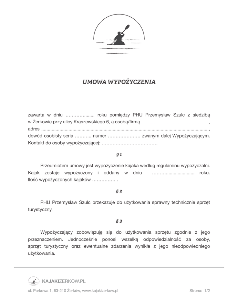 UMOWA WYPOŻYCZENIA zawarta w dniu …………........ roku pomiędzy PHU Przemysław Szulc z siedzibą w Żerkowie przy ulicy Kraszewskiego 6, a osobą/firmą....................................................., adres ................................................................................................................................., dowód osobisty seria ……….. numer ………………… zwanym dalej Wypożyczającym. Kontakt do osoby wypożyczającej: ……………………………… §1 Przedmiotem umowy jest wypożyczenie kajaka według regulaminu wypożyczalni. Kajak zostaje wypożyczony i oddany w dniu ………...................... roku. Ilość wypożyczonych kajaków …………… . §2 PHU Przemysław Szulc przekazuje do użytkowania sprawny technicznie sprzęt turystyczny. §3 Wypożyczający zobowiązuję się do użytkowania sprzętu zgodnie z jego przeznaczeniem. Jednocześnie ponosi wszelką odpowiedzialność za osoby, sprzęt turystyczny oraz ewentualne zdarzenia wynikłe z jego nieodpowiedniego użytkowania. KAJAKIZERKOW.PL ul. Parkowa 1, 63-210 Żerków, www.kajakizerkow.pl Strona: 1/2 §4 Za uszkodzenia powstałe z nieodpowiedniego korzystania z wypożyczonego sprzętu winę ponosi Wypożyczający, on także pokrywa koszty związane z naprawą sprzętu. PHU Przemysław Szulc zastrzega sobie możliwość odmowy przyjęcia sprzętu w momencie, gdy uszkodzenia będą tak znaczne, że naprawa sprzętu stanie się nieopłacalna. W takim przypadku Wypożyczający zobowiązuje się do zapłaty całej wartości wypożyczonego sprzętu według rachunków przedstawionych przez PHU Przemysław Szulc. Ceny nowego sprzętu: kajak 2700zl, wiosło 150-200zl, kamizelka ratunkowa 120zl. §5 Zrzekam się wszelkich roszczeń wobec PHU Przemysław Szulc z tytułu wypadków, poniesionych szkód lub obrażeń powstałych w trakcie korzystania z wypożyczonego sprzętu turystycznego. §6 Oświadczam, że zapoznałem/am się z regulaminem wypożyczalni. §7 Kontakt telefoniczny do PHU Przemysław Szulc: 501 793 468 .............................................. Przemysław Szulc .............................................. Wypożyczający KAJAKIZERKOW.PL ul. Parkowa 1, 63-210 Żerków, www.kajakizerkow.pl Strona: 2/2