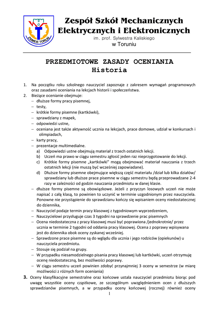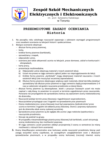 Zespół Szkół Mechanicznych Elektrycznych i Elektronicznych im. prof. Sylwestra Kaliskiego w Toruniu PRZEDMIOTOWE ZASADY OCENIANIA Historia 1. Na początku roku szkolnego nauczyciel zapoznaje z zakresem wymagań programowych oraz zasadami oceniania na lekcjach historii i społeczeństwa. 2. Bieżące ocenianie obejmuje: dłuższe formy pracy pisemnej, testy, krótkie formy pisemne (kartkówki), sprawdziany z mapek, odpowiedzi ustne, oceniana jest także aktywność ucznia na lekcjach, prace domowe, udział w konkursach i olimpiadach, karty pracy, prezentacje multimedialne. a) Odpowiedzi ustne obejmują materiał z trzech ostatnich lekcji. b) Uczeń ma prawo w ciągu semestru zgłosić jeden raz nieprzygotowanie do lekcji. c) Krótkie formy pisemne „kartkówki” mogą obejmować materiał nauczania z trzech ostatnich lekcji (nie muszą być wcześniej zapowiadane). d) Dłuższe formy pisemne obejmujące większą część materiału /dział lub kilka działów/ sprawdziany lub dłuższe prace pisemne w ciągu semestru będą przeprowadzane 2-4 razy w zależności od godzin nauczania przedmiotu w danej klasie. dłuższe formy pisemne są obowiązkowe. Jeżeli z przyczyn losowych uczeń nie może napisać z całą klasą, to powinien to uczynić w terminie uzgodnionym przez nauczyciela. Ponowne nie przystąpienie do sprawdzianu kończy się wpisaniem oceny niedostatecznej do dziennika, Nauczyciel podaje termin pracy klasowej z tygodniowym wyprzedzeniem, Nauczycielowi przysługuje czas 3 tygodni na sprawdzenie prac pisemnych Ocena niedostateczna z pracy klasowej musi być poprawiona /jednokrotnie/ przez ucznia w terminie 2 tygodni od oddania pracy klasowej. Ocena z poprawy wpisywana jest do dziennika obok oceny zyskanej wcześniej. Sprawdzone prace pisemne są do wglądu dla ucznia i jego rodziców (opiekunów) u nauczyciela przedmiotu. Stosuje się podział na grupy. W przypadku niesamodzielnego pisania pracy klasowej lub kartkówki, uczeń otrzymuję ocenę niedostateczną, bez możliwości poprawy. W ciągu semestru uczeń powinien zdobyć przynajmniej 3 oceny w semestrze (w miarę możliwości z różnych form oceniania) 3. Oceny klasyfikacyjne semestralne oraz końcowe ustala nauczyciel przedmiotu biorąc pod uwagę wszystkie oceny cząstkowe, ze szczególnym uwzględnieniem ocen z dłuższych sprawdzianów pisemnych, a w przypadku oceny końcowej (rocznej) również oceny 1 semestralnej. Warunkiem uzyskania pozytywnej oceny semestralnej lub końcoworocznej jest uzyskanie pozytywnej oceny z pracy klasowej. 4. W ocenie prac pisemnych ustala się procentowy wskaźnik przeliczenia punktacji pracy na daną ocenę: Poniżej 44% - ocena niedostateczna 45% - 54% - ocena dopuszczająca 55% - 74% - ocena dostateczna 75% - 94% - ocena dobra 95% - 100% - ocena bardzo dobra – jeżeli wiadomości wykraczają poza program to ocena celująca. 5. Jeżeli uczeń uzyska wysokie wyróżnienie w olimpiadzie przedmiotowej w etapie pozaszkolnym, może uzyskać ocenę celującą na koniec semestru bądź koniec roku. Na lekcji historii obowiązuje wagowy system oceniania. Ocenom bieżącym przypisana jest waga 0,5; 0,4 i 0,1. Następujące wartości liczbowe ocen cząstkowych są podstawą do wyliczenia średniej ważonej ocen: ocena 1 1+ 2 2+ 3 3+ 4 4+ 5 6 wartość liczbowa 1 1,55 2 2,55 3 3,55 4 4,55 5 6 Uczeń może zdobyć oceny o następujących wagach: WAGA 0,5: – praca klasowa, testy, sprawdziany, – zajęcie wysokiego miejsca w olimpiadzie lub konkursie o zasięgu przynajmniej regionalnym, WAGA 0,4: – kartkówki pisemne, – sprawdziany z mapek, – odpowiedzi ustne, – czynny udział w zajęciach pozalekcyjnych, WAGA 0,1: – pisemna praca domowa, – duża praca domowa (praca badawcza zakończona sprawozdaniem, prezentacja multimedialna i inne), – karta pracy, – aktywność (po uzyskaniu trzech plusów, bądź trzech minusów), KRYTERIA OCENIANIA Z HISTORII i SPOŁECZEŃSTWA: Ocena celująca: Uczniowie: są w swoich dociekaniach historycznych samodzielni i niezależni, wykazują wiedzę historyczną znacznie wykraczającą poza program nauczania, (patrz: kryteria na ocenę bdb), Ocena bardzo dobra: Uczniowie: łączą faktograficzną wiedzę ogólną i szczegółową oraz rozumieją różne aspekty historii Polski i innych krajów w zakresie programu nauczania, opisują minione społeczeństwa i czasy oraz porównują ich właściwości w ramach jednego lub wielu okresów historycznych, sprawdzają i analizują przyczyny i skutki wydarzeń i zmian oraz dostrzegają związki miedzy nimi, 2 opisują i wyjaśniają różne interpretacje wydarzeń, zmian i działania uczestniczących w nich ludzi, na podstawie posiadanej wiedzy wartościują i wyróżniają źródła informacji, krytycznie je wykorzystują w celu sformułowania wniosków i poparcia ich dowodami, wybierają, porządkują i rozwijają informacje w celu skonstruowania dobrze ułożonej wypowiedzi, z wykorzystaniem dat i pojęć historycznych, podejmują samodzielne dociekania historyczne, ujawniając kreatywność myślenia i pomysłowość prezentacji rozwiązanych problemów, podejmują różne role w zespole, wnosząc twórczy wkład w wykonanie określonego zadania, sprawnie porozumiewają się i stosują różne formy wypowiedzi Ocena dobra: Uczniowie: wykazują raczej ogólną wiedzę faktograficzną w ramach programu nauczania, natomiast w zakresie niektórych zagadnień prezentują wiedzę szczegółową i zrozumienie poruszanych aspektów z historii Polski i innych krajów, używają swej wiedzy do opisu wydarzeń, uczestniczących w nich ludzi oraz zmian, dostrzegają związki między cechami byłych społeczeństw i okresów, dostrzegają i opisują przyczyny i skutki wydarzeń oraz zmian, wiedzą, że niektóre wydarzenia, postępowanie ludzi, zmiany były interpretowane na różne sposoby i potrafią zasugerować możliwe tego przyczyny, wartościują źródła informacji i określają te, które mają szcze