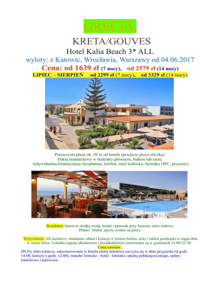GRECJA KRETA/GOUVES Hotel Kalia Beach 3* ALL wyloty: z Katowic, Wrocławia, Warszawy od 04.06.2017 Cena: od 1639 zł (7 nocy), od 2579 zł (14 nocy) LIPIEC – SIERPIEŃ od 2299 zł (7 nocy), od 3329 zł (14 nocy) Piaszczysta plaża ok. 50 m od hotelu (przejście przez uliczkę) Pokój standardowy w budynku głównym, balkon lub taras, indywidualna klimatyzacja (bezpłatna), telefon, mini lodówka, łazienka (WC, prysznic) Bezpłatne: basen ze słodką wodą, leżaki i parasole przy basenie, tenis stołowy Płatne: bilard, sporty wodne na plaży. Wyżywienie: All inclusive: śniadanie, obiad i kolacja w formie bufetu, lody i lekkie przekąski w ciągu dnia w snack barze. Lokalne napoje alkoholowe i bezalkoholowe serwowane są w godzinach 11:00-22:30 Cena zawiera: (PLN): bilet lotniczy, zakwaterowanie w hotelu (doba hotelowa zaczyna się w dniu przyjazdu od godz. 14:00, kończy o godz. 12:00), transfer lotnisko - hotel - lotnisko; opiekę polskojęzycznego, opłaty lotniskowe i paliwowe.