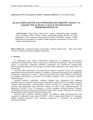 Aktualne Problemy Biomechaniki, nr 9/2015 123 Katarzyna WITA, Krzysztof CZAKON, Maciej HAJDUGA, ATH, Bielsko-Biała KLASA PRZYGOTOWANIA POWIERZCHNI PRĘTÓW Ti6Al4V NA JAKOŚĆ POŁĄCZENIA Z ZrO2 W OCENIE BADAŃ MIKROSKOPOWYCH Streszczenie: Celem pracy była ocena wpływu kondycjonowania piaskiem Al2O3 o gradacji: 50μm, 110μm, 250μm, powierzchni prętów Ti6Al4V na klasę połączenia z ZrO2 cementem dentystycznym RelyX 3M ESPE. Wnioski zostały formułowane na podstawie wyników badań topografii powierzchni 3D oraz oceny struktur metalograficznych. Słowa kluczowe: kondycjonowanie powierzchni, cement dentystyczny - klej, stop tytanu Ti6Al4V, dwutlenek cyrkonu, badania strukturalne 1. WSTĘP W środowisku jamy ustnej uzupełnienia protetyczne są poddawane ustawicznym obciążeniom dynamicznym, które są przyczyną uszkodzeń konstrukcji[1]. Obecna literatura wnosi, że przyczyną większości defektów konstrukcji jest niewłaściwe postępowanie kliniczne lub laboratoryjne. [2] Znaczący jest także dobór materiałów oraz opracowanie ich powierzchni. Literatura także informuje, że elementy protez stałych wykonane z ZrO2, nie wymagają kondycjonowania powierzchni, będącej w kontakcie z materiałem łączącym [3,4]. Dlatego też istotne było wyjaśnienie czy klasa – jakość powierzchni stopu tytanu Ti6Al4V stosowanego na implanty dentystyczne, ma wpływ na trwałość wiązania z ZrO2 za pomocą cementu dentystycznego. Łączenie różnych materiałów techniką klejenia jest alternatywą dla połączeń mechanicznych [5]. Klejenie dwóch różnych materiałów stałych, zależy od trwałości wiązania cementu dentystycznego z powierzchnią zarówno metalu jak i cyrkonu. Siła wiązania powinna być optymalna, aby skutecznie opierać się siłom żucia oddziaływującym na połączenie Ti6Al4V- ZrO2. W protetyce, w której występuje technika klejenia, istotnym warunkiem powodzenia jest jakość materiałów stosowanych, a także osadzanie ich za pomocą jak najmniejszej ilości cementu dentystycznego [5,6]. Ważność tego problemu skłoniła autorów do podjęcia badań porównawczych siły wiązania, w połączeniu stopu tytanu Ti6Al4V z ZrO2 w poprzednich latach [5]. Aktualnie podjęto badania dotyczące oceny klejonego połączenia w zależności od rozwinięcia powierzchni metalu. 124 K. Wita, K. Czakon, M. Hajduga 1.1. Cel pracy Celem pracy jest ocena wpływu kondycjonowania piaskiem Al2O3 o gradacji: 50μm, 110μm, 250μm, powierzchni prętów Ti6Al4V na klasę połączenia ZrO2 z cementem dentystycznym RelyX 3M ESPE w ocenie badań mikroskopowych. 1.2. Zakres pracy Zakres pracy obejmuje wykonanie próbek z ZrO2 o geometrii walca (h=20mm, ø20mm), z otworem cylindrycznym (h=5mm, ø4,2mm). Piaskowanie warstwy wierzchniej prętów Ti6Al4V (l=60mm, ø4mm), przeprowadzono na długości 20mm, korundem o gradacji: 50μm, 110μm, 250μm. Następnie wykonano badania chropowatości powierzchni prętów przy użyciu urządzenia Mahr Pethro Consert. Otwory o tolerancji 0,2mm w stosunku do średnicy prętów, wypełniono cementem dentystycznym RelyX 3M ESPE. Tytułem zachowania osiowości połączenia klejonego, przygotowano specjalny przyrząd centrujący położenie trzpienia Ti6Al4V. Dokonano także oceny połączenia w badaniach mikroskopowych przekroju. 2. BADANIA WŁASNE 2.1. Materiały przeznaczone do badań – przygotowanie próbek Do badań przygotowano próbki z ZrO2 o geometrii walca w których, wykonano otwory metodą obróbki wiórowej. Następnie kondycjonowano powierzchnie prętów metodą piaskowania tlenkiem glinu o gradacji 50μm, 110μm, 250μm (rys.1). Połączenia cylindrycznych próbek z ZrO2 z prętem tytanowym, dokonano przy zastosowaniu kleju - cementu dentystycznego RelyX 3M ESPE. Czas utwardzenia kleju lampą światło utwardzalną wynosił 5 minut. Aby zachować osiowość połączenia w układzie równomiernego usytuowania drutu tytanowego w otworze cylindrycznym próbki cyrkonowej wypełnionej klejem, zastosowano przyrząd gwarantujący centralne umieszczenie pręta w otworze. Rys. 1. Rysunek techniczny przekroju próbki przeznaczonej do badań Klasa przygotowowania powierzchni prętów Ti6Al4V… 125 2.2. Pomiary chropowatości powierzchni Badania chropowatości powierzchni przeprowadzono na urządzeniu Mahr Pethro Consert. Wyniki badań w postaci map topografii powierzchni 3D zamieszczono na rys. 3a, rys. 4a, rys. 5a. a) b) Rys. 2. a) Topografia powierzchni pręta A kondycjonowanej tlenkiem glinu o średnicy ziarna 50μm, b) Strukturalna analiza mikroskopowa, powiększenie 500x, gradacja 50μm Tabela 1. Wyniki pomiaru chropowatości powierzchni – próbka A kondycjonowana tlenkiem glinu o średnicy ziarna 50μm. Parametr Rq – średnie kwadratowe odchylenie profilu chropowatości. Ra Rq Rp Rt Rv Rk Rpk Rvk MR1 MR2 a) 1,11 μm 1,40 μm 4,17 μm 8,80 μm 3,22 μm 3,65 μm 1,69 μm 1,31 μm 8,85 % 90,00 % b) Rys.3. a) Topografia powierzchni pręta B kondycjonowanej tlenkiem glinu o średnicy ziarna 110μm, b) Strukturalna analiza mikroskopowa, powiększenie 500x, gradacja 110μm 126 K. Wita, K. Czakon, M. Hajduga Tabela 2. Wyniki pomiaru chropowatości powierzchni – próbka B kondycjonowana tlenkiem glinu o średnicy ziarna 110μm. Parametr Rq – średnie kwadratowe odchylenie profilu chropowatości. Ra Rq Rp Rt Rv Rk Rpk Rvk MR1 MR2 a) 1,56 μm 2,01 μm 5,68 μm 13,65 μm 4,99 μm 4,81 μm 2,53 μm 1,90 μm 11,06 % 88,78 % b) Rys. 4. a) Topografia powierzchni pręta C kondycjonowanej tlenkiem glinu o średnicy ziarna 250μm, b) Strukturalna analiza mikroskopowa, powiększenie 500x, gradacja 250μm Tabela 3. Wyniki pomiaru chropowatości powierzchni – próbka C kondycjonowana tlenkiem glinu o średnicy ziarna 250μm. Parametr Rq – średnie kwadratowe odchylenie profilu chropowatości. Ra Rq Rp Rt Rv Rk Rpk Rvk MR1 MR2 1,64 μm 2,13 μm 5,45 μm 13,71 μm 6,24 μm 5,00 μm 2,20 μm 2,61 μm 10,53 % 87,29 % Klasa przygotowowania powierz