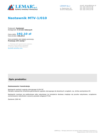 LEMAR Sp.J. ul. Bytomska 18 42-672 Wieszowa email: [email protected] tel: (32) 376 22 06 tel: (32) 376 21 85 tel: (32) 376 21 95 Nastawnik MTV-1/010 Producent: Systemair Dostępność: 3-14 dni roboczych 192,10 zł Cena netto: Cena brutto: 236,28 zł Cena produktu jest objęta promocją: Promocja 15% taniej * * - Promocja jest ograniczona czasowo. Aktualną cenę możesz sprawdzić w naszym sklepie internetowym. Sprawdź aktualną cenę Opis produktu: Zastosowanie i konstrukcja Nastawnik wartości sygnału sterującego 0-10V DC Pokrętło nastawnika umożliwia generowanie sygnału sterującego do dowolnych urządzeń, np. silnika wentylatora EC. Nastawnik montuje się podtynkowo albo natynkowo (w komplecie dostawy znajduje się puszka natynkowa, urządzenie zamontowane natynkowo w puszce pozwala osiągnąć IP 44). Zasilanie 230V AC LEMAR Sp.J. - Niniejszy dokument nie stanowi oferty handlowej w rozumieniu k.c. Wygenerowano: 2017-03-03 23:37:06 Powered by TCPDF (www.tcpdf.org)