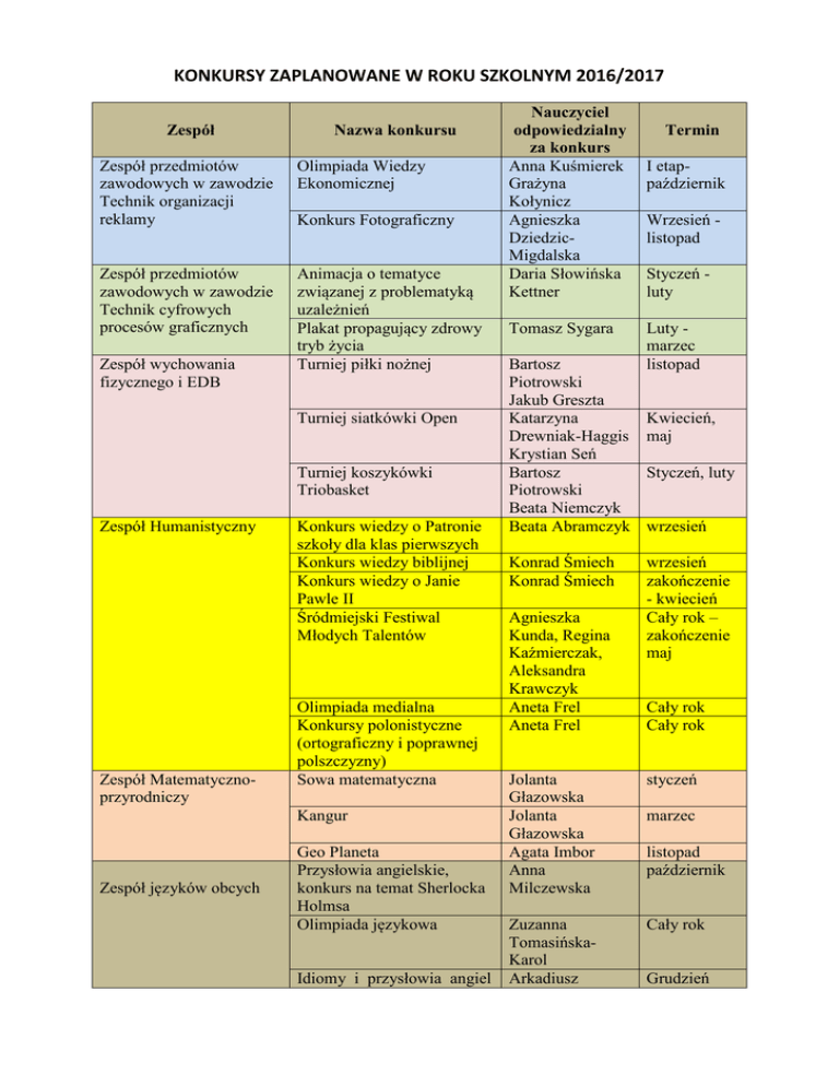 KONKURSY ZAPLANOWANE W ROKU SZKOLNYM 2016/2017 Zespół Nazwa konkursu Zespół przedmiotów zawodowych w zawodzie Technik organizacji reklamy Olimpiada Wiedzy Ekonomicznej Zespół przedmiotów zawodowych w zawodzie Technik cyfrowych procesów graficznych Animacja o tematyce związanej z problematyką uzależnień Plakat propagujący zdrowy tryb życia Turniej piłki nożnej Zespół wychowania fizycznego i EDB Konkurs Fotograficzny Turniej siatkówki Open Turniej koszykówki Triobasket Zespół Humanistyczny Zespół Matematycznoprzyrodniczy Konkurs wiedzy o Patronie szkoły dla klas pierwszych Konkurs wiedzy biblijnej Konkurs wiedzy o Janie Pawle II Śródmiejski Festiwal Młodych Talentów Olimpiada medialna Konkursy polonistyczne (ortograficzny i poprawnej polszczyzny) Sowa matematyczna Kangur Zespół języków obcych Geo Planeta Przysłowia angielskie, konkurs na temat Sherlocka Holmsa Olimpiada językowa Idiomy i przysłowia angiel Nauczyciel odpowiedzialny za konkurs Anna Kuśmierek Grażyna Kołynicz Agnieszka DziedzicMigdalska Daria Słowińska Kettner Tomasz Sygara Bartosz Piotrowski Jakub Greszta Katarzyna Drewniak-Haggis Krystian Seń Bartosz Piotrowski Beata Niemczyk Beata Abramczyk Konrad Śmiech Konrad Śmiech Agnieszka Kunda, Regina Kaźmierczak, Aleksandra Krawczyk Aneta Frel Aneta Frel Termin I etappaździernik Wrzesień listopad Styczeń luty Luty marzec listopad Kwiecień, maj Styczeń, luty wrzesień wrzesień zakończenie - kwiecień Cały rok – zakończenie maj Cały rok Cały rok Jolanta Głazowska Jolanta Głazowska Agata Imbor Anna Milczewska styczeń Zuzanna TomasińskaKarol Arkadiusz Cały rok marzec listopad październik Grudzień Zespół do spraw promocji ucznia uzdolnionego skie Konkurs plastyczny – symbol kraju anglojęzycznego Konkurs plastyczny – ilustracja, kolaż, projekt ubioru z opisem w języku niemieckim Festiwal Talentów Kapelski Anna Bieniek marzec Joanna Tumasz kwiecień Zuzanna TomasińskaKarol kwiecień
