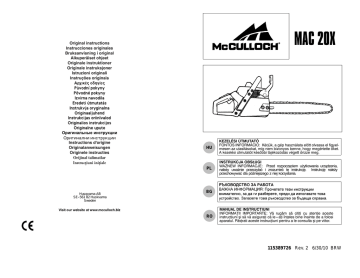 Original instructions Instrucciones originales Bruksanvisning i original Alkuperäiset ohjeet Originale instruktioner Originale instruksjoner Istruzioni originali Instruções originais ∞Ú¯ÈΤ˜ Ô‰ËÁ›Â˜ PÛvodní pokyny Pôvodné pokyny Izvirna navodila Eredeti útmutatás Instrukvja oryginalna Originaaljuhend Instrukcijas oriinlvalod Originalios instrukcijos Originalne upute Оригинальные инструкции ðèãèíàëíè èíñòðóêöèè Instructions d'origine Originalanweisungen Originele instructies Orijinal talimatlar Instrucöiuni iniöiale Husqvarna AB SE--561 82 Huskvarna Sweden HU KEZELÉSI ÚTMUTATÓ FONTOS INFORMÁCIO: Kérjük, a gép használata előtt olvassa el figyelmesen az utasításokat, míg nem bizonyos benne, hogy megértette őket. A kezelési útmutatót későbbi tájékozódás végett őrizze meg. PL INSTRUKCJA OBSŁUGI WAŻNEW INFORMACJE: Przed rozpoczęciem użytkowania urządzenia, należy uważnie przeczytać i zrozumieć tę instrukcję. Instrukcję należy przechowywać dla późniejszego z niej korzystania. BG Visit our website at www.mcculloch.biz RO MANUAL DE INSTRUCŢIUNI INFORMAŢII IMPORTANTE: Vă rugăm să citiţi cu atenţie aceste instrucţiuni şi să vă asiguraţi că le---aţi înţeles bine înainte de a folosi aparatul. Păsţrati aceste instrucţiuni pentru a le consulta şi pe viitor. 115389726 Rev. 2 6/30/10 BRW MI MICSODA A GÉPEN? Első Kézvédő/ Láncfék Kar Kombinált Szerszám Fűrészlánc DATE TEHNICE Combinaţii de şină de ghidare şi lanţuri Első Fogantyú Indítózsinór Fogantyú Porlasztó szabályozócsavar BE/KI (ON/STOP) Kapcsoló Üzemanyag pumpa Kipufogódob Următoarele accesorii de tăiere sunt aprobate pentru modelele McCulloch Mac 20X. Pasul Lungime, lanţului inci inci 16 0,375 16 0,375 Şină de ghidare Lăţimea Max. numărul canalului dinţilor roţii de mm la cârfyk şinei 1,3 7T 1,3 7T Lanţul de ferăstrău Lungime, zale de Tip ghidare (număr) Oregon 91VJ 56 Oregon 91VG 56 Lánckenő-olaj Tartály Indítószerkezet Üzemanyagtartály Rönktámasz Burkolata (kiegészítő Láncvédő tok tartozék) Hengerfedél Gázkar Retesz Hátsó Fogantyú Vágófogak Mélységhatároló Láncfeszítő Csavar Tip Tip 91VJ 91VG Hajtó láncszemek Gázkar Szivató/ Anyacsavarok Gázrögzítő Láncfék Láncfogó fedél kar Vezetőlemez Inci Inci/mm Grade Grade 0,375 0,050/1,3 5/32 / 4,0 80° 30° 0° 0,025/0,65 16/40:56 0,375 0,050/1,3 5/32 / 4,0 80° 30° 0° 0,025/0,65 16/40:56 Vezetőlemez csúcsán lévő orrkerék JELMAGYARÁZATOK FIGYELEM! A láncfűrész Mielőtt dolgozni kezd géhasználata veszélyes üzempével olvassa el gondosan nek minősül. Gondatlan vagy a Kezelési útmutatót és rendeltetésének nem meg--értse meg az abban foglalfelelő használata komoly, akár takat. halálos kimenetelű személyi sérülést okozhat. HangnyomMunkavégzés közben ásszint mindig használjon: 7,5 méteren fülvédőt, védőszemüveget, védősisakot Hangteljesítményszint A láncfűrészt mindig két kézzel üzemeltesse. Láncfék, aktiválva (jobb) Láncfék, nem aktiválva (bal) FIGYELEM! Ügyeljen arra, hogy a vezetőlemez csúcsa ne érjen hozzá semmiféle tárgyhoz, mert ilyen esetekben a vágószerkezet hirtelen felfelé vagy hátrafelé csapódhat, ami súlyos balesetet okozhat. 2 In/cm: încărcare moartă 79 Grade Inci/mm DATE TEHNICE JELMAGYARÁZATOK Emlékeztető ábrák a motor indításához Date tehnice Mac 20X Motor 46 Volumul cilindrului, cm3 Cursă, mm 32 Turaţie la mers în gol, rpm 3000 Putere, kW 1,3/13000 Sistem de aprindere Bujia Torch R7 Distanţa între electrozi, mm 0,5 Sistemul de alimentare şi ungere Volumul rezervorului de combustibil, litri 0,38 Debitul pompei de ulei la 8500 rpm, ml/min 4 --- 8 Volumul rezervorului de ulei, litri 0,2 Tip de pompă de ulei Automată Greutate Ferăstrău cu motor fără lamă de ghidaj şi lanţ, cât şi cu rezervoare goale, kg 4,7 Producere de zgomot (vezi nota 1) Nivelul efectului sonor, măsurat dB(A) 110 118 Nivelul efectului sonor, garantat LWA dB(A) Nivele de zgomot (vezi nota 2) Nivelul de presiune sonoră echivalentă măsurată la urechea operatorului, dB(A) 96,3 Nivele de vibraţii echivalente, ahveq (vezi nota 3) 2,4 Mânerul anterior, m/s2 Mânerul posterior, m/s2 3,6 Lanţ/şină de ghidare Lungimea normală a şinei de ghidare, ţoli/cm 16/40 Lungimi recomandate de şină de ghidare, ţoli/cm 16/40 Lungime utilă de tăiere, ţoli/cm 15,5/39 Pasul lanţului, ţoli 0,375 Grosimea zalelor de antrenare, ţoli/mm 0,050/1,3 Tipul roţii de antrenare/numărul dinţilor 6 Viteza lanţului la puterea maximă, m/s 19 Nota 1: Producere de zgomot în mediul înconjurător măsurat ca şi efect sonor (LWA) conform directivei EC 2000/14/EC. Nota 2: Nivelul echivalent de presiune a zgomotului, conform ISO 22868, este calculat ca şi totalul energiei măsurate în timpul unei ore pentru diferite nivele de presiune a zgomotului în diferite condiţii de lucru. Dispersia statistică tipică pentru nivelul echivalent de presiune a zgomotului este reprezentată printr--- o deviere standard de 1 dB(A). Nota 3: Nivelul echivalent de vibraţii, conform ISO 22867, este calculat ca şi totalul de energie măsurat în timpul unei ore pentru nivelurile de vibraţii în diferite condiţii de lucru. Datele raportate pentru nivelul echivalent de vibraţii includ o dispersie statistică tipică (deviere standard) de 1 m/s2. Nyomja meg az üzemanyag pumpát 6--- szor. A szivató kart tolja be FÉL SZÍVATÓ (HALF CHOKE) állásba (HALF CHOKE). A szívató/gyors üresjárati kart teljesen húzza ki (a TELJES SZÍVATÓ (FULL CHOKE) állásba). Jobb kezével húzza meg az indítózsinórt egy gyors mozdulattal, amíg a motor beindul. BIZTONSÁGI ELŐÍRÁSOK FIGYELEM: Mindenféle szerelési, szállítási, karbantartási, beállítási vagy javítási munkánál, kivéve a porlasztó beállításánál, húzza le a gyertyacsat