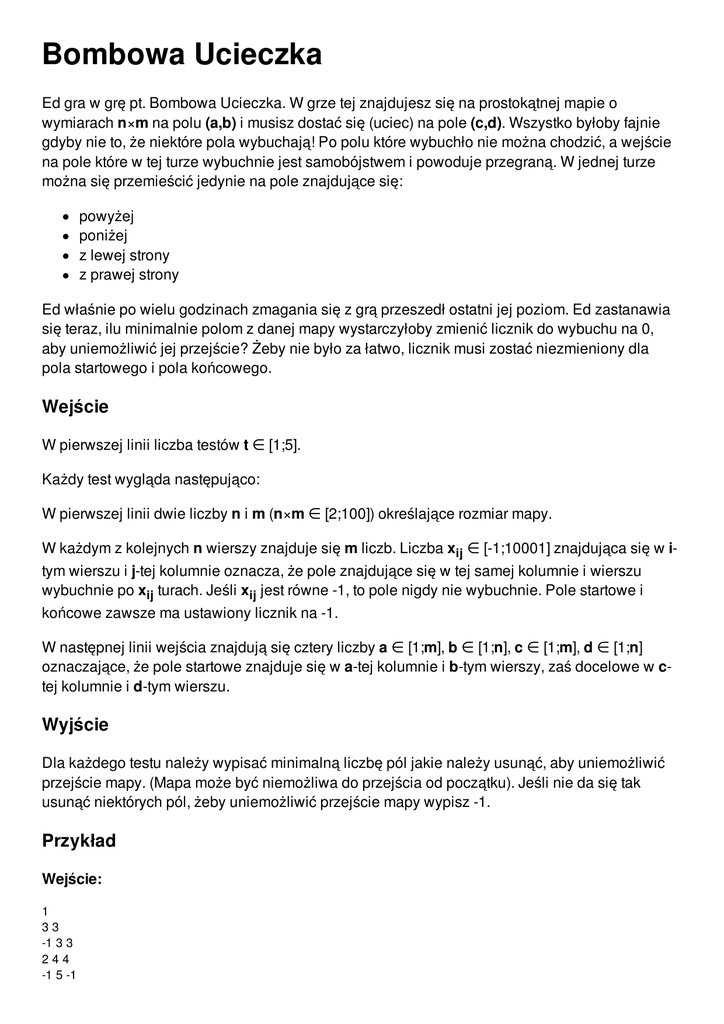 Bombowa Ucieczka Ed gra w grę pt. Bombowa Ucieczka. W grze tej znajdujesz się na prostokątnej mapie o wymiarach n×m na polu (a,b) i musisz dostać się (uciec) na pole (c,d). Wszystko byłoby fajnie gdyby nie to, że niektóre pola wybuchają! Po polu które wybuchło nie można chodzić, a wejście na pole które w tej turze wybuchnie jest samobójstwem i powoduje przegraną. W jednej turze można się przemieścić jedynie na pole znajdujące się: powyżej poniżej z lewej strony z prawej strony Ed właśnie po wielu godzinach zmagania się z grą przeszedł ostatni jej poziom. Ed zastanawia się teraz, ilu minimalnie polom z danej mapy wystarczyłoby zmienić licznik do wybuchu na 0, aby uniemożliwić jej przejście? Żeby nie było za łatwo, licznik musi zostać niezmieniony dla pola startowego i pola końcowego. Wejście W pierwszej linii liczba testów t ∈ [1;5]. Każdy test wygląda następująco: W pierwszej linii dwie liczby n i m (n×m ∈ [2;100]) określające rozmiar mapy. W każdym z kolejnych n wierszy znajduje się m liczb. Liczba xij ∈ [-1;10001] znajdująca się w itym wierszu i j-tej kolumnie oznacza, że pole znajdujące się w tej samej kolumnie i wierszu wybuchnie po xij turach. Jeśli xij jest równe -1, to pole nigdy nie wybuchnie. Pole startowe i końcowe zawsze ma ustawiony licznik na -1. W następnej linii wejścia znajdują się cztery liczby a ∈ [1;m], b ∈ [1;n], c ∈ [1;m], d ∈ [1;n] oznaczające, że pole startowe znajduje się w a-tej kolumnie i b-tym wierszy, zaś docelowe w ctej kolumnie i d-tym wierszu. Wyjście Dla każdego testu należy wypisać minimalną liczbę pól jakie należy usunąć, aby uniemożliwić przejście mapy. (Mapa może być niemożliwa do przejścia od początku). Jeśli nie da się tak usunąć niektórych pól, żeby uniemożliwić przejście mapy wypisz -1. Przykład Wejście: 1 33 -1 3 3 244 -1 5 -1 1133 Wyjście: 2