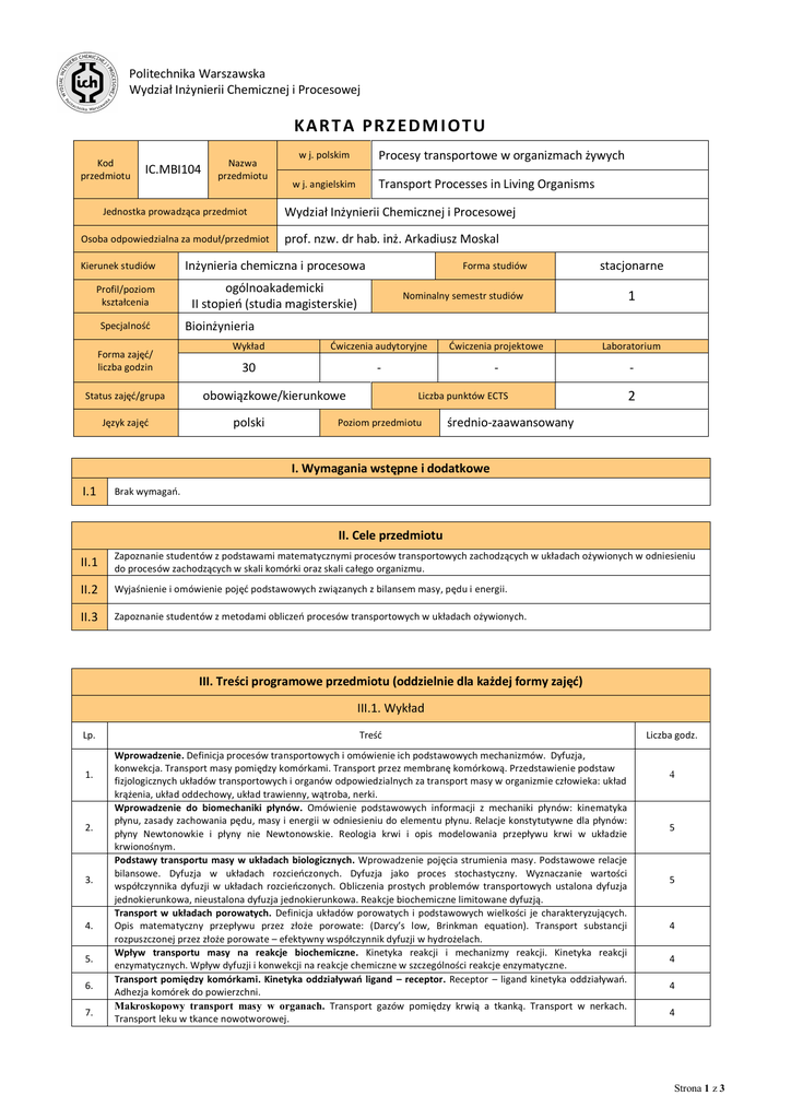 Politechnika Warszawska Wydział Inżynierii Chemicznej i Procesowej K A R T A P R Z ED M I OT U Kod przedmiotu IC.MBI104 Nazwa przedmiotu Jednostka prowadząca przedmiot Osoba odpowiedzialna za moduł/przedmiot Kierunek studiów Profil/poziom kształcenia Specjalność Forma zajęć/ liczba godzin Status zajęć/grupa Język zajęć Procesy transportowe w organizmach żywych w j. polskim Transport Processes in Living Organisms w j. angielskim Wydział Inżynierii Chemicznej i Procesowej prof. nzw. dr hab. inż. Arkadiusz Moskal Inżynieria chemiczna i procesowa Forma studiów ogólnoakademicki II stopień (studia magisterskie) stacjonarne 1 Nominalny semestr studiów Bioinżynieria Wykład Ćwiczenia audytoryjne Ćwiczenia projektowe Laboratorium 30 - - - obowiązkowe/kierunkowe polski Liczba punktów ECTS Poziom przedmiotu 2 średnio-zaawansowany I. Wymagania wstępne i dodatkowe I.1 Brak wymagań. II. Cele przedmiotu II.1 Zapoznanie studentów z podstawami matematycznymi procesów transportowych zachodzących w układach ożywionych w odniesieniu do procesów zachodzących w skali komórki oraz skali całego organizmu. II.2 Wyjaśnienie i omówienie pojęć podstawowych związanych z bilansem masy, pędu i energii. II.3 Zapoznanie studentów z metodami obliczeń procesów transportowych w układach ożywionych. III. Treści programowe przedmiotu (oddzielnie dla każdej formy zajęć) III.1. Wykład Lp. 1. 2. 3. 4. 5. 6. 7. Treść Wprowadzenie. Definicja procesów transportowych i omówienie ich podstawowych mechanizmów. Dyfuzja, konwekcja. Transport masy pomiędzy komórkami. Transport przez membranę komórkową. Przedstawienie podstaw fizjologicznych układów transportowych i organów odpowiedzialnych za transport masy w organizmie człowieka: układ krążenia, układ oddechowy, układ trawienny, wątroba, nerki. Wprowadzenie do biomechaniki płynów. Omówienie podstawowych informacji z mechaniki płynów: kinematyka płynu, zasady zachowania pędu, masy i energii w odniesieniu do elementu płynu. Relacje konstytutywne dla płynów: płyny Newtonowkie i płyny nie Newtonowskie. Reologia krwi i opis modelowania przepływu krwi w układzie krwionośnym. Podstawy transportu masy w układach biologicznych. Wprowadzenie pojęcia strumienia masy. Podstawowe relacje bilansowe. Dyfuzja w układach rozcieńczonych. Dyfuzja jako proces stochastyczny. Wyznaczanie wartości współczynnika dyfuzji w układach rozcieńczonych. Obliczenia prostych problemów transportowych ustalona dyfuzja jednokierunkowa, nieustalona dyfuzja jednokierunkowa. Reakcje biochemiczne limitowane dyfuzją. Transport w układach porowatych. Definicja układów porowatych i podstawowych wielkości je charakteryzujących. Opis matematyczny przepływu przez złoże porowate: (Darcy’s low, Brinkman equation). Transport substancji rozpuszczonej przez złoże porowate – efektywny współczynnik dyfuzji w hydrożelach. Wpływ transportu masy na reakcje biochemiczne. Kinetyka reakcji i mechanizmy reakcji. Kinetyka reakcji enzymatycznych. Wpływ dyfuzji i konwekcji na reakcje chemiczne w szczególności reakcje enzymatyczne. Transport pomiędzy komórkami. Kinetyka oddziaływań ligand – receptor. Receptor – ligand kinetyka oddziaływań. Adhezja komórek do powierzchni. Makroskopowy transport masy w organach. Transport gazów pomiędzy krwią a tkanką. Transport w nerkach. Transport leku w tkance nowotworowej. Liczba godz. 4 5 5 4 4 4 4 Strona 1 z 3 IV. Wykaz osiąganych efektów kształcenia Rodzaj * efektu Odniesienie do efektu: dla dla kierunku obszaru Opis efektu kształcenia kod Ma rozszerzoną i pogłębioną wiedzę z zakresu matematyki przydatną do wykorzystania metod matematycznych do opisu procesów fizycznych i chemicznych (ma wiedzę niezbędną do rozwiązania równań różniczkowych oraz wyprowadzenia zależności matematycznych opartych na bilansie różniczkowym). Ma ugruntowaną wiedzę niezbędną do sporządzania bilansów masy, składnika i energii (zna podstawowe aksjomaty bilansowania procesu ustalonego i nieustalonego w czasie dla płynów newtonowskich i płynów o dowolnej reologii). Potrafi pozyskiwać informacje z literatury i je interpretować oraz na ich podstawie wyciągać wnioski (potrafi przeanalizować wpływ parametrów procesowych na zjawiska transportowe zachodzące w układach ożywionych oraz na podstawie danych literaturowych potrafi zaproponować prosty model reologiczny). W K_W01 T2A_W01 W K_W07 T2A_W07 T2A_W03 T2A_W04 U K_U01 T2A_U01 U KS K_U03 T2A_U05 Potrafi określić kierunki dalszego uczenia się i realizować proces samokształcenia. K_K01 T2A_K01 Rozumie potrzebę dokształcania się i podnoszenia swoich kompetencji zawodowych. W1 W2 U1 U2 KS1 *) Rodzaje efektów: W- wiedza, U- umiejętności, KS – kompetencje społeczne V. Metody weryfikacji efektów kształcenia Forma weryfikacji Efekt Egzamin ustny Egzamin pisemny Zaliczenie pisemne Kolokwia Prace domowe Referat/ sprawozdanie Dyskusja/ seminarium W1 X X W2 X X U1 X U2 X KS1 X VI. Literatura Podstawowa G.A. Truskey, F. Yuan, D.F. Katz, Transport Phenomena in Biological Systems, PEARSON, New York, 2010. Uzupełniająca C.R. Ethier, C.A. Simmons, Introductory Biomechanics. From Cells to Organisms, Cambridge University Press, Cambridge, 2007. Strona 2 z 3 VII. Nakład pracy studenta Lp. Treść Liczba godz. 1. Godziny kontaktowe z nauczycielem akademickim wynikające z planu studiów 30 2. Godziny kontaktowe z nauczycielem akademickim w ramach konsultacji 4 3. Godziny kontaktowe z nauczycielem akademickim w ramach zaliczeń i egzaminów 5 4. Przygotowanie do zajęć (studiowanie literatury, odrabianie prac domowych itp.) 3 5. Zbieranie informacji, opracowanie wyników 3 6. Przygotowanie sprawozdania, prezentacji, raportu, dyskusji - 7. Nauka samodzielna – przygotowanie do zaliczenia/kolokwium/egzaminu Sumaryczne obciążenie studenta pracą Łączna liczba punktów ECTS Liczba punktów ECTS, którą student mu