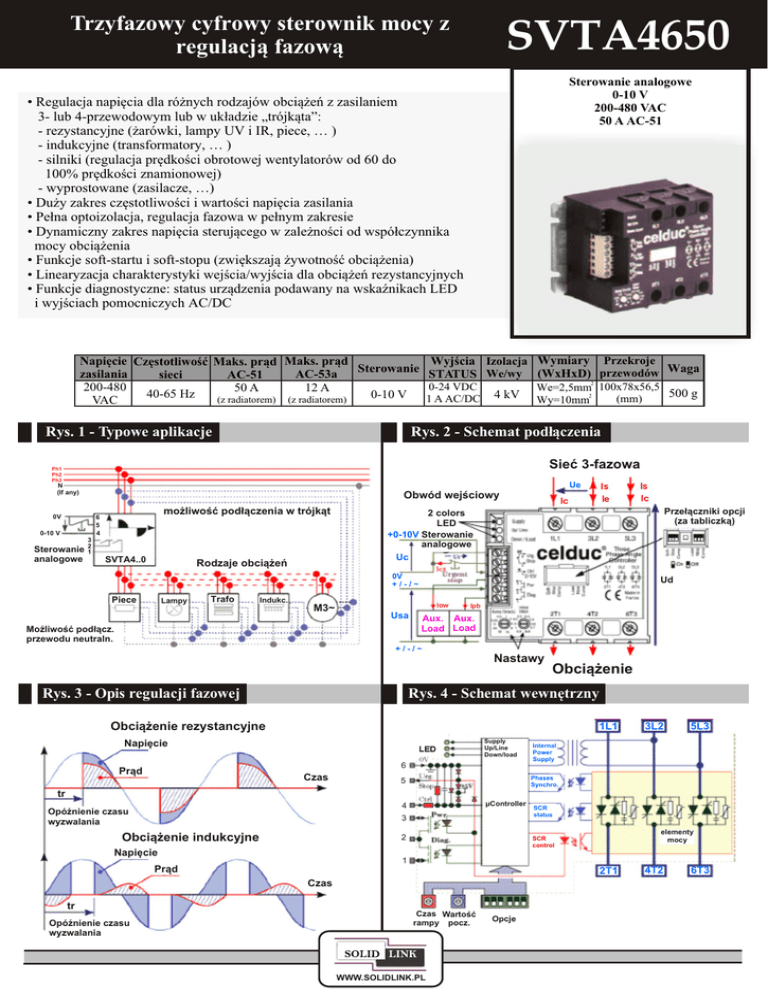 Trzyfazowy cyfrowy sterownik mocy z regulacj¹ fazow¹ SVTA4650 Sterowanie analogowe 0-10 V 200-480 VAC 50 A AC-51 • Regulacja napiêcia dla ró¿nych rodzajów obci¹¿eñ z zasilaniem 3- lub 4-przewodowym lub w uk³adzie „trójk¹ta”: - rezystancyjne (¿arówki, lampy UV i IR, piece, … ) - indukcyjne (transformatory, … ) - silniki (regulacja prêdkoœci obrotowej wentylatorów od 60 do 100% prêdkoœci znamionowej) - wyprostowane (zasilacze, …) • Du¿y zakres czêstotliwoœci i wartoœci napiêcia zasilania • Pe³na optoizolacja, regulacja fazowa w pe³nym zakresie • Dynamiczny zakres napiêcia steruj¹cego w zale¿noœci od wspó³czynnika mocy obci¹¿enia • Funkcje soft-startu i soft-stopu (zwiêkszaj¹ ¿ywotnoœæ obci¹¿enia) • Linearyzacja charakterystyki wejœcia/wyjœcia dla obci¹¿eñ rezystancyjnych • Funkcje diagnostyczne: status urz¹dzenia podawany na wskaŸnikach LED i wyjœciach pomocniczych AC/DC Napiêcie Czêstotliwoœæ Maks. pr¹d Maks. pr¹d Wyjœcia Izolacja Wymiary Przekroje Sterowanie STATUS We/wy (WxHxD) przewodów Waga zasilania AC-53a sieci AC-51 0-24 VDC 200-480 We=2,5mm2 100x78x56,5 50 A 12 A 500 g 40-65 Hz 0-10 V 4 kV 1 A AC/DC (mm) (z radiatorem) (z radiatorem) Wy=10mm2 VAC Rys. 2 - Schemat pod³¹czenia Rys. 1 - Typowe aplikacje Sieæ 3-fazowa Ph1 Ph2 Ph3 Ue N (If any) Obwód wejœciowy 0V mo¿liwoœæ pod³¹czenia w trójk¹t 6 5 4 0-10 V Sterowanie analogowe 3 2 1 SVTA4..0 Rodzaje obci¹¿eñ Is Ie Ic Prze³¹czniki opcji (za tabliczk¹) 2 colors LED +0-10V Sterowanie analogowe Uc 0V +/-/~ Piece Lampy Trafo Indukc. M3~ Is Ic Ud Ipw Usa Mo¿liwoœæ pod³¹cz. przewodu neutraln. Ipb Aux. Aux. Load Load +/-/~ Nastawy Rys. 3 - Opis regulacji fazowej Obci¹¿enie Rys. 4 - Schemat wewnêtrzny Obci¹¿enie rezystancyjne 1L1 Napiêcie LED Supply Up/Line Down/load 6 Pr¹d Czas 3L2 5L3 Internal Power Supply Phases Synchro. 5 tr µController 4 OpóŸnienie czasu wyzwalania 3 Obci¹¿enie indukcyjne 2 Napiêcie 1 2T1 Czas OpóŸnienie czasu wyzwalania elementy mocy SCR control Pr¹d tr SCR status Czas Wartoœæ rampy pocz. WWW.SOLIDLINK.PL Opcje 4T2 6T3 Karta katalogowa SVTA4650 2 Nastawy NASTAWY I OPCJE Opcja „Ramp time (s)” „Initial value” „Soft-stop” „Load” „Comp” „Ntrl” „Curve” Œrodek gwiazdy po³¹czony jest z przewodem neutralnym zasilania Wybór charakterystyki wejœcia-wyjœcia (regulacja fazowa lub linearyzacja wejœcia) Opis Funkcja Czas narostu zbocza napiêciowego (soft-start i ³agodne przejœcia) Pocz¹tkowa wartoœæ napiêcia przy³o¿onego do obci¹¿enia Czas opadania zbocza napiêciowego Pozwala dopasowaæ Przed rozpoczêciem zakres sygna³u regulacji analogowej steruj¹cego do wspó³czynnika mocy wykonywany jest soft-start obci¹¿enia Mo¿liwoœci nastaw W³ (do góry) W³ (do góry) W³ (do góry) W³ (do góry) Bia³e kwadraciki = Prze³¹czniki Przyk³ad: Wszystkie prze³¹czniki w dó³ (WY£) (nastawa fabryczna) Obci¹¿enia indukcyjne Silnik Gwiazda z przewodem neutralnym (4 przewody) Linearyzacja Wy³ (na dó³) Wy³ (na dó³) Wy³ (na dó³) Wy³ (na dó³) Obci¹¿enia rezystancyjne inne obci¹¿enia ni¿ silniki Trójk¹t lub gwiazda bez przewodu neutralnego Regulacja fazowa Ts= 0 do 64 s Vi= 0 do 100% Obwód wejœciowy Wartoœci Opis wejœcia Funkcja Uc „0-10 V” Analogowe wejœcie steruj¹ce Sta³e napiêcie steruj¹ce (DC) Sta³y pr¹d steruj¹cy (DC) 4,6 0-10 VDC „Urg. Stop” Od³¹cza sterowanie tyrystorów Rozwarcie po³¹czenia miêdzy 5i6 5,6 - Ucsmin 0,3 VDC - Ucsmax 9,7 VDC - Ucmax -Ucmax Ut Re Ict 30 VDC 30 VDC 6 VDC 6 VDC >1,5 V 20 mADC Rodzaj sterowania Koñcówki Zakres napiêcia steruj¹cego Progowe napiêcie zwalniania i sterowania Progowe napiêcie pe³nego wysterowania Maks. napiêcie wejœciowe Maks. napiêcie wsteczne Napiêcie zwalniania Impedancja wejœciowa Pr¹d prze³¹czaj¹cy Uwagi 100 kohm - Rys. 5 Ict=f(Ut) Wyjœcia STATUS Wartoœci “Diag.” 1i2 Wskazuje problem wykryty w konfiguracji obwodu Opis wyjœcia Koñcówki Funkcja Usan Usa Usap Uwagi “Pwr” 2i3 Wskazuje zasilanie obci¹¿enia Znamionowe napiêcie pracy Zakres napiêæ pracy Maks. napiêcie szczytowe Ochrona przepiêciowa Min. pr¹d obci¹¿enia Maks. pr¹d obci¹¿enia Ipw/Ipb Ipw/Ipb 24 VAC/DC 0 do 28 VAC/DC 60 V Wewnêtrzny warystor 25V, rozmiar 7 0A 1A AC/DC Maks. pr¹d przeci¹¿enia Ipw/Ipb 2,4A AC/DC Ron/Roff Ton/Toff 500 mohm / 100 Mohm 0,5ms / 2 ms Rezystancja w stanie W³ i Wy³ Czas W³ i Wy³ WWW.SOLIDLINK.PL Patrz rys. 6 @100ms 10% cyklu Patrz rys. 6 Karta katalogowa SVTA4650 3 Obwody wyjœciowe Parametry Zakres napiêcia pracy Niepowtarzalne napiêcie szczytowe Ochrona przepiêciowa Opis Ue Uep VDR Maks. pr¹dy znamionowe Ie Maks. pr¹dy przy po³¹czeniu w trójk¹t (D) Maks. moc silnika Niepowtarzalny szczytowy pr¹d przeci¹¿enia (1 cykl 10 ms) Parametr s³u¿¹cy do doboru bezpieczników Min. pr¹d obci¹¿enia Maks. pr¹d up³ywu Wspó³czynnik mocy Zakres czêstotliwoœci sieci Maks. wzrost napiêcia w stanie wy³¹czenia Ochrona przed szybkimi przepiêciami Maks. czas narostu pr¹du Spadek napiêcia w stanie przewodzenia Maks. temperatura z³¹cza Rezystancja termiczna z³¹cze/podstawa na element mocy Napiêcie izolacji wejœcia/wyjœcia mocy Napiêcie izolacji wejœcie/wyjœcia Status Napiêcie izolacji wejœcia/obudowa Rezystancja izolacji Pojemnoœæ izolacji Temperatura przechowywania Temperatura pracy Maks. temperatura radiatora Iline Wartoœci 200 do 480 VAC 1200 V Wewnêtrzne warystory 510V, rozmiar 14 Rezystancyjne Silniki Silniki Ithmax AC51 Iemax AC53a Ie AC53a 50 A 12 A 8,5 A 21 A 87 A 14 A Uwagi Zobacz wykresy na rys. 7 Wartoœci z radiatorami Pe 5,5 kW @ 400 VAC po³¹czenie w gwiazdê ITSM 550 A Zobacz rys. 8 I 2t 1500 A2s @ 10ms Iemin Ielk Pf F 100 mA 7 mA 0 do 1 40 do 65 Hz dv/dt 500 V/µs @400VAC 50Hz Wewnêtrzne gasiki RC di/dt 50A/µs Ud 1,4 V @ Ith o Tjmax 125 C Rthjc 0,45 K/W Uimp 4 kV Uied 2,5 kV Uimp Rio Cio Tstg Tamb Tc 4 kV 1 Go