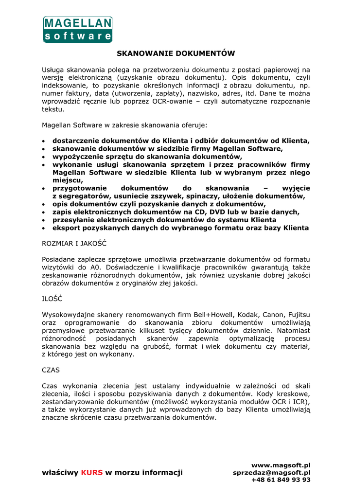 SKANOWANIE DOKUMENTÓW Usługa skanowania polega na przetworzeniu dokumentu z postaci papierowej na wersję elektroniczną (uzyskanie obrazu dokumentu). Opis dokumentu, czyli indeksowanie, to pozyskanie określonych informacji z obrazu dokumentu, np. numer faktury, data (utworzenia, zapłaty), nazwisko, adres, itd. Dane te można wprowadzić ręcznie lub poprzez OCR-owanie – czyli automatyczne rozpoznanie tekstu. Magellan Software w zakresie skanowania oferuje: • • • • • • • • • dostarczenie dokumentów do Klienta i odbiór dokumentów od Klienta, skanowanie dokumentów w siedzibie firmy Magellan Software, wypożyczenie sprzętu do skanowania dokumentów, wykonanie usługi skanowania sprzętem i przez pracowników firmy Magellan Software w siedzibie Klienta lub w wybranym przez niego miejscu, przygotowanie dokumentów do skanowania – wyjęcie z segregatorów, usuniecie zszywek, spinaczy, ułożenie dokumentów, opis dokumentów czyli pozyskanie danych z dokumentów, zapis elektronicznych dokumentów na CD, DVD lub w bazie danych, przesyłanie elektronicznych dokumentów do systemu Klienta eksport pozyskanych danych do wybranego formatu oraz bazy Klienta ROZMIAR I JAKOŚĆ Posiadane zaplecze sprzętowe umożliwia przetwarzanie dokumentów od formatu wizytówki do A0. Doświadczenie i kwalifikacje pracowników gwarantują także zeskanowanie różnorodnych dokumentów, jak również uzyskanie dobrej jakości obrazów dokumentów z oryginałów złej jakości. ILOŚĆ Wysokowydajne skanery renomowanych firm Bell+Howell, Kodak, Canon, Fujitsu oraz oprogramowanie do skanowania zbioru dokumentów umożliwiają przemysłowe przetwarzanie kilkuset tysięcy dokumentów dziennie. Natomiast różnorodność posiadanych skanerów zapewnia optymalizację procesu skanowania bez względu na grubość, format i wiek dokumentu czy materiał, z którego jest on wykonany. CZAS Czas wykonania zlecenia jest ustalany indywidualnie w zależności od skali zlecenia, ilości i sposobu pozyskiwania danych z dokumentów. Kody kreskowe, zestandaryzowanie dokumentów (możliwość wykorzystania modułów OCR i ICR), a także wykorzystanie danych już wprowadzonych do bazy Klienta umożliwiają znaczne skrócenie czasu przetwarzania dokumentów. właściwy KURS w morzu informacji www.magsoft.pl [email protected] +48 61 849 93 93