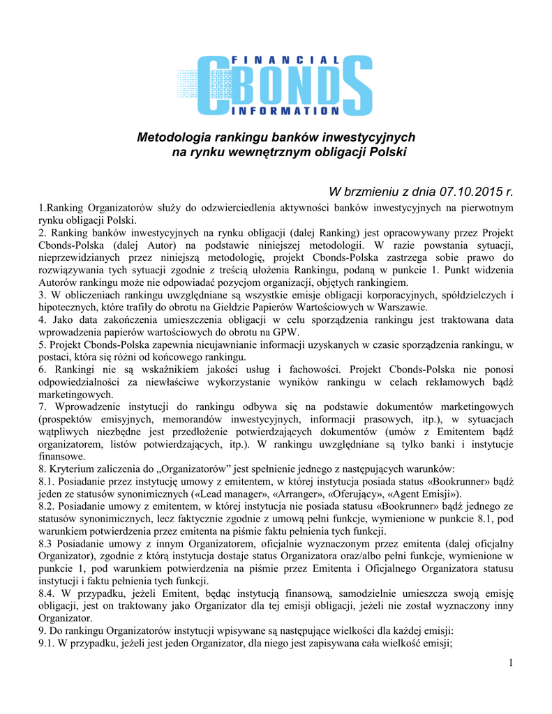 Metodologia rankingu banków inwestycyjnych na rynku wewnętrznym obligacji Polski W brzmieniu z dnia 07.10.2015 r. 1.Ranking Organizatorów służy do odzwierciedlenia aktywności banków inwestycyjnych na pierwotnym rynku obligacji Polski. 2. Ranking banków inwestycyjnych na rynku obligacji (dalej Ranking) jest opracowywany przez Projekt Cbonds-Polska (dalej Autor) na podstawie niniejszej metodologii. W razie powstania sytuacji, nieprzewidzianych przez niniejszą metodologię, projekt Cbonds-Polska zastrzega sobie prawo do rozwiązywania tych sytuacji zgodnie z treścią ułożenia Rankingu, podaną w punkcie 1. Punkt widzenia Autorów rankingu może nie odpowiadać pozycjom organizacji, objętych rankingiem. 3. W obliczeniach rankingu uwzględniane są wszystkie emisje obligacji korporacyjnych, spółdzielczych i hipotecznych, które trafiły do obrotu na Giełdzie Papierów Wartościowych w Warszawie. 4. Jako data zakończenia umieszczenia obligacji w celu sporządzenia rankingu jest traktowana data wprowadzenia papierów wartościowych do obrotu na GPW. 5. Projekt Cbonds-Polska zapewnia nieujawnianie informacji uzyskanych w czasie sporządzenia rankingu, w postaci, która się różni od końcowego rankingu. 6. Rankingi nie są wskaźnikiem jakości usług i fachowości. Projekt Cbonds-Polska nie ponosi odpowiedzialności za niewłaściwe wykorzystanie wyników rankingu w celach reklamowych bądź marketingowych. 7. Wprowadzenie instytucji do rankingu odbywa się na podstawie dokumentów marketingowych (prospektów emisyjnych, memorandów inwestycyjnych, informacji prasowych, itp.), w sytuacjach wątpliwych niezbędne jest przedłożenie potwierdzających dokumentów (umów z Emitentem bądź organizatorem, listów potwierdzających, itp.). W rankingu uwzględniane są tylko banki i instytucje finansowe. 8. Kryterium zaliczenia do „Organizatorów” jest spełnienie jednego z następujących warunków: 8.1. Posiadanie przez instytucję umowy z emitentem, w której instytucja posiada status «Bookrunner» bądź jeden ze statusów synonimicznych («Lead manager», «Arranger», «Oferujący», «Agent Emisji»). 8.2. Posiadanie umowy z emitentem, w której instytucja nie posiada statusu «Bookrunner» bądź jednego ze statusów synonimicznych, lecz faktycznie zgodnie z umową pełni funkcje, wymienione w punkcie 8.1, pod warunkiem potwierdzenia przez emitenta na piśmie faktu pełnienia tych funkcji. 8.3 Posiadanie umowy z innym Organizatorem, oficjalnie wyznaczonym przez emitenta (dalej oficjalny Organizator), zgodnie z którą instytucja dostaje status Organizatora oraz/albo pełni funkcje, wymienione w punkcie 1, pod warunkiem potwierdzenia na piśmie przez Emitenta i Oficjalnego Organizatora statusu instytucji i faktu pełnienia tych funkcji. 8.4. W przypadku, jeżeli Emitent, będąc instytucją finansową, samodzielnie umieszcza swoją emisję obligacji, jest on traktowany jako Organizator dla tej emisji obligacji, jeżeli nie został wyznaczony inny Organizator. 9. Do rankingu Organizatorów instytucji wpisywane są następujące wielkości dla każdej emisji: 9.1. W przypadku, jeżeli jest jeden Organizator, dla niego jest zapisywana cała wielkość emisji; 1 9.2. W przypadku, jeżeli jest kilku Organizatorów, wielkość emisji jest rozdzielana pomiędzy nich proporcjonalnie, jeżeli inne nie zostało uzgodnione za zgodą wzajemną Organizatorów, bądź w razie braku zgody wzajemnej Organizatorów, przez postanowienia umów lub innych porozumień między organizatorami i emitentem; 9.3. Autor rankingu nie publikuje danych o kwotach Organizatorów dla każdej emisji oraz korzysta z właściwej informacji tylko w celu sporządzenia rankingu. 10. Ranking jest sporządzany na podstawie wyników pierwszego kwartału, pierwszego półrocza, trzech kwartałów oraz roku. 11. Rankingi dostępne są pod adresem: http://www.pl.cbonds.info/rankings/. Osoby do kontaktu w sprawach dotyczących rankingu: Laszenko Siergiej, Kierownik projektu Cbonds.Info (Ukraina, Polska, WNP, kraje Bałtyckie) telefon/faks: + 38 (044) 468-64-34, [email protected] Wasilejw Kostiantyn, Partner, Kierownik departamentu Cbonds telefon/faks: (812) 336 9721, wewnętrzny 105. e-mail: [email protected] Cbonds-Polska – projekt grupy spółek Cbonds, odpowiedzialny za rynek obligacji i euroobligacji Polski. Grupa spółek Cbonds — agencja informacyjna, specjalizująca się w dziedzinie rynków finansowych. Grupa prowadzi działalność w Rosji i na Ukrainie w następujących obszarach: wsparcie i rozwój internetowych serwisów informacyjnych (Cbonds.Info oraz Investfunds), organizacja konferencji tematycznych i targów w obszarze rynków finansowych, działalność wydawnicza (magazyn Cbonds Review oraz coroczne informatory). 2