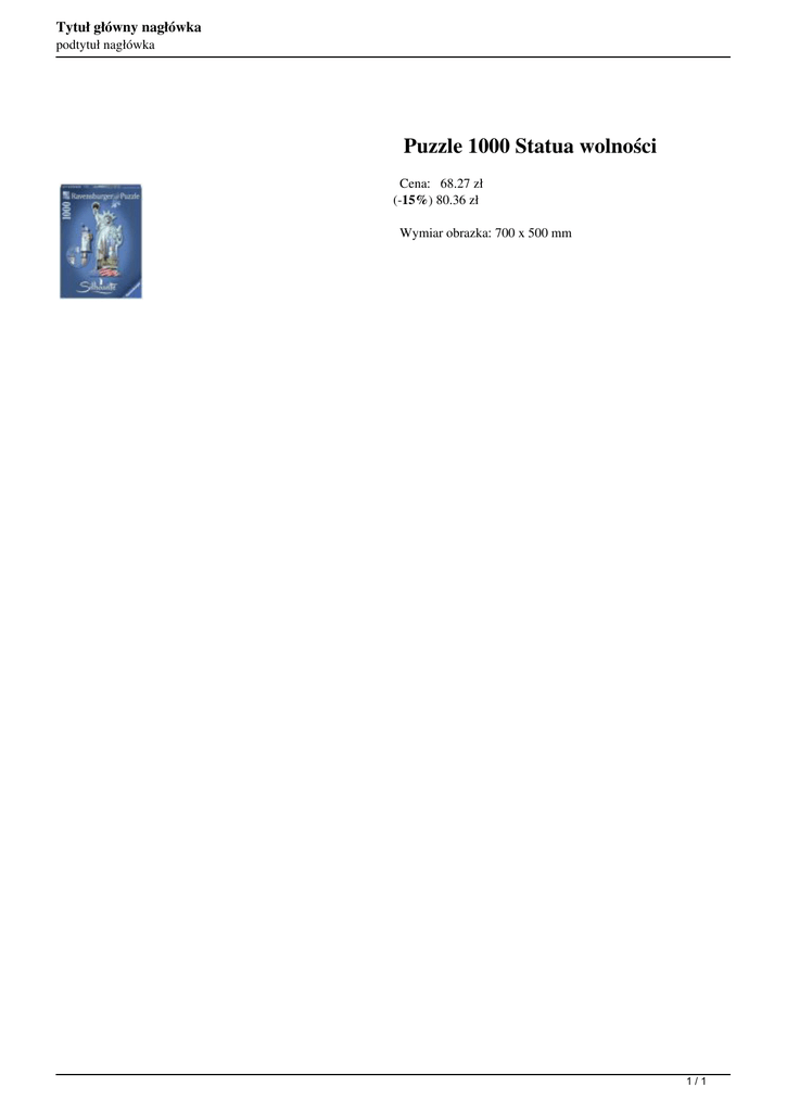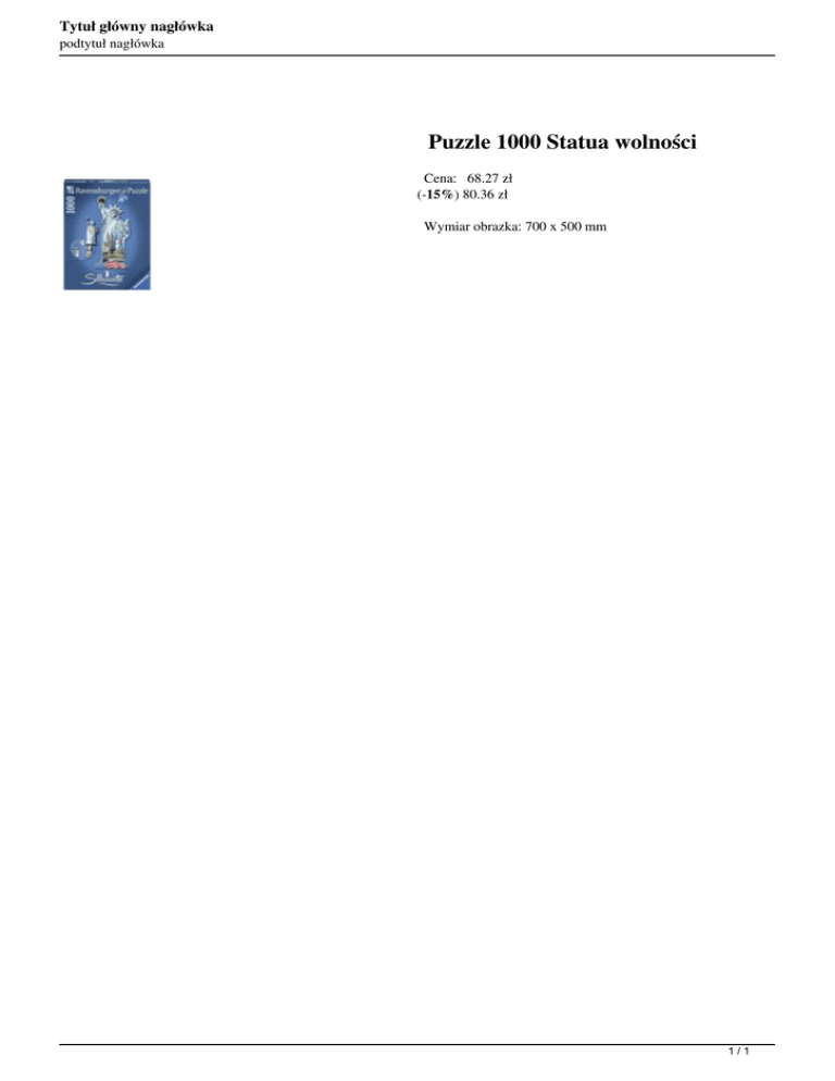Tytuł główny nagłówka podtytuł nagłówka Puzzle 1000 Statua wolności Cena: 68.27 zł (-15%) 80.36 zł Wymiar obrazka: 700 x 500 mm 1/1 Powered by TCPDF (www.tcpdf.org)