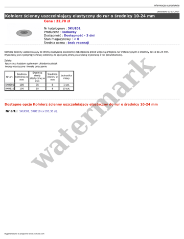 Informacje o produkcie Utworzono 03-03-2017 Kołnierz ścienny uszczelniający elastyczny do rur o średnicy 10-24 mm Cena : 22,70 zł Nr katalogowy : 5KUE01 Producent : Radaway Dostępność : Dostępność - 3 dni Stan magazynowy : < 0 Średnia ocena : brak recenzji Kołnierz ścienny uszczelniający ze strefą elastyczną skutecznie zabezpiecza przed wilgocią przejścia rur instalacyjnych o średnicy od 10 do 24 mm. Wykonany jest z polipropylenowej włókniny ze specjalną strefą elastyczną wykonaną z foli poliuretanowej. Średnica Średnica strefy Nr art. kołnierza w elastycznej w mm mm 5KUE01 100 35 5KUE10 100 35 er m ar k Zalety: łączy się z każdym systemem układania płytek tworzy elastyczne i trwałe połączenie Średnica otworu w mm Jednostka miary 8 1 szt. 8 10 szt. Dostępne opcje Kołnierz ścienny uszczelniający elastyczny do rur o średnicy 10-24 mm w at Nr art.: 5KUE01, 5KUE10 (+193,30 zł). Wygenerowano w programie www.oscGold.com