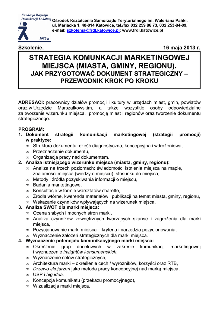 Ośrodek Kształcenia Samorządu Terytorialnego im. Waleriana Pańki, ul. Mariacka 1, 40-014 Katowice, tel./fax 032 259 86 73, 032 253-84-09, e-mail: [email protected]; www.frdl.katowice.pl Szkolenie, 16 maja 2013 r. STRATEGIA KOMUNKACJI MARKETINGOWEJ MIEJSCA (MIASTA, GMINY, REGIONU). JAK PRZYGOTOWAĆ DOKUMENT STRATEGICZNY – PRZEWODNIK KROK PO KROKU ADRESACI: pracownicy działów promocji i kultury w urzędach miast, gmin, powiatów oraz w Urzędzie Marszałkowskim, a także wszystkie osoby odpowiedzialne za tworzenie wizerunku miejsca, promocję miast i regionów oraz tworzenie dokumentu strategicznego. PROGRAM: 1. Dokument strategii komunikacji marketingowej (strategii promocji) w praktyce: • Struktura dokumentu: część diagnostyczna, koncepcyjna i wdrożeniowa, • Przeznaczenie dokumentu, • Organizacja pracy nad dokumentem. 2. Analiza istniejącego wizerunku miejsca (miasta, gminy, regionu): • Analiza na trzech poziomach: świadomości istnienia miejsca na mapie, znajomości miejsca (wiedzy o miejscu), stosunku do miejsca, • Metody i źródła pozyskiwania informacji o miejscu, • Badania marketingowe, • Konsultacje w formie warsztatów charette, • Źródła wtórne, kwerenda materiałów i publikacji na temat miasta, gminy, regionu, • Wskazanie czynników wpływających na wizerunek miejsca. 3. Analiza SWOT dla marki miejsca: • Ocena słabych i mocnych stron marki, • Analiza czynników zewnętrznych tworzących szanse i zagrożenia dla marki miejsca, • Pozycjonowanie marki miejsca – kryteria i narzędzia pozycjonowania, • Wyznaczenie założeń strategicznych dla marki miejsca. 4. Wyznaczenie potencjału komunikacyjnego marki miejsca: • Określenie grup docelowych w zakresie komunikacji marketingowej i wyznaczenie insightów konsumenckich, • Wyznaczenie celów strategicznych, • Architektura marki – określenie cech / wyróżników, korzyści oraz RTB, • Drzewo skojarzeń jako metoda pracy koncepcyjnej nad marką miejsca, • USP i big idea, • Koncepcja komunikatu (przekazu promocyjnego), • Wizualizacja marki miejsca. 5. Wdrożenie strategii promocji miasta, gminy, regionu: • Projekty promocyjne, • Instrumenty promocji i media, • Strategia mediowa – optymalizacja kampanii w mediach, • Wskaźniki mediowe i obliczanie statystyk kampanii (parametry zasięgowe i kosztowe), • Niestandardowe techniki i narzędzia promocyjne. 6. Część warsztatowa: • Warsztat kreatywny: korzystanie z metody drzewa skojarzeń, • Warsztat mediowy: obliczanie i interpretacja podstawowych wskaźników mediowych. Miejsce: Katowice, siedziba Ośrodka, ul. Mariacka 1 (II piętro). Termin: 16 maja 2013 r., godz. 10.00 – 15.00. Koszt: 299 zł netto, zwolnione z VAT w przypadku finansowania szkolenia ze środków publicznych. (cena obejmuje materiały szkoleniowe, lunch, zaświadczenie o ukończeniu szkolenia). RABAT 10% za każdą następną osobę zgłoszoną z tej samej instytucji. W przypadku pytań prosimy o kontakt z Barbarą tylki pod nr tel. 032/253-63-77, 259-86-73 nr wew.31 lub e-mailem: [email protected] Kartę zgłoszenia udziału prosimy przesłać mailem lub faxem do 13 maja 2013 r. --------------------------------------------------------------Karta zgłoszenia – kod szkolenia: 511/13/T Nazwa Nabywcy (dane do F. VAT):.................................................................................... ……………………………………………………………………………………………………… ulica, nr: .....................................miejscowość/kod pocztowy...............................………… NIP: ........................................................ Tel...................................................................... 1. ........................................................... ……………………………………………….……… imię i nazwisko, (wypełnić drukowanymi) wydział/stanowisko 2. ....................................................................................................................RABAT 10% imię i nazwisko, (wypełnić drukowanymi) wydział/stanowisko UWAGA! Oświadczam, że udział w szkoleniu jest dla uczestnika/ów kształceniem zawodowym finansowanym w całości lub co najmniej 70% ze środków publicznych (właściwe zaznaczyć) TAK / NIE …..……………………. Podpis UWAGA! Ilość miejsc ograniczona. O udziale w szkoleniu decyduje kolejność zgłoszeń. Zgłoszenie na szkolenie musi zostać potwierdzone przesłaniem do Ośrodka karty zgłoszenia. Brak pisemnej rezygnacji ze szkoleń najpóźniej na trzy dni przed terminem jest równoznaczny z obciążeniem Państwa należnością za te szkolenia. Należność należy płacić przelewem przed lub po szkoleniu (na przelewie prosimy podać nazwę szkolenia lub jego numer). NR RACHUNKU: BPH 68-10600076-0000321000197618