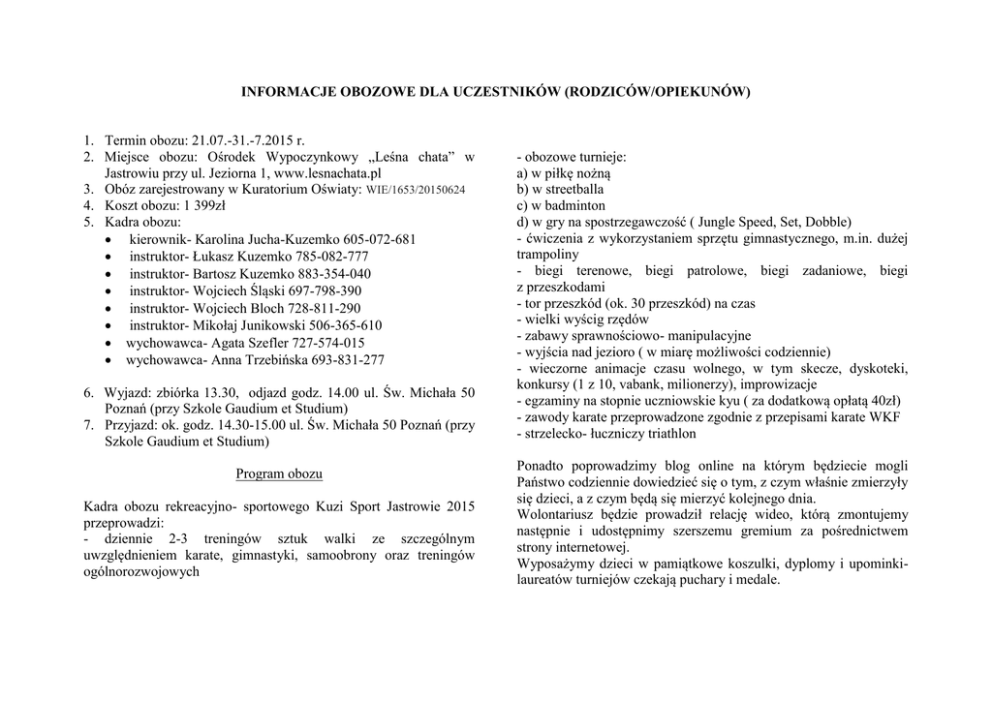 INFORMACJE OBOZOWE DLA UCZESTNIKÓW (RODZICÓW/OPIEKUNÓW) 1. Termin obozu: 21.07.-31.-7.2015 r. 2. Miejsce obozu: Ośrodek Wypoczynkowy „Leśna chata” w Jastrowiu przy ul. Jeziorna 1, www.lesnachata.pl 3. Obóz zarejestrowany w Kuratorium Oświaty: WIE/1653/20150624 4. Koszt obozu: 1 399zł 5. Kadra obozu: kierownik- Karolina Jucha-Kuzemko 605-072-681 instruktor- Łukasz Kuzemko 785-082-777 instruktor- Bartosz Kuzemko 883-354-040 instruktor- Wojciech Śląski 697-798-390 instruktor- Wojciech Bloch 728-811-290 instruktor- Mikołaj Junikowski 506-365-610 wychowawca- Agata Szefler 727-574-015 wychowawca- Anna Trzebińska 693-831-277 6. Wyjazd: zbiórka 13.30, odjazd godz. 14.00 ul. Św. Michała 50 Poznań (przy Szkole Gaudium et Studium) 7. Przyjazd: ok. godz. 14.30-15.00 ul. Św. Michała 50 Poznań (przy Szkole Gaudium et Studium) Program obozu Kadra obozu rekreacyjno- sportowego Kuzi Sport Jastrowie 2015 przeprowadzi: - dziennie 2-3 treningów sztuk walki ze szczególnym uwzględnieniem karate, gimnastyki, samoobrony oraz treningów ogólnorozwojowych - obozowe turnieje: a) w piłkę nożną b) w streetballa c) w badminton d) w gry na spostrzegawczość ( Jungle Speed, Set, Dobble) - ćwiczenia z wykorzystaniem sprzętu gimnastycznego, m.in. dużej trampoliny - biegi terenowe, biegi patrolowe, biegi zadaniowe, biegi z przeszkodami - tor przeszkód (ok. 30 przeszkód) na czas - wielki wyścig rzędów - zabawy sprawnościowo- manipulacyjne - wyjścia nad jezioro ( w miarę możliwości codziennie) - wieczorne animacje czasu wolnego, w tym skecze, dyskoteki, konkursy (1 z 10, vabank, milionerzy), improwizacje - egzaminy na stopnie uczniowskie kyu ( za dodatkową opłatą 40zł) - zawody karate przeprowadzone zgodnie z przepisami karate WKF - strzelecko- łuczniczy triathlon Ponadto poprowadzimy blog online na którym będziecie mogli Państwo codziennie dowiedzieć się o tym, z czym właśnie zmierzyły się dzieci, a z czym będą się mierzyć kolejnego dnia. Wolontariusz będzie prowadził relację wideo, którą zmontujemy następnie i udostępnimy szerszemu gremium za pośrednictwem strony internetowej. Wyposażymy dzieci w pamiątkowe koszulki, dyplomy i upominkilaureatów turniejów czekają puchary i medale.