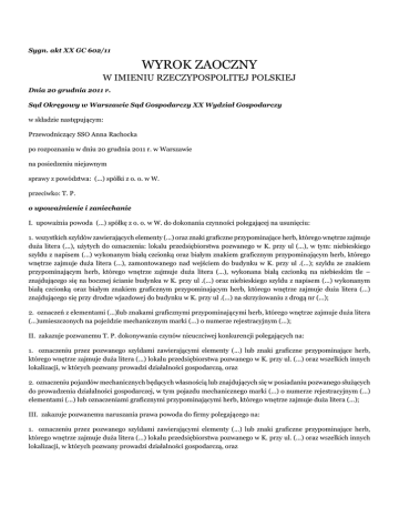 Sygn. akt XX GC 602/11 WYROK ZAOCZNY W IMIENIU RZECZYPOSPOLITEJ POLSKIEJ Dnia 20 grudnia 2011 r. Sąd Okręgowy w Warszawie Sąd Gospodarczy XX Wydział Gospodarczy w składzie następującym: Przewodniczący SSO Anna Rachocka po rozpoznaniu w dniu 20 grudnia 2011 r. w Warszawie na posiedzeniu niejawnym sprawy z powództwa: (...) spółki z o. o. w W. przeciwko: T. P. o upoważnienie i zaniechanie I. upoważnia powoda (...) spółkę z o. o. w W. do dokonania czynności polegającej na usunięciu: 1. wszystkich szyldów zawierających elementy (...) oraz znaki graficzne przypominające herb, którego wnętrze zajmuje duża litera (...), użytych do oznaczenia: lokalu przedsiębiorstwa pozwanego w K. przy ul (...), w tym: niebieskiego szyldu z napisem (...) wykonanym białą czcionką oraz białym znakiem graficznym przypominającym herb, którego wnętrze zajmuje duża litera (...), zamontowanego nad wejściem do budynku w K. przy ul .(...); szyldu ze znakiem przypominającym herb, którego wnętrze zajmuje duża litera (...), wykonana białą czcionką na niebieskim tle – znajdującego się na bocznej ścianie budynku w K. przy ul .(...) oraz niebieskiego szyldu z napisem (...) wykonanym białą czcionką oraz białym znakiem graficznym przypominającym herb, którego wnętrze zajmuje duża litera (...) znajdującego się przy drodze wjazdowej do budynku w K. przy ul .(...) na skrzyżowaniu z drogą nr (...); 2. oznaczeń z elementami (...)lub znakami graficznymi przypominającymi herb, którego wnętrze zajmuje duża litera (...)umieszczonych na pojeździe mechanicznym marki (...) o numerze rejestracyjnym (...); II. zakazuje pozwanemu T. P. dokonywania czynów nieuczciwej konkurencji polegających na: 1. oznaczeniu przez pozwanego szyldami zawierającymi elementy (...) lub znaki graficzne przypominające herb, którego wnętrze zajmuje duża litera (...) lokalu przedsiębiorstwa pozwanego w K. przy ul. (...) oraz wszelkich innych lokalizacji, w których pozwany prowadzi działalności gospodarczą, oraz 2. oznaczeniu pojazdów mechanicznych będących własnością lub znajdujących się w posiadaniu pozwanego służących do prowadzenia działalności gospodarczej, w tym pojazdu mechanicznego marki (...) o numerze rejestracyjnym (...) elementami (...) lub oznaczeniami graficznymi przypominającymi herb, którego wnętrze zajmuje duża litera (...); III. zakazuje pozwanemu naruszania prawa powoda do firmy polegającego na: 1. oznaczeniu przez pozwanego szyldami zawierającymi elementy (...) lub znaki graficzne przypominające herb, którego wnętrze zajmuje duża litera (...) lokalu przedsiębiorstwa pozwanego w K. przy ul. (...) oraz wszelkich innych lokalizacji, w których pozwany prowadzi działalności gospodarczą, oraz 2. oznaczeniu pojazdów mechanicznych będących własnością lub znajdujących się w posiadaniu pozwanego służących do prowadzenia działalności gospodarczej, w tym pojazdu mechanicznego marki (...) o numerze rejestracyjnym (...) elementami (...) lub oznaczeniami graficznymi przypominającymi herb, którego wnętrze zajmuje duża litera (...); IV. nakazuje pozwanemu, w terminie 14 dni od dnia uprawomocnienia się wyroku, złożenia publicznie oświadczenia w czasopismach (...) lub (...) w formacie co najmniej pół strony, rozmiar czcionki 12 pt., o następującej treści: „Ja, T. P., prowadzący działalność gospodarczą pod firmą Przedsiębiorstwo (...) w K., niniejszym przepraszam spółkę (...) sp. z o.o. z siedzibą w W. za naruszenia praw wyłącznych tej spółki, w tym prawa do firmy (...) sp. z o.o. oraz popełnienie czynów nieuczciwej konkurencji. Dokonane przez mnie naruszenia polegały na oznaczeniu lokalu mojego przedsiębiorstwa w K. przy ul. (...) szyldami zawierającymi nazwę (...) oraz oznaczenie graficzne bez zgody (...) sp. z o.o.” oraz upoważnia powoda do opublikowania powyższego oświadczenia w jednym ze wskazanych powyżej czasopism, na koszt pozwanego w przypadku gdyby pozwany nie opublikował go w powyższym terminie; I. nakazuje pozwanemu wydanie powodowi w terminie 7 dni od uprawomocnienia się wyroku wszystkich szyldów zawierających elementy (...) lub oznaczenia graficzne przypominające herb, którego wnętrze zajmuje duża litera (...) znajdujące się w posiadaniu pozwanego w dacie złożenia pozwu, w tym niebieskiego szyldu z napisem (...) wykonanym białą czcionką oraz białym znakiem graficznym przypominającym herb, którego wnętrze zajmuje duża litera (...), szyldu ze znakiem graficznym przypominającym herb, którego wnętrze zajmuje duża litera (...) wykonana białą czcionką na niebieskim tle oraz niebieskiego szyldu z napisem (...) wykonanym biała czcionką oraz białym znakiem graficznym przypominającym herb, którego wnętrze zajmuje duża litera (...); II. zasądza od pozwanego na rzecz powoda kwotę 10.117,00 (dziesięć tysięcy sto siedemnaście) złotych tytułem zwrotu kosztów procesu, w tym kwotę 3.600,00 (trzy tysiące sześćset) złotych tytułem kosztów zastępstwa procesowego; III. wyrokowi nadaje rygor natychmiastowej wykonalności. SSO Anna Rachocka (...)
